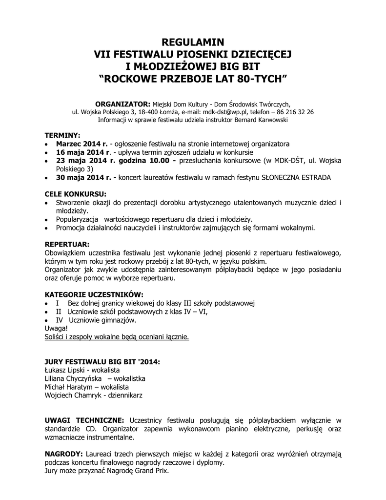 REGULAMIN VII FESTIWALU PIOSENKI DZIECIĘCEJ I MŁODZIEŻOWEJ BIG BIT “ROCKOWE PRZEBOJE LAT 80-TYCH” ORGANIZATOR: Miejski Dom Kultury - Dom Środowisk Twórczych, ul. Wojska Polskiego 3, 18-400 Łomża, e-mail: [email protected], telefon – 86 216 32 26 Informacji w sprawie festiwalu udziela instruktor Bernard Karwowski TERMINY: Marzec 2014 r. - ogłoszenie festiwalu na stronie internetowej organizatora 16 maja 2014 r. - upływa termin zgłoszeń udziału w konkursie 23 maja 2014 r. godzina 10.00 - przesłuchania konkursowe (w MDK-DŚT, ul. Wojska Polskiego 3) 30 maja 2014 r. - koncert laureatów festiwalu w ramach festynu SŁONECZNA ESTRADA CELE KONKURSU: Stworzenie okazji do prezentacji dorobku artystycznego utalentowanych muzycznie dzieci i młodzieży. Popularyzacja wartościowego repertuaru dla dzieci i młodzieży. Promocja działalności nauczycieli i instruktorów zajmujących się formami wokalnymi. REPERTUAR: Obowiązkiem uczestnika festiwalu jest wykonanie jednej piosenki z repertuaru festiwalowego, którym w tym roku jest rockowy przebój z lat 80-tych, w języku polskim. Organizator jak zwykle udostępnia zainteresowanym półplaybacki będące w jego posiadaniu oraz oferuje pomoc w wyborze repertuaru. KATEGORIE UCZESTNIKÓW: I Bez dolnej granicy wiekowej do klasy III szkoły podstawowej II Uczniowie szkół podstawowych z klas IV – VI, IV Uczniowie gimnazjów. Uwaga! Soliści i zespoły wokalne będą oceniani łącznie. JURY FESTIWALU BIG BIT '2014: Łukasz Lipski - wokalista Liliana Chyczyńska – wokalistka Michał Haratym – wokalista Wojciech Chamryk - dziennikarz UWAGI TECHNICZNE: Uczestnicy festiwalu posługują się półplaybackiem wyłącznie w standardzie CD. Organizator zapewnia wykonawcom pianino elektryczne, perkusję oraz wzmacniacze instrumentalne. NAGRODY: Laureaci trzech pierwszych miejsc w każdej z kategorii oraz wyróżnień otrzymają podczas koncertu finałowego nagrody rzeczowe i dyplomy. Jury może przyznać Nagrodę Grand Prix.