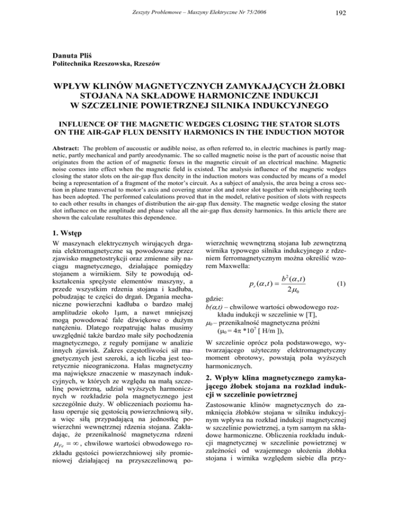 Zeszyty Problemowe – Maszyny Elektryczne Nr 75/2006 192 Danuta Pliś Politechnika Rzeszowska, Rzeszów WPŁYW KLINÓW MAGNETYCZNYCH ZAMYKAJĄCYCH ŻŁOBKI STOJANA NA SKŁADOWE HARMONICZNE INDUKCJI W SZCZELINIE POWIETRZNEJ SILNIKA INDUKCYJNEGO INFLUENCE OF THE MAGNETIC WEDGES CLOSING THE STATOR SLOTS ON THE AIR-GAP FLUX DENSITY HARMONICS IN THE INDUCTION MOTOR Abstract: The problem of aucoustic or audible noise, as often referred to, in electric machines is partly magnetic, partly mechanical and partly areodynamic. The so called magnetic noise is the part of acoustic noise that originates from the action of of magnetic forses in the magnetic circuit of an electrical machine. Magnetic noise comes into effect when the magnetic field is existed. The analysis influence of the magnetic wedges closing the stator slots on the air-gap flux dencity in the induction motors was conducted by means of a model being a representation of a fragment of the motor’s circuit. As a subject of analysis, the area being a cross section in plane transversal to motor’s axis and covering stator slot and rotor slot together with neighboring teeth has been adopted. The performed calculations proved that in the model, relative position of slots with respects to each other results in changes of distribution the air-gap flux density. The magnetic wedge closing the stator slot influence on the amplitude and phase value all the air-gap flux density harmonics. In this article there are shown the calculate resultates this dependence. 1. Wstęp W maszynach elektrycznych wirujących drgania elektromagnetyczne są powodowane przez zjawisko magnetostrykcji oraz zmienne siły naciągu magnetycznego, działające pomiędzy stojanem a wirnikiem. Siły te powodują odkształcenia sprężyste elementów maszyny, a przede wszystkim rdzenia stojana i kadłuba, pobudzając te części do drgań. Drgania mechaniczne powierzchni kadłuba o bardzo małej amplitudzie około 1µm, a nawet mniejszej mogą powodować fale dźwiękowe o dużym natężeniu. Dlatego rozpatrując hałas musimy uwzględnić także bardzo małe siły pochodzenia magnetycznego, z reguły pomijane w analizie innych zjawisk. Zakres częstotliwości sił magnetycznych jest szeroki, a ich liczba jest teoretycznie nieograniczona. Hałas magnetyczny ma największe znaczenie w maszynach indukcyjnych, w których ze względu na małą szczelinę powietrzną, udział wyższych harmonicznych w rozkładzie pola magnetycznego jest szczególnie duży. W obliczeniach poziomu hałasu operuje się gęstością powierzchniową siły, a więc siłą przypadającą na jednostkę powierzchni wewnętrznej rdzenia stojana. Zakładając, że przenikalność magnetyczna rdzeni µ Fe = ∞ , chwilowe wartości obwodowego rozkładu gęstości powierzchniowej siły promieniowej działającej na przyszczelinową po- wierzchnię wewnętrzną stojana lub zewnętrzną wirnika typowego silnika indukcyjnego z rdzeniem ferromagnetycznym można określić wzorem Maxwella: pr (α , t ) = b 2 (α , t ) 2µ0 (1) gdzie: b(α,t) – chwilowe wartości obwodowego rozkładu indukcji w szczelinie w [T], µ0 – przenikalność magnetyczna próżni (µ0 = 4π *107 [ H/m ]), W szczelinie oprócz pola podstawowego, wytwarzającego użyteczny elektromagnetyczny moment obrotowy, powstają pola wyższych harmonicznych. 2. Wpływ klina magnetycznego zamykającego żłobek stojana na rozkład indukcji w szczelinie powietrznej Zastosowanie klinów magnetycznych do zamknięcia żłobków stojana w silniku indukcyjnym wpływa na rozkład indukcji magnetycznej w szczelinie powietrznej, a tym samym na składowe harmoniczne. Obliczenia rozkładu indukcji magnetycznej w szczelinie powietrznej w zależności od wzajemnego ułożenia żłobka stojana i wirnika względem siebie dla przy- Zeszyty Problemowe – Maszyny Elektryczne Nr 75/2006 0,7 0,6 0,5 indukcja [T] padku zamknięcia żłobka stojana klinem niemagnetycznym i klinem magnetycznym o względnej przenikalności magnetycznej µrk=5, wykonano w oparciu o model odpowiadający układowi jednego żłobka silnika indukcyjnego trójfazowego SZJC EX 6 kV 320 kW. Do analizy przyjęto obszar będący przekrojem w płaszczyźnie poprzecznej do osi silnika obejmujący żłobek stojana oraz żłobek wirnika z sąsiadującymi zębami [6]. W celu uproszczenia geometrii modelu oraz ze względu na stacjonarność pola magnetycznego podczas analizy przyjęto następujące założenie upraszczające: - kontury wirnika i stojana aproksymowano liniami prostymi, - analizowano żłobki prostokątne zarówno w stojanie, jak i wirniku, - rozpatrywano wzajemny układ jednego żłobka stojana i jednego żłobka wirnika. Rezultaty obliczeń rozkładu indukcji magnetycznej w szczelinie powietrznej przedstawiono na rysunkach 1 a-c. Z wykonanych obliczeń wynika, że zastosowanie klina magnetycznego wpływa korzystnie na rozkład indukcji w szczelinie powietrznej powodując jej wygładzenie. Szczególnie duży wpływ daje się zauważyć w przypadku, gdy nad żłobkiem zamkniętym klinem magnetycznym znajduje się żelazo. Wzrost indukcji przy zamknięciu żłobka klinem magnetycznym o względnej przenikalności magnetycznej µrk=5, wynosi około 0,02 T w stosunku do wartości indukcji z klinem niemagnetycznym. 0,4 0,3 0,2 0,1 0 0 0,01 0,02 0,03 0,04 0,05 0,06 x [m] klin niemagnetyczny klin magnetyczny Rys.1b. Rozkład indukcji w szczelinie powietrznej modelu dla przypadku przesunięcia żłobka wirnika względem żłobka stojana o ½ szerokości żłobka 0,7 0,6 0,5 indukcja [T] 192 0,4 0,3 0,2 0,1 0 0 0,7 0,01 0,02 0,03 0,04 0,05 0,06 x [m] 0,6 klin niemagnetyczny indukcja [T] 0,5 klin magnetyczny 0,4 Rys.1c. Rozkład indukcji w szczelinie powietrznej dla przypadku przesunięcia żłobka wirnika względem żłobka stojana o całą szerokość żłobka 0,3 0,2 0,1 0 0 0,01 0,02 0,03 0,04 0,05 0,06 x [m] klin niemagnetyczny klin magnetyczny Rys.1a. Rozkład indukcji w szczelinie powietrznej