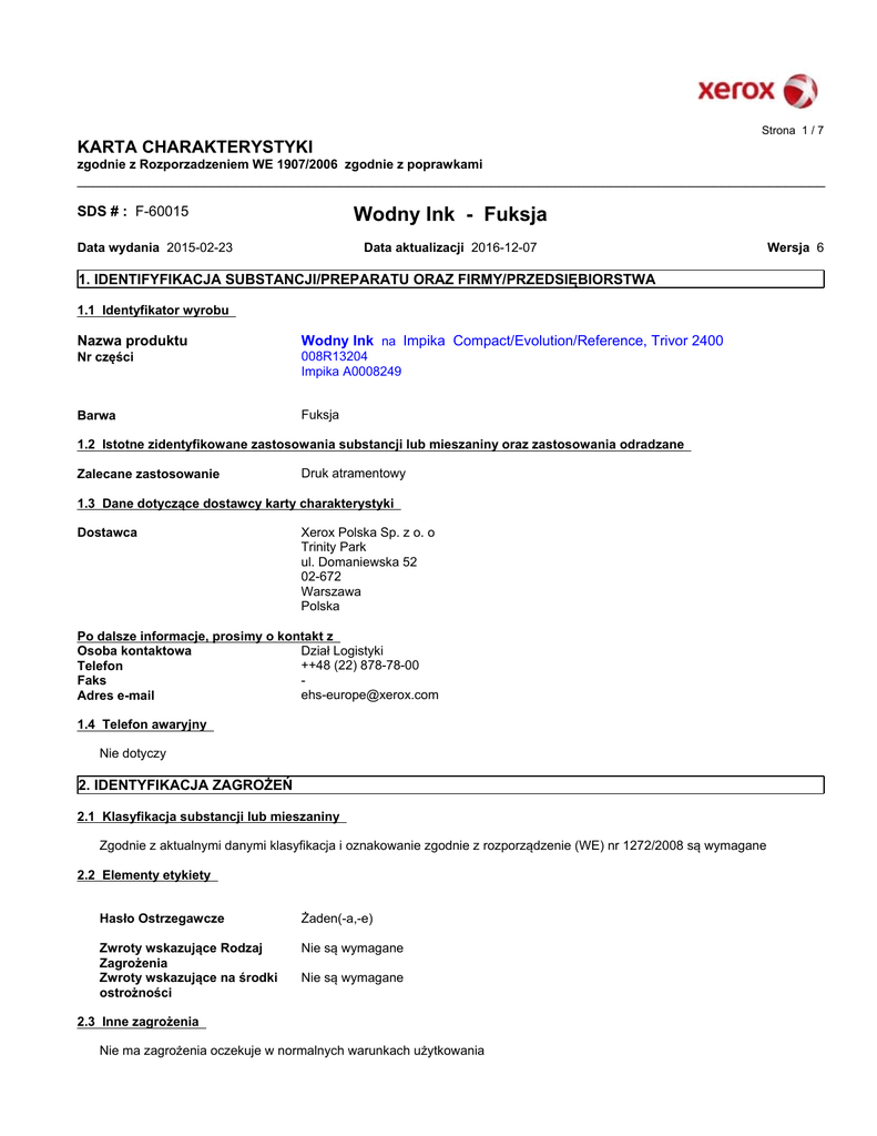 Strona 1 / 7 KARTA CHARAKTERYSTYKI zgodnie z Rozporzadzeniem WE 1907/2006 zgodnie z poprawkami ______________________________________________________________________________________________ SDS # : F-60015 Wodny Ink - Fuksja Data wydania 2015-02-23 Data aktualizacji 2016-12-07 Wersja 6 1.I DENTI FYFI KACJASUBSTANCJI / PREPARATUORAZFI RMY/ PRZEDSI ĘBI ORSTWA 1.1 Identyfikator wyrobu Nazwa produktu Wodny Ink na Impika Compact/Evolution/Reference, Trivor 2400 Nrczęści 008R13204 Impika A0008249 Barwa Fuksja 1.2 Istotne zidentyfikowane zastosowania substancji lub mieszaniny oraz zastosowania odradzane Zalecane zastosowanie Druk atramentowy 1.3 Danedot yczącedost awcykar t ychar akt er yst yki Dostawca Xerox Polska Sp. z o. o Trinity Park ul. Domaniewska 52 02-672 Warszawa Polska Po dalsze informacje, prosimy o kontakt z Dzi ałLogi st yki Osoba kontaktowa ++48 (22) 878-78-00 Telefon Faks [email protected] Adres e-mail 1.4 Telefon awaryjny Nie dotyczy 2.I DENTYFI KACJAZAGROŻEŃ 2.1 Klasyfikacja substancji lub mieszaniny Zgodni ezakt ual nymidanymikl asyf i kacj aioznakowani ezgodni ezr ozpor ządzeni e( WE)nr1272/ 2008sąwymagane 2.2 Elementy etykiety Hasł oOst r zegawcze Żaden( a, e) Zwr ot ywskazuj ąceRodzaj Zagr ożeni a Zwr ot ywskazuj ącenaśr odki ost r ożności Ni esąwymagane Ni esąwymagane 2.3 I nnezagr ożeni a Ni emazagr ożeni aoczekuj ewnor mal nychwar unkachużyt kowani a Strona 2 / 7 ______________________________________________________________________________________________ SDS # : F-60015 Wodny Ink - Fuksja Data wydania 2015-02-23 Data aktualizacji 2016-12-07 Wersja 6 ______________________________________________________________________________________________ 3.1 Mieszaniny Nazwa chemiczna Ciezar % Woda Glicerolu Magenta pigmentu 50-65 20-30 1-10 2-pirolidon Glikol trietylenowy eteru monobutylowego 1-10 <3 Nr. CAS 7732-18-5 56-81-5 Prawnie zast zeżony( a, e) 616-45-5 143-22-6 Nr WE 231-791-2 Wyszczególniono Wyszczególniono 210-483-1 205-592-6 Klasyfikacja (rozporzadzeniu (WE) 1272/2008) Żaden( a, e) Żaden( a, e) Żaden( a, e) Numer rejestracyjny REACH 01-2119456804-33-00 08 Żaden( a, e) Eye Dam. 1 4.ŚRODKIPI ERWSZEJPOMOCY 4.1 Opi sśr odków pi er wszejpomocy Wskazówka ogólna W PRZYPADKU POWAZNYCH I TRWAJACYCH ZABURZEN WEZWAC LEKARZA LUB POGOTOWIE. Kontakt z oczyma Dokł adni epr zepł ukaćdużąi l ości ąwody,t akżepodpowi ekami ,Jeśl ipodr ażni eni eoczu ut r zymuj esi ę,skonsul t owaćsi ęzespecj al i st ą Zmyc ciepla woda z mydlem Pr zeni eśćnaświ eżepowi et r ze,Jeśl iobj awyni eust ępuj ą,wezwaćl ekar za Obmycust awoda, anast epni ewypi cduzai l oscwody,W r azi ekoni ecznościskonsul t ować si ęzl ekar zem Kont aktzeskór ą Wdychanie Spożyci e 4.2 Naj ważni ej szeobj awyidzi ał ani a,zar ównoost r eiopóźni one Toksycznośćost r a Oczy Skóra Wdychanie Spożyci e Dzi ał ani epr zewl ekł e Glówne objawy Kont aktzoczymamożepowodowaćpodr ażni eni e Możespowodowaćpodr ażni eni e Możedzi ał aćdr ażni ąconadr ogioddechowe Ni espożywać Możepowodowaćpodr ażni eni eoczuiskór y 4.3 Wskazanie natychmiastowej opieki lekarskiej i potrzebnego specjalnego traktowania Uwagi dla lekarza Leczyćobj awowo 5.POSTĘPOWANI EW PRZYPADKUPOŻARU 5.1 Śr odkigaśni cze Wł aści weśr odkigaśni cze: Rozpylona woda, Piana, Dwutlenek wegla (CO2) Ni ewł aści weśr odkigaśni cze Ni est osowaćst ał egost r umi eni awody,poni eważmożet ospowodowaćr ozpr oszeni ei r ozpr zest r zeni eni esi ęogni a 5.2 Szczegól nezagr ożeni azwi ązanezsubst ancj ąl ubmi eszani ną Strona 3 / 7 ______________________________________________________________________________________________ SDS # : F-60015 Wodny Ink - Fuksja Data wydania 2015-02-23 Data aktualizacji 2016-12-07 Wersja 6 ______________________________________________________________________________________________ Brak szczególnych 5.3 Specj al neczynnościochr onnepr zeznaczonedl ast r ażaków St osowaćni ezal eżnyapar atoddechowyor azodzi eżochr onną. Inne informacje Wł aści wościł at wopal ne Temper at ur azapł onu Niebezpieczne produkty spalania Niepalny > 93.33 °C Brak danych / > 199.99 °F 6.POSTĘPOWANI EW PRZYPADKUNI EZAMI ERZONEGO UWOLNI ENI ADO ŚRODOWI SKA 6.1 I ndywi dual neśr odkiost r ożności ,wyposażeni eochr onneipr ocedur yw syt uacj achawar yj nych Uni kaćzani eczyszczeni aoczu 6.2 Śr odkiost r ożnościw zakr esi eochr onyśr odowi ska Ni edopuści ćabymat er i ałskazi łwodygr unt owe 6.3 Met odyimat er i ał yzapobi egaj ącer ozpr zest r zeni ani usi ęskażeni aisł użącedousuwani askażeni a Absor bowaćoboj ęt nym mat er i ał em absor buj ącym 6.4 Odniesienia do innych sekcji Żaden( a, e) 7.POSTĘPOWANI EZSUBSTANCJAMIIMI ESZANI NAMIORAZI CHMAGAZYNOWANI E 7.1 Śr odkiost r ożnościdot yczącebezpi ecznegopost ępowani a Post ępowaćzgodni ezogól ni epr zyj ęt ymizasadamiBHP,Zapewni ćodpowi edni ąwent yl acj ę,Zapobi egacf or mowani usi e oparów, mgiel lub aerozoli 7.2 War unkibezpi ecznegomagazynowani a,ł ączni ezi nf or macj amidot yczącymiwszel ki chwzaj emnychni ezgodności Tr zymaćpoj emni kiszczel ni ezamkni ęt ewchł odnym,dobr zewent yl owanym mi ej scu,Chr oni ćpr zeddzi ećmi 7.3 Specyficzne zastosowania konsumenckie Druk atramentowy 8.KONTROLANARAŻENI A/ ŚRODKIOCHRONYI NDYWI DUALNEJ 8.1 Parametry kontrolne War t ościgr ani cznenar ażeni a Li mi t yekspozycj iokr eśl onegokr aj upat r zsekcj a16. Strona 4 / 7 ______________________________________________________________________________________________ SDS # : F-60015 Wodny Ink - Fuksja Data wydania 2015-02-23 Data aktualizacji 2016-12-07 Wersja 6 ______________________________________________________________________________________________ 8.2 Kont r ol anar ażeni a Srodki techniczne Zapewni ćodpowi edni ąwent yl acj ę,szczegól ni ewmi ej scachzamkni ęt ych 8.3 Indywidualne srodki ochrony, takie jak osobiste wyposazenie ochronne Ochrona dróg 