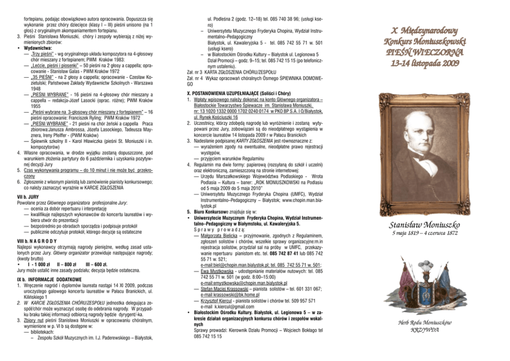 3. • 4. 5. 6. fortepianu, podając obowiązkowo autora opracowania. Dopuszcza się wykonanie przez chóry dziecięce (klasy I – III) pieśni unisono (na 1 głos) z oryginalnym akompaniamentem fortepianu. Pieśni Stanisława Moniuszki, chóry i zespoły wybierają z niżej wymienionych zbiorów: Wydawnictwa: —— „Trzy pieśni” - wg oryginalnego układu kompozytora na 4-głosowy chór mieszany z fortepianem; PWM Kraków 1983: —— „Lećcie, pieśni i piosenki” – 50 pieśni na 2 głosy a cappella; opracowanie - Stanisław Galas - PWM Kraków 1972 —— „35 PIEŚNI” - na 2 głosy a cappella; opracowanie - Czesław Kozietulski; Państwowe Zakłady Wydawnictw Szkolnych - Warszawa 1948 —— „PIEŚNI WYBRANE” - 16 pieśni na 4-głosowy chór mieszany a cappella – redakcja-Józef Lasocki (oprac. różne); PWM Kraków 1955 —— „Pieśni wybrane na 3-głosowy chór mieszany z fortepianem” – 16 pieśni opracowanie: Franciszek Ryling; PWM Kraków 1972 —— „PIEŚNI WYBRANE” - 21 pieśni na chór żeński a cappella Praca zbiorowa:Janusza Ambrossa, Józefa Lasockiego, Tadeusza Mayznera, Ireny Pfeiffer - (PWM Kraków) —— Śpiewnik szkolny II - Karol Hławiczka (pieśni St. Moniuszki i in. kompozytorów) Własne opracowania, w drodze wyjątku zostaną dopuszczone, pod warunkiem złożenia partytury do 6 października i uzyskania pozytywnej decyzji Jury Czas wykonywania programu – do 10 minut i nie może być przekroczony Zgłoszenie z własnym pianistą lub zamówienie pianisty konkursowego; co należy zaznaczyć wyraźnie w KARCIE ZGŁOSZENIA VII b. JURY Powołane przez Głównego organizatora profesjonalne Jury: —— ocenia za dobór repertuaru i interpretację —— kwalifikuje najlepszych wykonawców do koncertu laureatów i wybiera utwór do prezentacji —— bezpośrednio po obradach sporządza i podpisuje protokół —— publicznie odczytuje protokół, którego decyzje są ostateczne VIII b. N A G R O D Y Najlepsi wykonawcy otrzymają nagrody pieniężne, według zasad ustalonych przez Jury. Główny organizator przewiduje następujące nagrody; (kwoty brutto) • I - 1 000 zł II – 800 zł III – 600 zł. Jury może ustalić inne zasady podziału; decyzja będzie ostateczna. IX b. INFORMACJE DODATKOWE 1. Wręczenie nagród i dyplomów laureata nastąpi 14 XI 2009, podczas uroczystego galowego koncertu laureatów w Pałacu Branickich, ul. Kilińskiego 1 2. W KARCIE ZGŁOSZENIA CHÓRU/ZESPOŁU jednostka delegująca zespół/chór może wyznaczyć osobę do odebrania nagrody. W przypadku braku takiej informacji odbiorcą nagrody będzie dyrygent/-ka. 3. Zbiory nut pieśni Stanisława Moniuszki w opracowaniu chóralnym, wymienione w p. VI b są dostępne w: —— bibliotekach: –– Zespołu Szkół Muzycznych im. I.J. Paderewskiego – Białystok, ul. Podleśna 2 (godz. 12–18) tel. 085 740 38 96; (usługi ksero) –– Uniwersytetu Muzycznego Fryderyka Chopina, Wydział Instrumentalno–Pedagogiczny Białystok, ul. Kawaleryjska 5 - tel. 085 742 55 71 w. 501 (usługi ksero) –– w Białostockim Ośrodku Kultury – Białystok ul. Legionowa 5 Dział Promocji – godz. 9–15; tel. 085 742 15 15 (po telefonicznym ustaleniu). Zał. nr 3 KARTA ZGŁOSZENIA CHÓRU/ZESPOŁU Zał. nr 4 Wykaz opracowań chóralnych Ósmego ŚPIEWNIKA DOMOWEGO X. POSTANOWIENIA UZUPEŁNIAJĄCE (Soliści i Chóry) 1. Wpłaty wpisowego należy dokonać na konto Głównego organizatora – Białostockie Towarzystwo Śpiewacze im. Stanisława Moniuszki, nr: 13 1020 1332 0000 1702 0240 0174 w PKO BP S.A. I O/Białystok, ul. Rynek Kościuszki 16 2. Uczestnicy, którzy zdobędą nagrodę lub wyróżnienie i zostaną wytypowani przez Jury, zobowiązani są do nieodpłatnego wystąpienia w koncercie laureatów 14 listopada 2009 r w Pałacu Branickich 3. Nadesłanie podpisanej KARTY ZGŁOSZENIA jest równoznaczne z: —— wyrażeniem zgody na ewentualne, nieodpłatne prawo rejestracji występów, —— przyjęciem warunków Regulaminu 4. Regulamin ma dwie formy: papierową (rozsyłaną do szkół i uczelni) oraz elektroniczną, zamieszczoną na stronie internetowej: —— Urzędu Marszałkowskiego Województwa Podlaskiego - Wrota Podlasia – Kultura – baner: „ROK MONIUSZKOWSKI na Podlasiu od 5 maja 2009 do 5 maja 2010” —— Uniwersytetu Muzycznego Fryderyka Chopina (UMFC), Wydział Instrumentalno–Pedagogiczny – Białystok; www.chopin.man.bialystok.pl 5. Biuro Konkursowe znajduje się w: • Uniwersytecie Muzycznym Fryderyka Chopina, Wydział Instrumentalno–Pedagogiczny w Białymstoku, ul. Kawaleryjska 5. S p r a w y p r o w a d z ą: —— Małgorzata Bielicka – przyjmowanie, zgodnych z Regulaminem, zgłoszeń solistów i chórów, wszelkie sprawy organizacyjne:m.in rejestracja solistów, przydział sal na próby w UMFC, przekazywanie repertuaru pianistom etc. tel. 085 742 87 41 lub 085 742 55 71 w. 521; e-mail:[email protected]; tel. 085 742 55 71 w. 501; —— Ewa Mystkowska - udostępnianie materiałów nutowych: tel. 085 742 55 71 w. 501 (w godz. 8:00–15:00) e-mail:[email protected] —— Stefan Maciej Krassowski – pianista solistów – tel. 601 331 067; e-mail [email protected] —— Krzysztof Kiercul - pianista solistów i chórów tel. 509 957 571 e-mail [email protected] • Białostockim Ośrodku Kultury. Białystok, ul. Legionowa 5 – w zakresie działań organizacyjnych konkursu chórów i zespołów wokalnych Sprawy prowadzi: Kierownik Działu Promocji – Wojciech Bokłago tel 085 742 15 15 X Międzynarodowy Konkurs Moniuszkowski PIEŚŃ WIECZORNA 13-14 listopada 2009 Stanisław Moniuszko 5 maja 1819 – 4 czerwca 1872 Herb Rodu Moniuszków KRZYWDA REGULAMIN X KONKURSU MONIUSZKOWSKIEGO „PIEŚŃ WIECZORNA” I. Konkurs odbywa się w ramach „ MONIUSZKOWSKIEGO FESTIWALU PODLASIA”, organizowanego przez Białostockie Towarzystwo Śpiewacze im. STANISŁAWA MONIUSZKI II. CELE 1. Pielęgnowanie polskiej kultury narodowej 2. Propa