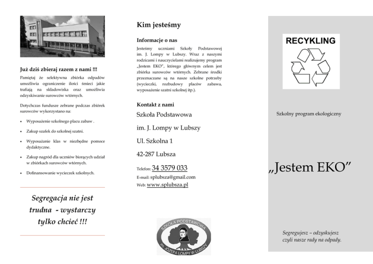 Kim jesteśmy Informacje o nas Już dziś zbieraj razem z nami !!! Pamiętaj że selektywna zbiórka odpadów umożliwia ograniczenie ilości śmieci jakie trafiają na składowiska oraz umożliwia odzyskiwanie surowców wtórnych. Dotychczas fundusze zebrane podczas zbiórek surowców wykorzystano na: Wyposażenie szkolnego placu zabaw . Zakup szafek do szkolnej szatni. Wyposażanie klas w niezbędne pomoce dydaktyczne. Zakup nagród dla uczniów biorących udział w zbiórkach surowców wtórnych. Dofinansowanie wycieczek szkolnych. Jesteśmy uczniami Szkoły Podstawowej im. J. Lompy w Lubszy. Wraz z naszymi rodzicami i nauczycielami realizujemy program „Jestem EKO”, którego głównym celem jest zbiórka surowców wtórnych. Zebrane środki przeznaczane są na nasze szkolne potrzeby (wycieczki, rozbudowy placów zabawa, wyposażenie szatni szkolnej itp.). Kontakt z nami Szkoła Podstawowa Szkolny program ekologiczny im. J. Lompy w Lubszy Ul. Szkolna 1 42-287 Lubsza Telefon: 34 3579 033 E-mail: [email protected] „Jestem EKO” Web: www.splubsza.pl Segregacja nie jest trudna - wystarczy tylko chcieć !!! Segregujesz – odzyskujesz czyli nasze rady na odpady. Zbiórka złomu – marzec/kwiecień W każdym domu wśród odpadów pojawiają się przedmioty, które po ich zużyciu nazywamy „złomem”. Złom to nie tylko duże metalowe odpady, to także śrubki, nakrętki, zużyte garnki, patelnie, elementy sprzętu domowego itp. Zbiórkę złomu organizowana jest wiosną. Przed zbiórką uczniowie naszej szkoły informują mieszkańców Lubszy o planowanej zbiórce, oraz zbierają informacje o tym, kto z Państwa przygotuje złom. Rodzice wraz z pracownikami szkoły w wyznaczonym dniu odbierają od Państwa przygotowany złom. Zbiórką zajmuje się Pani Ewa Kita. Segreguj z nami - walcz z odpadami. Co zbieramy ? Zbiórka makulatury - wrzesień Na przełomie września/października odbywa się zbiórka makulatury. Makulaturę przed dostarczeniem do szkoły prosimy związać i zważyć. Zbiórką makulatury zajmuje się Pani Brygida Walczak. Mają Państwo makulaturę, ale nie mają możliwości dostarczenia jej do szkoły ? Prosimy o kontakt telefoniczny do naszej placówki , a uczniowie z nauczycielami odbiorą od Państwa makulaturę. Zbiórki całoroczne Oprócz akcji zbiórki makulatury i złomu, w naszej placówce praktykujemy także całoroczne zbiórki surowców wtórnych. Zbiórka puszek - piłki za puszki aluminiowych Zbiórka puszek jest akcją całoroczną, mile widziane jest przekazanie puszek podczas zbiórki złomu. Za fundusze uzyskane ze zbiórki zakupione zostają piłki do gry dla dzieci. Zbiórką zajmuje się Pani Daria Klyta. Zbiórka nakrętek plastikowych Zbiórka nakrętek plastikowych jest akcją całoroczną wspomagającą osoby potrzebujące. Zebrane nakrętki dostarczane są do rodziny nastolatki walczącej z chorobą nowotworową. Zbiórką zajmuje się Pani Daria Klyta i Klaudia Skiba. Zbiórka zużytych tuszy i tonerów Zbiórka zużytych tuszy i tonerów jest akcją całoroczną. Zużyte materiały należy dostarczyć do szkoły. Zbiórką zajmuje się Pani Joanna Klyta. Zbiórka baterii ---------------------------------------------------------------- Zbiórka odbywa się cały rok – baterie można przynosić bezpośrednio do szkoły, lub wrzucać do pojemnika w Sklepie Spożywczym Pani Małgorzaty Pająk. Firma odbierająca i utylizująca baterie wyposaża szkołę w pomoce dydaktyczne. Zbiórką zajmuje się Pani Wioletta Barwicka. Wspólne działania pozwolą nam na ograniczenie ilości śmieci, a także powtórne wykorzystanie surowców. Środki zebrane podczas akcji i zbiórek w całości przeznaczone są na potrzeby naszych uczniów.
