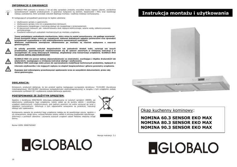 INFORMACJE O GWARANCJI GLOBALO MAX pokrywa w okresie 2 lat od daty sprzedaży produktu wszystkie koszty napraw usterek, ewidentnie spowodowanych wadami produkcyjnymi. Z gwarancji wyłączone są żarówki, bezpieczniki i filtry oraz wszelkiego rodzaju uszkodzenia, które powstały wskutek błędnego montażu i wadliwej instalacji wentylacyjnej. Instrukcja montażu i użytkowania W następujących przypadkach gwarancja nie będzie udzielana: Użytkowanie sprzętu w gastronomii. Użytkowanie sprzętu inne niż w gospodarstwie domowym. Użytkowania niezgodnego z instrukcją obsługi lub niezgodnego z przeznaczeniem. W zdarzeniach losowych, jak: niekontrolowany skok napięcia elektrycznego, zalanie wodą, zatkanie przewodu wentylacyjnego. Powstania widocznych uszkodzeń mechanicznych po montażu urządzenia. Towar posiadający uszkodzenia mechaniczne, który mimo to został zamontowany, nie podlega wymianie! Przed montażem okapu należy go rozpakować, dokonać dokładnych oględzin powierzchni oraz sprawdzić kompletność wyposażenia w celu zidentyfikowania ewentualnych uszkodzeń. Widoczne uszkodzenia zewnętrzne reklamowane po montażu są również wyłączone z roszczeń gwarancyjnych. Za szkody powstałe wskutek bezpośrednich lub pośrednich działań ludzi, zwierząt lub innych przedmiotów, spowodowanych niestosowaniem się do zaleceń zawartych w niniejszej instrukcji a w szczególności do uwag dotyczących instalacji, eksploatacji oraz konserwacji urządzenia, GLOBALO MAX nie ponosi żadnej odpowiedzialności! GLOBALO MAX nie ponosi żadnej odpowiedzialności za nieścisłości, wynikające z błędów drukarskich lub edytorskich, występujące w niniejszej instrukcji obsługi i użytkowania. GLOBALO MAX zastrzega sobie prawo do wprowadzania modyfikacji technicznych produktów, będących w interesie użytkownika i nie mających wpływu na stopień bezpieczeństwa i główne parametry urządzenia. Kupujący jest zobowiązany przechowywać opakowanie wraz ze wszystkimi dokumentami, przez cały okres gwarancyjny. DEKLARACJA: Niniejszym, producent deklaruje, że ten produkt spełnia następujące europejskie dyrektywy: 73/23/EEC (dyrektywa niskonapięciowa); 89/336/EEC (dyrektywa kompatybilności elektromagnetycznej) w związku z tym urządzenie zostało oznakowane symbolem CE i wystawiona została deklaracja zgodności. POSTĘPOWANIE ZE ZUŻYTYM SPRZĘTEM: Zgodnie z dyrektywą 2002/96/EG dotyczącą postępowania ze zużytym sprzętem (WEEE), po zakończeniu użytkowania tego urządzenia, należy oddać go do punktu zbiórki i recyklingu urządzeń elektrycznych i elektronicznych, pod żadnym pozorem nie wolno wyrzucać go wraz z odpadami komunalnymi. Informuje o tym odpowiednie oznaczenie na produkcie, instrukcji obsługi lub/i opakowaniu. Okap kuchenny kominowy: Komponenty zawarte do produkcji tego urządzenia nadają się do powtórnego użycia, zgodnie z ich oznaczeniem, dzięki temu, wnoszą Państwo istotny wkład w ochronę środowiska naturalnego. Informacji o punktach zbierania i usuwania zużytych urządzeń udzieli Państwu właściwy Urząd Gminy. NOMINA 60.3 SENSOR EKO MAX NOMINA 80.3 SENSOR EKO MAX NOMINA 90.3 SENSOR EKO MAX Numer GIOS: E0007925WZ Wersja instrukcji: 3.1 16 Spis treści Wymiary i dane techniczne: Serwis Etykieta energetyczna 4 4 Ilustracja urządzenia Wskazania bezpieczeństwa przy użytkowaniu Wskazania bezpieczeństwa przy konserwacji i czyszczeniu 5 5 5 Obsługa okapu Funkcja BOOST Włączanie i wyłączanie silnika okapu Regulacja prędkości Automatyka wyłączania okapu (TIMER) Funkcja AUTO Funkcja TURBO Włączanie i wyłączanie oświetlenia 6 6 6 6 6 6 6 6 Konserwacja i czyszczenie Okresy międzykonserwacyjne Czyszczenie okapu Czyszczenie metalowego filtra tłuszczowego 7 7 7 7 Komunikat „FILTER” na wyświetlaczu LCD Wymiana filtra z węglem aktywnym Wymiana lampy diodowej 8 8 8 Jak radzić sobie z problemami w eksploatacji ? Okap w ogóle nie funkcjonuje Wydajność jest niewystarczająca Podwyższony szum eksploatacyjny Lampa diodowa nie działa Wszystkie lampy diodowe nie działają 9 9 9 9 9 9 Tryb pracy z wyciągiem lub z wewnętrznym obiegiem powietrza Rysunek wymiarowy urządzenia 10 10 Wskazówki dla poprawnej instalacji okapu Przyłącze elektryczne 11 11 Zestawienie dostarczonych części 12 Montaż okapu Wykonanie wewnętrznych połączeń elektrycznych Montaż ścienny Sposoby zmniejszenia wpływu procesu gotowania na środowisko 13 13 13 13 Montaż przewodu odprowadzającego Wykonanie przyłącza sieciowego Montaż maskownicy Uruchomienie 14 14 14 14 Wymiary i dane techniczne 15 Informacje o gwarancji Deklaracja Postępowanie ze zużytym sprzętem 16 16 16 Napięcie: 220 – 240V Częstotliwość: ~50 Hz Moc silnika: 275 W Ilość stopni prędkości: 3+1 Oświetlenie: 2 x 1,2 W Moc maksymalna: 277,4 W Klasa bezpieczeństwa: I Wydajność: 805 m3/h* Średnica wylotu: Ø 150 mm + redukcja Ø 120 mm *Błędne podłączenie przewodu wentylacyjnego powoduje spadek wydajności urządzenia, każde załamanie rury o 90 stopni powoduje spadek wydajności o około 10%. Każdy dodatkowy metr rury lub płaskiego kanału powoduje spadek wydajności o kolejne 5%. Zredukowanie średnicy przewodu poprzez redukcję pola przekroju poprzecznego - powoduje spadek wydajności urządzenia. Aby zachować fabryczne parametry urządzenia, należy tak planować montaż aby nie zmniejszać pola powierzchni wylotu turbiny okapu. Zamontowanie filtra węglowego w okapie obniża jego wydajność o około 25-30%. Każde stłumienie pracy silnika, spowoduje jego przyśpieszenie oraz zwiększenie głośności pracy! W ekstremalnych przypadkach, przy długotrwałej pracy na najwyższym stopniu prędkości i przy znacznie stłumionym ciągu, może doprowadzić nawet do spalenia silnika elektrycznego okapu. 2 15 Montaż przewodu odprowadzającego (tylko w wyciągowym trybie pracy) Szanowni Klienci, Do połączenia z otworem wentylacyjnym w ścianie, należy za