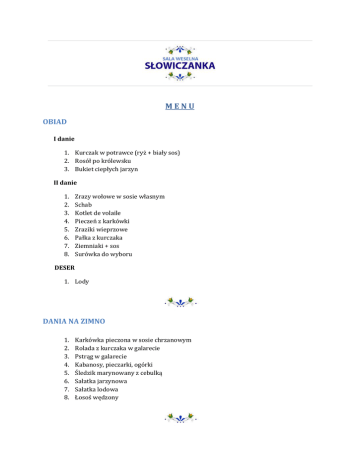 MENU OBIAD I danie 1. Kurczak w potrawce (ryż + biały sos) 2. Rosół po królewsku 3. Bukiet ciepłych jarzyn II danie 1. 2. 3. 4. 5. 6. 7. 8. Zrazy wołowe w sosie własnym Schab Kotlet de volaile Pieczeń z karkówki Zraziki wieprzowe Pałka z kurczaka Ziemniaki + sos Surówka do wyboru DESER 1. Lody DANIA NA ZIMNO 1. 2. 3. 4. 5. 6. 7. 8. Karkówka pieczona w sosie chrzanowym Rolada z kurczaka w galarecie Pstrąg w galarecie Kabanosy, pieczarki, ogórki Śledzik marynowany z cebulką Sałatka jarzynowa Sałatka lodowa Łosoś wędzony DANIA SPECJALNE 1. Łosoś płonący z sosem tatarskim 2. Udziec wieprzowy płonący z sosem tzatziki KOLACJA I. 1. Szaszłyki 2. Barszcz i krokiety, paszteciki II. 1. Udka na ciepło 2. Pierś z kurczaka w płatkach kukurydzianych 3. Frytki DANIA GORĄCE 1. Flaki (w ilości dla połowy gości) 2. Żurek (w ilości dla połowy gości) CIASTA 1. 2. 3. 4. 5. 6. 7. 8. 9. Sernik na zimno – 5 Śliwkowiec – 1 Sernik wiedeński – 1 Słonecznik – 1 Jabłecznik – 1 Ptasie mleczko – 1 3bit – 1 Cappucino – 1 WZ – 1 DODATKOWO 1. 2 serca TORTY śmietankowy, truskawkowy, wiśniowo-śmietankowy, marczello KAWA / HERBATA BEZ OGRANICZEŃ OFERUJEMY TAKŻE ZA DODATKOWĄ OPŁATĄ 1. 2. 3. 4. 5. Dzik Kaczka Tatar z polędwicy Krokodyl Jeż z dziećmi OWOCE Owoce sezonowe - 3 gatunki