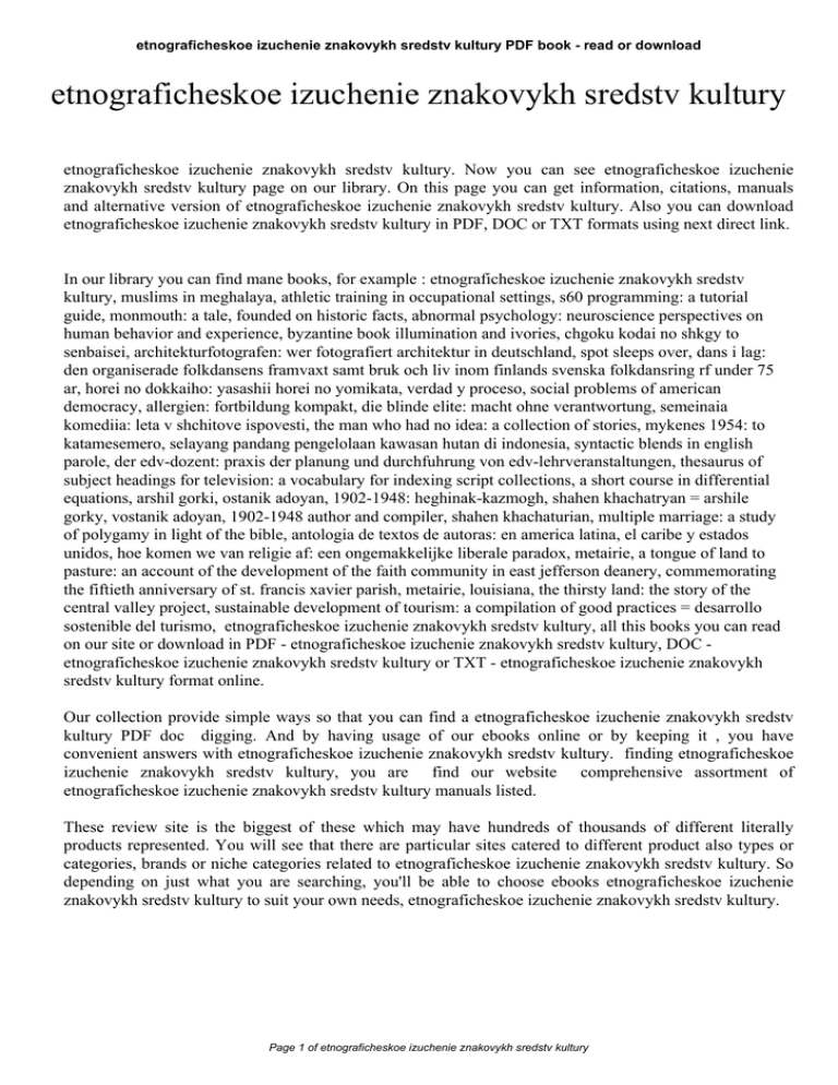 etnograficheskoe izuchenie znakovykh sredstv kultury PDF book - read or download etnograficheskoe izuchenie znakovykh sredstv kultury etnograficheskoe izuchenie znakovykh sredstv kultury. Now you can see etnograficheskoe izuchenie znakovykh sredstv kultury page on our library. On this page you can get information, citations, manuals and alternative version of etnograficheskoe izuchenie znakovykh sredstv kultury. Also you can download etnograficheskoe izuchenie znakovykh sredstv kultury in PDF, DOC or TXT formats using next direct link. In our library you can find mane books, for example : etnograficheskoe izuchenie znakovykh sredstv kultury, muslims in meghalaya, athletic training in occupational settings, s60 programming: a tutorial guide, monmouth: a tale, founded on historic facts, abnormal psychology: neuroscience perspectives on human behavior and experience, byzantine book illumination and ivories, chgoku kodai no shkgy to senbaisei, architekturfotografen: wer fotografiert architektur in deutschland, spot sleeps over, dans i lag: den organiserade folkdansens framvaxt samt bruk och liv inom finlands svenska folkdansring rf under 75 ar, horei no dokkaiho: yasashii horei no yomikata, verdad y proceso, social problems of american democracy, allergien: fortbildung kompakt, die blinde elite: macht ohne verantwortung, semeinaia komediia: leta v shchitove ispovesti, the man who had no idea: a collection of stories, mykenes 1954: to katamesemero, selayang pandang pengelolaan kawasan hutan di indonesia, syntactic blends in english parole, der edv-dozent: praxis der planung und durchfuhrung von edv-lehrveranstaltungen, thesaurus of subject headings for television: a vocabulary for indexing script collections, a short course in differential equations, arshil gorki, ostanik adoyan, 1902-1948: heghinak-kazmogh, shahen khachatryan = arshile gorky, vostanik adoyan, 1902-1948 author and compiler, shahen khachaturian, multiple marriage: a study of polygamy in light of the bible, antologia de textos de autoras: en america latina, el caribe y estados unidos, hoe komen we van religie af: een ongemakkelijke liberale paradox, metairie, a tongue of land to pasture: an account of the development of the faith community in east jefferson deanery, commemorating the fiftieth anniversary of st. francis xavier parish, metairie, louisiana, the thirsty land: the story of the central valley project, sustainable development of tourism: a compilation of good practices = desarrollo sostenible del turismo, etnograficheskoe izuchenie znakovykh sredstv kultury, all this books you can read on our site or download in PDF - etnograficheskoe izuchenie znakovykh sredstv kultury, DOC etnograficheskoe izuchenie znakovykh sredstv kultury or TXT - etnograficheskoe izuchenie znakovykh sredstv kultury format online. Our collection provide simple ways so that you can find a etnograficheskoe izuchenie znakovykh sredstv kultury PDF doc digging. And by having usage of our ebooks online or by keeping it , you have convenient answers with etnograficheskoe izuchenie znakovykh sredstv kultury. finding etnograficheskoe izuchenie znakovykh sredstv kultury, you are find our website comprehensive assortment of etnograficheskoe izuchenie znakovykh sredstv kultury manuals listed. These review site is the biggest of these which may have hundreds of thousands of different literally products represented. You will see that there are particular sites catered to different product also types or categories, brands or niche categories related to etnograficheskoe izuchenie znakovykh sredstv kultury. So depending on just what you are searching, you'll be able to choose ebooks etnograficheskoe izuchenie znakovykh sredstv kultury to suit your own needs, etnograficheskoe izuchenie znakovykh sredstv kultury. Page 1 of etnograficheskoe izuchenie znakovykh sredstv kultury