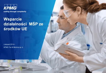 Wsparcie działalności MŚP ze środków UE Listopad 2014 r. KPMG Tax M.Michna sp. k. Spis treści I. Horyzont 2020 II. COSME III. JEREMIE © 2014 KPMG Tax M.Michna sp.k. jest polską spółką komandytową i członkiem sieci KPMG składającej się z niezależnych spółek członkowskich stowarzyszonych z KPMG International Cooperative (“KPMG International”), podmiotem prawa szwajcarskiego. Wszelkie prawa zastrzeżone. t Master subtitle style 1 Horyzont 2020 obszary wsparcia FILAR: Wiodąca pozycja w przemyśle: Horyzont 2020 to największy program Komisji Technologie informacyjne i komunikacyjne (ICT) Europejskiej przeznaczony na finansowanie projektów Nanotechnologie, zaawansowane materiały, produkcja i biotechnologia badawczo-rozwojowych z budżetem ok. 80 mld EUR Przestrzeń kosmiczna FILAR: Wyzwania społeczne: Zdrowie, zmiany demograficzne i dobrostan Bezpieczeństwo żywnościowe, zrównoważone rolnictwo i leśnictwo, badania mórz i wód śródlądowych, biogospodarka Bezpieczna czysta i efektywna energia Inteligentny, zielony i zintegrowany transport Klimat, środowisko i efektywna gospodarka zasobami i surowcami Europa w zmieniającym się świecie – innowacyjne i otwarte społeczeństwo Bezpieczne społeczeństwa – ochrona wolności i bezpieczeństwa Europy i jej obywateli © 2014 KPMG Tax M.Michna sp.k. jest polską spółką komandytową i członkiem sieci KPMG składającej się z niezależnych spółek członkowskich stowarzyszonych z KPMG International Cooperative (“KPMG International”), podmiotem prawa szwajcarskiego. Wszelkie prawa zastrzeżone. t Master subtitle style 2 Horyzont 2020 Wspierane fazy projektu b+R Poziom dofinansowania może sięgać 100% kosztów kwalifikowanych projektu • Działania mające na celu ustalenie nowej wiedzy • Badania podstawowe i stosowane • Działania towarzyszące: rozpowszechnianie, tworzenie sieci, koordynacja, wymiana doświadczeń © 2014 KPMG Tax M.Michna sp.k. jest polską spółką komandytową i członkiem sieci KPMG składającej się z niezależnych spółek członkowskich stowarzyszonych z KPMG International Cooperative (“KPMG International”), podmiotem prawa szwajcarskiego. Wszelkie prawa zastrzeżone. t Master subtitle style • Działania bezpośrednio nastawione na rozwój produkcji • Prototypowanie • Demonstracja i pilotaż Badania i innowacje Działania innowacyjne 100% kosztów kwalifikowanych (min. 3 podmioty z 3 krajów) 70% kosztów kwalifikowanych (min. 3 podmioty z 3 krajów) Działania koordynacyjne i wspierające Instrument MŚP 100% kosztów kwalifikowanych (min. 1 podmiot) 70% kosztów kwalifikowanych (min. 1 MŚP) • Koncepcja i ocena wykonalności • Działania demonstracyjne, replikacja • Komercjalizacja wyników 3 Horyzont 2020 dla MŚP Horyzont 2020 oferuje Pozostałe instrumenty wsparcia dla MŚP w ramach Programu Horyzont 2020: szereg możliwości wsparcia Działania Marii Skłodowskiej-Curie – wymiana pracowników zajmujących się badaniami, zatrudnienie młodych naukowców, promocja nauki, dofinansowanie stypendiów działalności badawczorozwojowej i innowacyjnej dla MŚP Eurostars-2 – finansowanie międzynarodowych projektów badawczo-rozwojowych mających na celu szybką komercjalizację wyników Fast Track to Innovation – pilotażowy program wsparcia komercjalizacji najlepszych innowacyjnych pomysłów Działania wspierające na rzecz MŚP – m.in. usługi doradcze Preferencyjne instrumenty finansowe – pożyczki i gwarancje bankowe © 2014 KPMG Tax M.Michna sp.k. jest polską spółką komandytową i członkiem sieci KPMG składającej się z niezależnych spółek członkowskich stowarzyszonych z KPMG International Cooperative (“KPMG International”), podmiotem prawa szwajcarskiego. Wszelkie prawa zastrzeżone. t Master subtitle style 4 COSME Program ramowy na rzecz Poprawa dostępu małych i średnich przedsiębiorstw do finansowania, dzięki instrumentom finansowym: konkurencyjności • Instrument Gwarancji Kredytowych – bezpłatne gwarancje dla instytucji finansowych oferujących finansowanie dla MŚP na bardziej korzystnych warunkach niż rynkowe • Instrument Kapitałowy dla Wzrostu – finansowanie dla funduszy podwyższonego ryzyka i oferujących finansowanie pośrednie dla MŚP przedsiębiorstw oraz MŚP 2014-2020. Budżet programu wynosi 2,3 mld EUR. Poprawa dostępu do rynków, dzięki usługom Enterprise Europe Network obejmującym m.in.: • usługi informacyjne nt. prawa Unii Europejskiej oraz udziału w programach unijnych, • wsparcie w pozyskaniu partnerów zagranicznych, w Unii Europejskiej oraz poza UE, • doradztwo w zakresie możliwości finansowania, • wsparcie transferu innowacji i technologii, • zapewnienie komunikacji pomiędzy przedsiębiorstwami a Komisją Europejską w sprawie warunków prowadzenia działalności gospodarczej w UE. Poprawa warunków dla tworzenia i rozwoju przedsiębiorstw, przez: • ograniczenie obciążeń administracyjnych i prawnych, m.in. dzięki redukcji obowiązkowej sprawozdawczości, • identyfikację i rozpowszechnienie dobrych praktyk we wspieraniu przedsiębiorczości na poziomie lokalnym, regionalnym i krajowym, • analizę efektywności narzędzi wspierania przedsiębiorczości w poszczególnych krajach, • wsparcie poszczególnych sektorów, ze szczególnym uwzględnieniem turystyki. Promocja przedsiębiorczości i kultury przedsiębiorczości, przez: • Edukację nt. przedsiębiorczości – COSME będzie wspierać wymianę informacji na temat najlepszych praktyk w edukacji nt. przedsiębiorczości. • Poprawę warunków prowadzenia działalności gospodarczej, dla umożliwienia wzrostu i rozwoju przedsiębiorstw. Wraz z poprawą systemu prawnego oraz podatkowego, przygotowane zostają rekomendacje dotyczące najlepszych sposobów wsparcia przedsiębiorstw w poszczególnych etapach ich rozwoju. Szczególna uwaga zostanie poświęcona firmom internetowym. • Szczególne narz