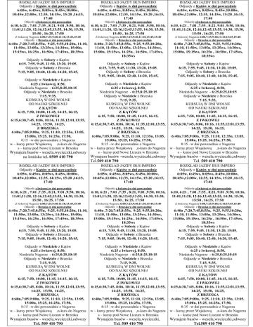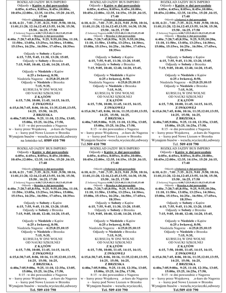 ROZKŁAD JAZDY BUS IMPERO Odjazdy z Kątów w dni powszednie 6:05w, 6:45ws, 8:05ws, 8:45w,10:00w, 10:45w,12:00w, 12:35, 14:15w, 15:20 ,16:15, 17:40 ROZKŁAD JAZDY BUS IMPERO Odjazdy z Kątów w dni powszednie 6:05w, 6:45ws, 8:05ws, 8:45w,10:00w, 10:45w,12:00w, 12:35, 14:15w, 15:20 ,16:15, 17:40 ROZKŁAD JAZDY BUS IMPERO Odjazdy z Kątów w dni powszednie 6:05w, 6:45ws, 8:05ws, 8:45w,10:00w, 10:45w,12:00w, 12:35, 14:15w, 15:20 ,16:15, 17:40 Odjazdy z Iwkowej w dni powszednie Odjazdy z Iwkowej w dni powszednie Odjazdy z Iwkowej w dni powszednie 6:10, 6:21 , 7:01 ,7:35 , 8:21, 9:01 ,9:50, 10:16, 11:01,11:20, 12:16,12:45,13:55, 14:30, 15:30, 15:50 , 16:25, 17:50 6:10, 6:21 , 7:01 ,7:35 , 8:21, 9:01 ,9:50, 10:16, 11:01,11:20, 12:16,12:45,13:55, 14:30, 15:30, 15:50 , 16:25, 17:50 6:10, 6:21 , 7:01 ,7:35 , 8:21, 9:01 ,9:50, 10:16, 11:01,11:20, 12:16,12:45,13:55, 14:30, 15:30, 15:50 , 16:25, 17:50 Z Iwkowej Nagorza 6:00,7:25,9:40,11:10,13:45,15:40 Odjazdy z Brzeska w dni powszednie Z Iwkowej Nagorza 6:00,7:25,9:40,11:10,13:45,15:40 Odjazdy z Brzeska w dni powszednie Z Iwkowej Nagorza 6:00,7:25,9:40,11:10,13:45,15:40 Odjazdy z Brzeska w dni powszednie 6:40n ,7:20,7:45,8:55n, 9:25, 9:55,10:20n, 11:10, 11:50w, 13:05n, 13:25ws, 14:30ws, 15:00n, 15:15ws, 16:25n , 16:50w, 17:45ws, 18:35ws 6:40n ,7:20,7:45,8:55n, 9:25, 9:55,10:20n, 11:10, 11:50w, 13:05n, 13:25ws, 14:30ws, 15:00n, 15:15ws, 16:25n , 16:50w, 17:45ws, 18:35ws 6:40n ,7:20,7:45,8:55n, 9:25, 9:55,10:20n, 11:10, 11:50w, 13:05n, 13:25ws, 14:30ws, 15:00n, 15:15ws, 16:25n , 16:50w, 17:45ws, 18:35ws Odjazdy w Soboty z Kątów 6:15, 7:55, 9:45, 11:30, 13:20, 15:05, Odjazdy w Soboty z Brzeska 7:15, 9:05, 10:40, 12:40, 14:20, 15:45, Odjazdy w Soboty z Kątów 6:15, 7:55, 9:45, 11:30, 13:20, 15:05, Odjazdy w Soboty z Brzeska 7:15, 9:05, 10:40, 12:40, 14:20, 15:45, Odjazdy w Niedziele z Kątów 6:25 z Iwkowej, 8:50, Niedziela Nagorze - 6:25,8:25,10:15 Odjazdy w Niedziele z Brzeska 7:15, 9:35, KURSUJĄ W DNI WOLNE OD NAUKI SZKOLNEJ Z KĄTÓW 6:15, 7:50, 10:00, 11:45, 14:15, 16:15, Z IWKOWEJ 6:15,6:30,7:45, 8:06, 10:16, 11:35,12:01,13:55, 14:25, 15:50, 16:25, Z BRZESKA 6:40n,7:05,9:00n, 9:25, 11:10, 12:35n, 13:05, 15:00n, 15:25, 16:25n, 17:50, 8:15 –w dni powszednie z Nagorza w – kursy przez Wojakową ,n-kurs do Nagorza s – kursy pod Nowe Liceum w Brzesku Odjazdy w Niedziele z Kątów 6:25 z Iwkowej, 8:50, Niedziela Nagorze - 6:25,8:25,10:15 Odjazdy w Niedziele z Brzeska 7:15, 9:35, KURSUJĄ W DNI WOLNE OD NAUKI SZKOLNEJ Z KĄTÓW 6:15, 7:50, 10:00, 11:45, 14:15, 16:15, Z IWKOWEJ 6:15,6:30,7:45, 8:06, 10:16, 11:35,12:01,13:55, 14:25, 15:50, 16:25, Z BRZESKA 6:40n,7:05,9:00n, 9:25, 11:10, 12:35n, 13:05, 15:00n, 15:25, 16:25n, 17:50, 8:15 –w dni powszednie z Nagorza w – kursy przez Wojakową ,n-kurs do Nagorza s – kursy pod Nowe Liceum w Brzesku ROZKŁAD JAZDY BUS IMPERO Odjazdy z Kątów w dni powszednie 6:05w, 6:45ws, 8:05ws, 8:45w,10:00w, 10:45w,12:00w, 12:35, 14:15w, 15:20 ,16:15, 17:40 ROZKŁAD JAZDY BUS IMPERO Odjazdy z Kątów w dni powszednie 6:05w, 6:45ws, 8:05ws, 8:45w,10:00w, 10:45w,12:00w, 12:35, 14:15w, 15:20 ,16:15, 17:40 Odjazdy w Soboty z Kątów 6:15, 7:55, 9:45, 11:30, 13:20, 15:05, Odjazdy w Soboty z Brzeska 7:15, 9:05, 10:40, 12:40, 14:20, 15:45, Odjazdy w Niedziele z Kątów 6:25 z Iwkowej, 8:50, Niedziela Nagorze - 6:25,8:25,10:15 Odjazdy w Niedziele z Brzeska 7:15, 9:35, KURSUJĄ W DNI WOLNE OD NAUKI SZKOLNEJ Z KĄTÓW 6:15, 7:50, 10:00, 11:45, 14:15, 16:15, Z IWKOWEJ 6:15,6:30,7:45, 8:06, 10:16, 11:35,12:01,13:55, 14:25, 15:50, 16:25, Z BRZESKA 6:40n,7:05,9:00n, 9:25, 11:10, 12:35n, 13:05, 15:00n, 15:25, 16:25n, 17:50, 8:15 –w dni powszednie z Nagorza w – kursy przez Wojakową ,n-kurs do Nagorza s – kursy pod Nowe Liceum w Brzesku Wynajem busów - wesela,wycieczki,odwozy Wynajem busów -wesela,wycieczki,odwozy Wynajem busów - wesela,wycieczki,odwozy na lotnisko tel. 0509 410 790 Tel.509 410 790 Tel. 509 410 790 ROZKŁAD JAZDY BUS IMPERO Odjazdy z Kątów w dni powszednie 6:05w, 6:45ws, 8:05ws, 8:45w,10:00w, 10:45w,12:00w, 12:35, 14:15w, 15:20 ,16:15, 17:40 Odjazdy z Iwkowej w dni powszednie Odjazdy z Iwkowej w dni powszednie Odjazdy z Iwkowej w dni powszednie 6:10, 6:21 , 7:01 ,7:35 , 8:21, 9:01 ,9:50, 10:16, 11:01,11:20, 12:16,12:45,13:55, 14:30, 15:30, 15:50 , 16:25, 17:50 6:10, 6:21 , 7:01 ,7:35 , 8:21, 9:01 ,9:50, 10:16, 11:01,11:20, 12:16,12:45,13:55, 14:30, 15:30, 15:50 , 16:25, 17:50 6:10, 6:21 , 7:01 ,7:35 , 8:21, 9:01 ,9:50, 10:16, 11:01,11:20, 12:16,12:45,13:55, 14:30, 15:30, 15:50 , 16:25, 17:50 Z Iwkowej Nagorza 6:00,7:25,9:40,11:10,13:45,15:40 Odjazdy z Brzeska w dni powszednie Z Iwkowej Nagorza 6:00,7:25,9:40,11:10,13:45,15:40 Odjazdy z Brzeska w dni powszednie Z Iwkowej Nagorza 6:00,7:25,9:40,11:10,13:45,15:40 Odjazdy z Brzeska w dni powszednie 6:40n ,7:20,7:45,8:55n, 9:25, 9:55,10:20n, 11:10, 11:50w, 13:05n, 13:25ws, 14:30ws, 15:00n, 15:15ws, 16:25n , 16:50w, 17:45ws, 18:35ws Odjazdy w Soboty z Kątów 6:15, 7:55, 9:45, 11:30, 13:20, 15:05, Odjazdy w Soboty z Brzeska 7:15, 9:05, 10:40, 12:40, 14:20, 15:45, 6:40n ,7:20,7:45,8:55n, 9:25, 9:55,10:20n, 11:10, 11:50w, 13:05n, 13:25ws, 14:30ws, 15:00n, 15:15ws, 16:25n , 16:50w, 17:45ws, 18:35ws Odjazdy w Soboty z Kątów 6:15, 7:55, 9:45, 11:30, 13:20, 15:05, Odjazdy w Soboty z Brzeska 7:15, 9:05, 10:40, 12:40, 14:20, 15:45, 6:40n ,7:20,7:45,8:55n, 9:25, 9:55,10:20n, 11:10, 11:50w, 13:05n, 13:25ws, 14:30ws, 15:00n, 15:15ws, 16:25n , 16:50w, 17:45ws, 18:35ws Odjazdy w Soboty z Kątów 6:15, 7:55, 9:45, 11:30, 13:20, 15:05, Odjazdy w Soboty z Brzeska 7:15, 9:05, 10:40, 12:40, 14:20, 15:45, Odjazdy w Niedziele z Kątów 6:25 z Iwkowej, 8:50, Niedziela Nagorze - 6:25,8:25,10:15 Odjazdy w Niedziele z Brzeska 7:15, 9:35, KURSUJĄ W DNI WOLNE OD NAUKI SZKOLNEJ Z KĄTÓW 6:15, 7:50, 10:00, 11:45, 14:15, 16:15, Z IWKOWEJ 6:15,6:30,7:45, 8:06, 10:16, 11:35,12:01,13:55, 14:25, 15:50, 16:25, Z BRZESKA 6:40n,7:05,9:00n, 9:25, 11:10, 12:35n, 13:05, 15:00n, 15:25, 16:2