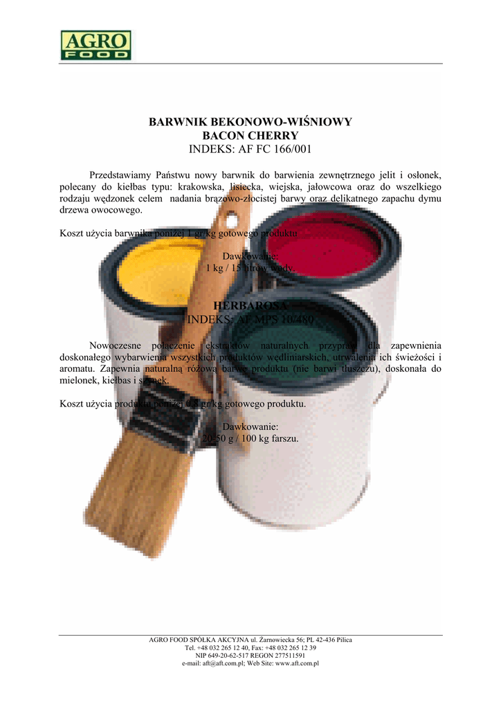 BARWNIK BEKONOWO-WIŚNIOWY BACON CHERRY INDEKS: AF FC 166/001 Przedstawiamy Państwu nowy barwnik do barwienia zewnętrznego jelit i osłonek, polecany do kiełbas typu: krakowska, lisiecka, wiejska, jałowcowa oraz do wszelkiego rodzaju wędzonek celem nadania brązowo-złocistej barwy oraz delikatnego zapachu dymu drzewa owocowego. Koszt użycia barwnika poniżej 1 gr/kg gotowego produktu Dawkowanie: 1 kg / 15 litrów wody. HERBAROSA INDEKS: AF MPS 10/480 Nowoczesne połączenie ekstraktów naturalnych przypraw dla zapewnienia doskonałego wybarwienia wszystkich produktów wędliniarskich, utrwalenia ich świeżości i aromatu. Zapewnia naturalną różową barwę produktu (nie barwi tłuszczu), doskonała do mielonek, kiełbas i szynek. Koszt użycia produktu poniżej 0,8 gr/kg gotowego produktu. Dawkowanie: 20-50 g / 100 kg farszu. AGRO FOOD SPÓŁKA AKCYJNA ul. Żarnowiecka 56; PL 42-436 Pilica Tel. +48 032 265 12 40, Fax: +48 032 265 12 39 NIP 649-20-62-517 REGON 277511591 e-mail: [email protected]; Web Site: www.aft.com.pl