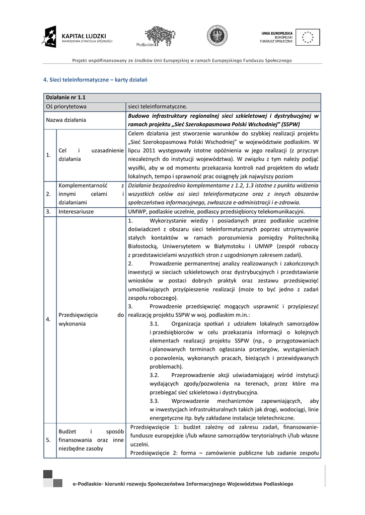 Projekt współfinansowany ze środków Unii Europejskiej w ramach Europejskiego Funduszu Społecznego 4. Sieci teleinformatyczne – karty działań Działanie nr 1.1 Oś priorytetowa Nazwa działania 1. 2. 3. Cel i działania uzasadnienie Komplementarnośd innymi celami działaniami Interesariusze z i 4. Przedsięwzięcia wykonania do 5. Budżet i sposób finansowania oraz inne niezbędne zasoby sieci teleinformatyczne. Budowa infrastruktury regionalnej sieci szkieletowej i dystrybucyjnej w ramach projektu „Sied Szerokopasmowa Polski Wschodniej” (SSPW) Celem działania jest stworzenie warunków do szybkiej realizacji projektu „Sied Szerokopasmowa Polski Wschodniej” w województwie podlaskim. W lipcu 2011 występowały istotne opóźnienia w jego realizacji (z przyczyn niezależnych do instytucji województwa). W związku z tym należy podjąd wysiłki, aby w od momentu przekazania kontroli nad projektem do władz lokalnych, tempo i sprawnośd prac osiągnęły jak najwyższy poziom Działanie bezpośrednio komplementarne z 1.2, 1.3 istotne z punktu widzenia wszystkich celów osi sieci teleinformatyczne oraz z innych obszarów społeczeostwa informacyjnego, zwłaszcza e-administracji i e-zdrowia. UMWP, podlaskie uczelnie, podlascy przedsiębiorcy telekomunikacyjni. 1. Wykorzystanie wiedzy i posiadanych przez podlaskie uczelnie doświadczeo z obszaru sieci teleinformatycznych poprzez utrzymywanie stałych kontaktów w ramach porozumienia pomiędzy Politechniką Białostocką, Uniwersytetem w Białymstoku i UMWP (zespół roboczy z przedstawicielami wszystkich stron z uzgodnionym zakresem zadao). 2. Prowadzenie permanentnej analizy realizowanych i zakooczonych inwestycji w sieciach szkieletowych oraz dystrybucyjnych i przedstawianie wniosków w postaci dobrych praktyk oraz zestawu przedsięwzięd umożliwiających przyśpieszenie realizacji (może to byd jedno z zadao zespołu roboczego). 3. Prowadzenie przedsięwzięd mogących usprawnid i przyśpieszyd realizację projektu SSPW w woj. podlaskim m.in.: 3.1. Organizacja spotkao z udziałem lokalnych samorządów i przedsiębiorców w celu przekazania informacji o kolejnych elementach realizacji projektu SSPW (np., o przygotowaniach i planowanych terminach ogłaszania przetargów, wystąpieniach o pozwolenia, wykonanych pracach, bieżących i przewidywanych problemach). 3.2. Przeprowadzenie akcji uświadamiającej wśród instytucji wydających zgody/pozwolenia na terenach, przez które ma przebiegad sied szkieletowa i dystrybucyjna. 3.3. Wprowadzenie mechanizmów zapewniających, aby w inwestycjach infrastrukturalnych takich jak drogi, wodociągi, linie energetyczne itp. były zakładane instalacje teletechniczne. Przedsięwzięcie 1: budżet zależny od zakresu zadao, finansowaniefundusze europejskie i/lub własne samorządów terytorialnych i/lub własne uczelni. Przedsięwzięcie 2: forma – zamówienie publiczne lub zadanie zespołu e-Podlaskie- kierunki rozwoju Społeczeństwa Informacyjnego Województwa Podlaskiego Projekt współfinansowany ze środków Unii Europejskiej w ramach Europejskiego Funduszu Społecznego 6. Termin realizacji 7. Poziom priorytetu: 1. Najwyższy 2. Wysoki 3. Średni roboczego, finansowanie – fundusze europejskie i/lub własne samorządów terytorialnych i/lub własne uczelni. Przedsięwzięcie 3: najniższy koszt zostanie osiągnięty, jeśli wykorzystane zostaną zasoby osobowe i lokalowe UMWP, finansowanie-– fundusze europejskie i/lub własne Samorządu Województwa Przedsięwzięcie 1: podpisanie stosownej umowy do kooca 2011 roku, umowa do kooca trwania projektu SSPW Przedsięwzięcie 2: zamówienie opublikowane lub sprecyzowane zadanie zespołu roboczego do kooca stycznia 2012, realizacja do kooca 2014. Przedsięwzięcie 3: cały okres trwania realizacji projektu SSPW 2011-2014 1 Działanie nr 1.2 Oś priorytetowa Nazwa działania 1. Cel i działania uzasadnienie 2. Komplementarnośd innymi celami działaniami 3. Interesariusze 4. Przedsięwzięcia wykonania 5. Budżet i sposób finansowania oraz inne niezbędne zasoby z i do sieci teleinformatyczne Budowa infrastruktury regionalnej sieci szkieletowej i dystrybucyjnej uzupełniającej wybudowaną infrastrukturę SSPW) Celem działania jest rozbudowa infrastruktury szerokopasmowej sieci regionalnej, tak, aby w jej zasięgu znajdowało się 100% ludności województwa podlaskiego oraz zapewnienie redundancji połączeo w każdym węźle szkieletowym i dystrybucyjnym. Jest to uzupełnienie wymagane do osiągnięcia celu głównego oraz zapewnienia niezawodności działania. Na tym etapie należy wykorzystad w maksymalnym stopniu istniejące zasoby infrastruktury operatorów komercyjnych. Przygotowane w tym działaniu opracowania posłużą do oszacowania kosztów rozbudowy oraz sporządzenia dokumentów programowych okresu 2014-2020 Działanie jest ostatnią częścią procesu budowy i uruchomienia regionalnej sieci szerokopasmowej. Bezpośrednie powiązanie z celem 1, oraz wpływ na cele 2 i 3 oraz pośredni na wszystkie cele pozostałych osi priorytetowych PRIS. Bezpośredni związek z działaniami 1.1 i 1.3 UMWP, podlaskie uczelnie, podlascy przedsiębiorcy telekomunikacyjni. 1. Przygotowanie analizy potrzeb i planu z optymalizacją kosztów i czasu poprzez wykorzystanie zasobów operatorów komercyjnych ze wskazaniem źródeł finansowania. 2. Realizacja projektu/projektów rozbudowy sieci regionalnej Przedsięwzięcie 1: forma – zamówienie publiczne, finansowanie fundusze europejskie i/lub własne UMWP Przedsięwzięcie 2: forma - zamówienie publiczne, budżet- ustalony na podstawie przedsięwzięcia 1, finansowanie – fundusze własne UMWP i/lub fundusze europejskie z nowego okresu programowania 2014-2020. e-Podlaskie- kierunki rozwoju Społeczeństwa Informacyjnego Województwa Podlaskiego Projekt współfinansowany ze środków Unii Europejskiej w ramach Europejskiego Funduszu Społecznego 6. Termin realizacji 7. Poziom prioryte