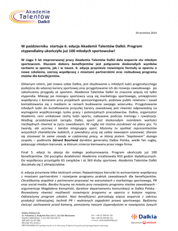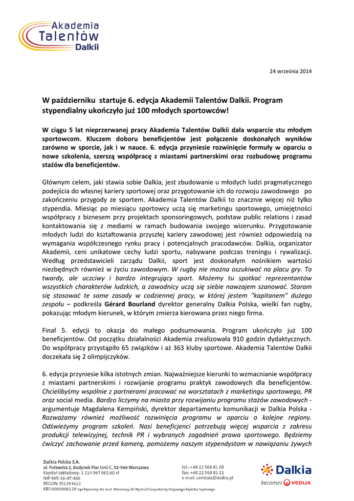 24 września 2014 W październiku startuje 6. edycja Akademii Talentów Dalkii. Program stypendialny ukończyło już 100 młodych sportowców! W ciągu 5 lat nieprzerwanej pracy Akademia Talentów Dalkii dała wsparcie stu młodym sportowcom. Kluczem doboru beneficjentów jest połączenie doskonałych wyników zarówno w sporcie, jak i w nauce. 6. edycja przyniesie rozwinięcie formuły w oparciu o nowe szkolenia, szerszą współpracę z miastami partnerskimi oraz rozbudowę programu stażów dla beneficjentów. Głównym celem, jaki stawia sobie Dalkia, jest zbudowanie u młodych ludzi pragmatycznego podejścia do własnej kariery sportowej oraz przygotowanie ich do rozwoju zawodowego po zakończeniu przygody ze sportem. Akademia Talentów Dalkii to znacznie więcej niż tylko stypendia. Miesiąc po miesiącu sportowcy uczą się marketingu sportowego, umiejętności współpracy z biznesem przy projektach sponsoringowych, podstaw public relations i zasad kontaktowania się z mediami w ramach budowania swojego wizerunku. Przygotowanie młodych ludzi do kształtowania przyszłej kariery zawodowej jest również odpowiedzią na wymagania współczesnego rynku pracy i potencjalnych pracodawców. Dalkia, organizator Akademii, ceni unikatowe cechy ludzi sportu, nabywane podczas treningu i rywalizacji. Według przedstawicieli zarządu Dalkii, sport jest doskonałym nośnikiem wartości niezbędnych również w życiu zawodowym. W rugby nie można oszukiwać na placu gry. To twardy, ale uczciwy i bardzo integrujący sport. Możemy tu spotkać reprezentantów wszystkich charakterów ludzkich, a zawodnicy uczą się siebie nawzajem szanować. Staram się stosować te same zasady w codziennej pracy, w której jestem "kapitanem" dużego zespołu – podkreśla Gérard Bourland dyrektor generalny Dalkia Polska, wielki fan rugby, pokazując młodym kierunek, w którym zmierza kierowana przez niego firma. Finał 5. edycji to okazja do małego podsumowania. Program ukończyło już 100 beneficjentów. Od początku działalności Akademia zrealizowała 910 godzin dydaktycznych. Do współpracy przystąpiło 65 związków i aż 363 kluby sportowe. Akademia Talentów Dalkii doczekała się 2 olimpijczyków. 6. edycja przyniesie kilka istotnych zmian. Najważniejsze kierunki to wzmacnianie współpracy z miastami partnerskimi i rozwijanie programu praktyk zawodowych dla beneficjentów. Chcielibyśmy wspólnie z partnerami pracować na warsztatach z marketingu sportowego, PR oraz social media. Bardzo liczymy na miasta przy rozwijaniu programu stażów zawodowych argumentuje Magdalena Kempiński, dyrektor departamentu komunikacji w Dalkia Polska Rozważamy również możliwość rozwinięcia programu w oparciu o kolejne regiony. Odświeżymy program szkoleń. Nasi beneficjenci potrzebują więcej wsparcia z zakresu produkcji telewizyjnej, technik PR i wybranych zagadnień prawa sportowego. Będziemy ćwiczyć zachowanie przed kamerą, pomożemy naszym stypendystom w nawiązaniu żywych relacji z dziennikarzami. Jedną z prowadzących szkolenia 6. edycji będzie była beneficjentka Akademii, Dominika Kulczycka, która wesprze młodszych kolegów zaawansowanym kursem nt. żywienia w sporcie. Program jest adresowany do sportowców w wieku 14-18. Osoby zainteresowane uczestnictwem gorąco zachęcamy do przesyłania CV wraz z informacją o wynikach w nauce na adres e-mail: [email protected] ZGŁOSZENIA PRZYJMUJEMY DO 12 PAŹDZIERNIKA 2014! Akademia Talentów Dalkii realizuje działania w 5 miastach: Chrzanowie, Łodzi, Poznaniu, Tarnowskich Górach i Warszawie. W każdym z regionów funkcjonuje w oparciu partnerstwo pomiędzy miastem, lokalnymi mediami oraz miejscowym oddziałem firmy Dalkia. O wyborze beneficjentów decyduje wspólne głosowanie partnerów. *** Kontakt z mediami: Magdalena Kempiński Dalkia Polska e-mail: [email protected] Tel. +48 516 141 414 Michał Siergiejuk Havas Sports & Entertainment e-mail: [email protected] Tel. +48 503 028 680 Informacje o Akademii Talentów Dalkii: Akademia Talentów Dalkii to innowacyjny program edukacyjny dla sportowców w wieku 14 - 18 lat. W trakcie dwunastomiesięcznej współpracy nasi beneficjenci uczestniczą w warsztatach z marketingu sportowego, public relations, psychologii sportu, doradztwa zawodowego i social media. Młodzi sportowcy otrzymują także wsparcie stypendialne. Istotą programu jest przygotowanie beneficjentów i absolwentów do świadomego budowania kariery zawodowej oraz przekonanie o zaletach równoczesnego rozwoju edukacyjnego i sportowego. Program jest realizowany od 2009 roku. Akademia Talentów Dalkii jest realizowana w 5 miastach: Chrzanowie, Łodzi, Poznaniu, Tarnowskich Górach i Warszawie. www.akademia-talentow.dalkia.com.pl www.facebook.pl/akademiatalentowdalkii Dalkia Polska to największy prywatny operator sieci ciepłowniczych w Polsce. Około 5 100 pracowników Dalkii w 40 miastach Polski zarządza ponad 3 000 km sieci ciepłowniczych, dostarczając 4 800 MW energii cieplnej oraz 800 MW energii elektrycznej. Dalkia w Polsce prowadzi działalność poprzez spółki zależne, w tym: Dalkia Polska (spółka holdingowa), 6 głównych spółek operacyjnych - Dalkia Warszawa, Dalkia Łódź, Dalkia Poznań, Dalkia Poznań ZEC, Dalkia term, Dalkia Energy & Technical Services oraz ich spółki zależne. www.dalkia.pl Veolia jest uznaną światowa marką specjalizującą się w optymalnym zarządzaniu zasobami naturalnymi. Obecna na pięciu kontynentach, zatrudniająca ponad 200 tyś. pracowników, tworzy i wdraża rozwiązania w zakresie gospodarki wodnej, gospodarki odpadami i energią. Rozwiązania te przyczyniają się do zrównoważonego rozwoju miast i przemysłu. Rozwijając trzy uzupełniające się działalności, Veolia zapewnia dostęp do zasobów, chroni je oraz je odnawia. W 2013 roku Veolia zaopatrzyła w wodę pitną 94 miliony mieszkańców, a 62 miliony objęła usługą uzdatniania wody. Wyprodukowała 86 MWh ener