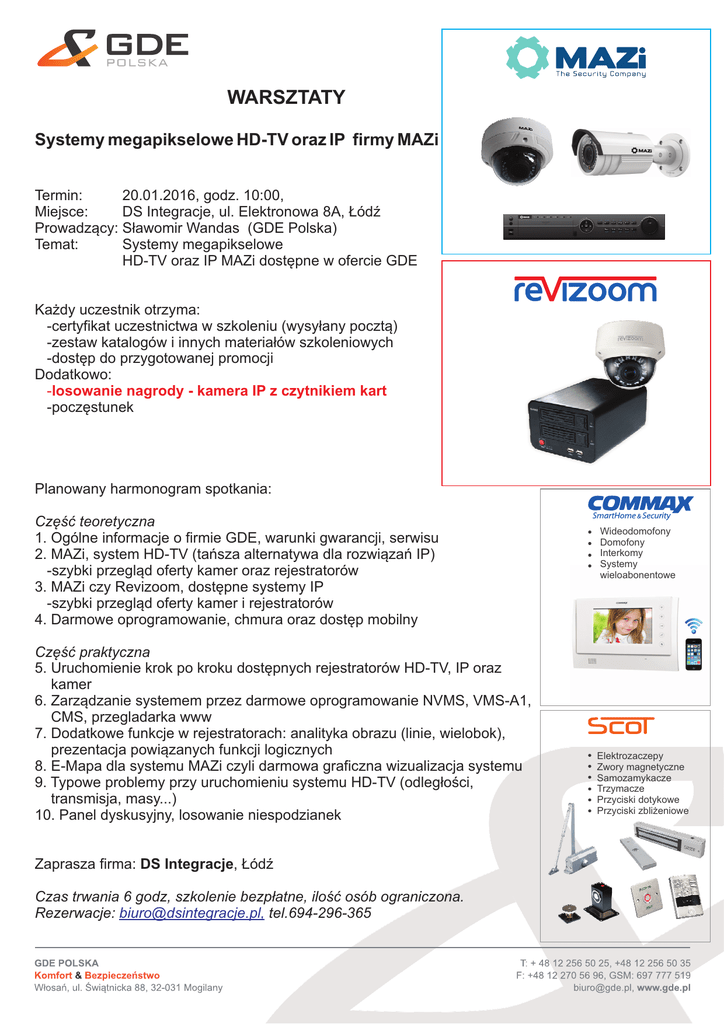 WARSZTATY Systemy megapikselowe HD-TV oraz IP firmy MAZi Termin: 20.01.2016, godz. 10:00, Miejsce: DS Integracje, ul. Elektronowa 8A, Łódź Prowadzący: Sławomir Wandas (GDE Polska) Temat: Systemy megapikselowe HD-TV oraz IP MAZi dostępne w ofercie GDE Każdy uczestnik otrzyma: -certyfikat uczestnictwa w szkoleniu (wysyłany pocztą) -zestaw katalogów i innych materiałów szkoleniowych -dostęp do przygotowanej promocji Dodatkowo: -losowanie nagrody - kamera IP z czytnikiem kart -poczęstunek Planowany harmonogram spotkania: Część teoretyczna 1. Ogólne informacje o firmie GDE, warunki gwarancji, serwisu 2. MAZi, system HD-TV (tańsza alternatywa dla rozwiązań IP) -szybki przegląd oferty kamer oraz rejestratorów 3. MAZi czy Revizoom, dostępne systemy IP -szybki przegląd oferty kamer i rejestratorów 4. Darmowe oprogramowanie, chmura oraz dostęp mobilny Część praktyczna 5. Uruchomienie krok po kroku dostępnych rejestratorów HD-TV, IP oraz kamer 6. Zarządzanie systemem przez darmowe oprogramowanie NVMS, VMS-A1, CMS, przegladarka www 7. Dodatkowe funkcje w rejestratorach: analityka obrazu (linie, wielobok), prezentacja powiązanych funkcji logicznych 8. E-Mapa dla systemu MAZi czyli darmowa graficzna wizualizacja systemu 9. Typowe problemy przy uruchomieniu systemu HD-TV (odległości, transmisja, masy...) 10. Panel dyskusyjny, losowanie niespodzianek Zaprasza firma: DS Integracje, Łódź Czas trwania 6 godz, szkolenie bezpłatne, ilość osób ograniczona. Rezerwacje: [email protected], tel.694-296-365 Wideodomofony Domofony Interkomy Systemy wieloabonentowe Elektrozaczepy Zwory magnetyczne Samozamykacze Trzymacze Przyciski dotykowe Przyciski zbliżeniowe