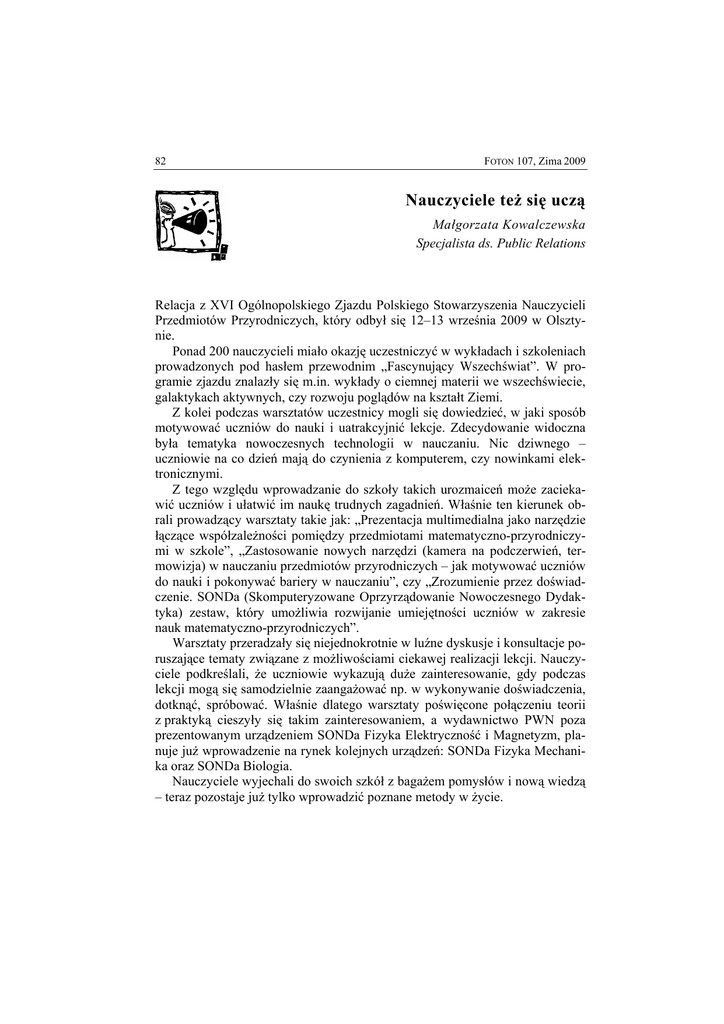 82 FOTON 107, Zima 2009 Nauczyciele też się uczą Małgorzata Kowalczewska Specjalista ds. Public Relations Relacja z XVI Ogólnopolskiego Zjazdu Polskiego Stowarzyszenia Nauczycieli Przedmiotów Przyrodniczych, który odbył się 12–13 września 2009 w Olsztynie. Ponad 200 nauczycieli miało okazję uczestniczyć w wykładach i szkoleniach prowadzonych pod hasłem przewodnim „Fascynujący Wszechświat”. W programie zjazdu znalazły się m.in. wykłady o ciemnej materii we wszechświecie, galaktykach aktywnych, czy rozwoju poglądów na kształt Ziemi. Z kolei podczas warsztatów uczestnicy mogli się dowiedzieć, w jaki sposób motywować uczniów do nauki i uatrakcyjnić lekcje. Zdecydowanie widoczna była tematyka nowoczesnych technologii w nauczaniu. Nic dziwnego – uczniowie na co dzień mają do czynienia z komputerem, czy nowinkami elektronicznymi. Z tego względu wprowadzanie do szkoły takich urozmaiceń może zaciekawić uczniów i ułatwić im naukę trudnych zagadnień. Właśnie ten kierunek obrali prowadzący warsztaty takie jak: „Prezentacja multimedialna jako narzędzie łączące współzależności pomiędzy przedmiotami matematyczno-przyrodniczymi w szkole”, „Zastosowanie nowych narzędzi (kamera na podczerwień, termowizja) w nauczaniu przedmiotów przyrodniczych – jak motywować uczniów do nauki i pokonywać bariery w nauczaniu”, czy „Zrozumienie przez doświadczenie. SONDa (Skomputeryzowane Oprzyrządowanie Nowoczesnego Dydaktyka) zestaw, który umożliwia rozwijanie umiejętności uczniów w zakresie nauk matematyczno-przyrodniczych”. Warsztaty przeradzały się niejednokrotnie w luźne dyskusje i konsultacje poruszające tematy związane z możliwościami ciekawej realizacji lekcji. Nauczyciele podkreślali, że uczniowie wykazują duże zainteresowanie, gdy podczas lekcji mogą się samodzielnie zaangażować np. w wykonywanie doświadczenia, dotknąć, spróbować. Właśnie dlatego warsztaty poświęcone połączeniu teorii z praktyką cieszyły się takim zainteresowaniem, a wydawnictwo PWN poza prezentowanym urządzeniem SONDa Fizyka Elektryczność i Magnetyzm, planuje już wprowadzenie na rynek kolejnych urządzeń: SONDa Fizyka Mechanika oraz SONDa Biologia. Nauczyciele wyjechali do swoich szkół z bagażem pomysłów i nową wiedzą – teraz pozostaje już tylko wprowadzić poznane metody w życie.