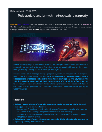 Data publikacji : 08.12.2015 Rekrutujcie znajomych i zdobywajcie nagrody Blizzard zaprezentował dziś swój program związany z rekrutowaniem znajomych do gry w Heroes of the Storm. Wśród nagród, jakie można otrzymać za zachęcenie innych graczy do wypróbowania gry jest między innymi wierzchowiec vulture (sęp) prosto z uniwersum StarCrafta. Nawet najpotężniejsi z bohaterów wiedzą, że czystym szaleństwem jest ruszać w pojedynkę do zmagań w Nexusie. Wezwijcie na pomoc przyjaciół, aby ramię w ramię walczyć o sławę, chwałę, honor, a także epickie nagrody! Chcemy uczcić start naszego nowego programu „Zrekrutuj Przyjaciela” i w związku z tym z radością ogłaszamy, że wszyscy bohaterowie, wierzchowce i skórki udostępnione w sklepie z okazji Promocji Czarnosercego (w tym Stymulator na 360 dni) w cenie promocyjnej -50% pozostaną w ofercie aż do końca roku! Ale to nie wszystko! Nowe przedmioty, które zostaną wprowadzone na przestrzeni kolejnych dni, będą również przecenione o 50% ceny zakupu za prawdziwe środki pieniężne. Wesołych Świąt! Szczegóły: ● Rekruci mogą zdobywać nagrody, po prostu grając w Heroes of the Storm i zyskując poziomy doświadczenia. Raynor oraz Stymulator (5 dni) – aby odblokować te nagrody, należy zalogować się do Heroes of the Storm po otrzymaniu zaproszenia rekrutacyjnego. Sylwana oraz portret „Zrekrutuj przyjaciela” – aby odblokować te nagrody, należy osiągnąć 10 poziom gracza. Rekruterzy będą również otrzymywać nagrody, kiedy ich rekruci awansują na wyższe poziomy doświadczenia. ❍ ❍ ● Portret „Zrekrutuj przyjaciela” – aby rekruter odblokował tę nagrodę, co najmniej jeden rekrut musi osiągnąć 10 poziom gracza. Wierzchowiec: Sęp – aby rekruter odblokował tę nagrodę, co najmniej czwórka rekrutów musi osiągnąć 10 poziom gracza. Każdy gracz otrzyma własny, niepowtarzalny odnośnik rekrutacyjny. Swój niepowtarzalny odnośnik rekrutacyjny znaleźć można po otwarciu nowego panelu, klikając przycisk „Zrekrutuj przyjaciela”, który został dodany u dołu listy znajomych w grze, bądź na stronie internetowej programu „Zrekrutuj przyjaciela”. Należy skopiować ten odnośnik i przesłać go znajomym, którzy są początkującymi graczami w Heroes of the Storm. Znajomi, którzy klikną odnośnik i będą postępować zgodnie z instrukcjami, a następnie zalogują się na swoje konta Battle.net, staną się rekrutami osoby, od której otrzymali odnośnik. Znajomi, którzy nie posiadają jeszcze konta Battle.net, mogą je założyć z poziomu strony internetowej programu. Jeśli istnieje taka potrzeba, rekruci mogą dokonać zmiany rekrutera przed osiągnięciem 5 poziomu gracza. Rekruterzy i rekruci mogą śledzić w grze swoje postępy w zdobywaniu kolejnych poziomów i nagród dzięki przyciskowi „Zrekrutuj przyjaciela”, który znajduje się u dołu listy znajomych. ❍ ❍ ● ❍ ❍ ❍ ■ ■ ● Uwaga! Strona programu „Zrekrutuj przyjaciela” jest obecnie dostępna dla wszystkich graczy, jednak z poświęconych programowi funkcji gry nie będzie można korzystać aż do momentu publikacji aktualizacji dla danego regionu. Wszystkie rekrutacje dokonane do tego czasu poprzez stronę programu „Zrekrutuj przyjaciela” zostaną poprawnie przypisane do kont rekruterów i będzie je można przeglądać w kliencie gry po wprowadzeniu aktualizacji w danym regionie. WIĘCEJ INFORMACJI To najlepszy moment, aby zaprosić znajomych do wspólnych przygód w Nexusie! Z najnowszych informacji o aktualizacji dowiedzieć się można o innych ekscytujących zmianach, jakie wprowadzamy do Heroes of the Storm. Źródło: Battle.net Autor: Sigmar Data publikacji : 08.12.2015 Tagi: promocja, Recruit-A-Friend, zrekrutuj przyjaciela Liczba wyświetleń strony: 897 Komentarz (0) dodaj komentarz Brak komentarzy dodaj komentarz Pozostałe nowości DreamHack Open: Valencia 2016 - Nerchio w półfinale - live! DreamHack Valencia to jedno z największych e-sportowych wydarzeń w Europie - dlatego nie mogło zabraknąć na nim StarCrafta II! W czasie rozgrywek 96 graczy będzie konkurować o 50 000 USD oraz 5 000 punktów WCS.Data publikacji: 16.07.20161 Aktualizacja 3.4 – Duże zmiany w rankingu StarCrafta II Na oficjalnym blogu Blizzarda pojawił się nowy wpis dotyczący tym razem zmian w rankingach: Ranking StarCrafta II jest areną dla niezwykle zaciętej rywalizacji. Do walki rusza wielu uczestników, ale tylko nieliczni awansują do ścisłej czołówki.Data publikacji: 03.07.20160 Rozpoczęcie trzeciego sezonu rankingowego 2016 Trzeci sezon tegorocznych rozgrywek ligowych w StarCrafta II uważamy za otwarty! Zresetowano pulę punktów premiowych oraz rankingi i przyznano nagrody za sezon drugi roku 2016.Data publikacji: 26.06.20160 Filmowy „Warcraft” już wkrótce w księgarniach! Powieść „Warcraft”, której wydanie zbiega się z polską premierą filmu „Warcraft. Początek” w reżyserii Duncana Jonesa, do księgarń trafi już 15 czerwca. Na kartach książki czytelnicy wkroczą w nowy wymiar emocji towarzyszących bohaterom fikcyjnych światów Azeroth i Draenor. Za sprawą Christie Golden, pisarki od lat cenionej przez fanów świata Warcraft, konflikt ludzi i orków nabierze jeszcze większej intensywności.Data publikacji: 13.06.20160 Blokada obecnego sezonu i darmowa zmiana nazwy postaci Jak czytamy na oficjalnym blogu Blizzarda: Obecny sezon rankingowy zbliża się ku końcowi i wkrótce zamknięte zostaną wszystkie ligi i dywizje. Kilka dni przed rozpoczęciem nowego sezonu, darmowa zmiana nazwy postaci w StarCraft II zostanie ponownie dodana do wszystkich kont, dla których funkcja ta nie jest obecnie dostępna.Data publikacji: 12.06.20160 Wszystkie nowości