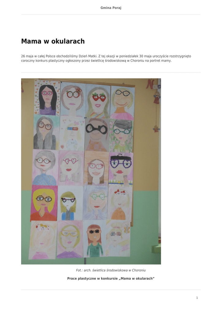 Gmina Poraj Mama w okularach 26 maja w całej Polsce obchodziliśmy Dzień Matki. Z tej okazji w poniedziałek 30 maja uroczyście rozstrzygnięto coroczny konkurs plastyczny ogłoszony przez świetlicę środowiskową w Choroniu na portret mamy. Fot.: arch. świetlica środowiskowa w Choroniu Prace plastyczne w konkursie „Mama w okularach” 1 Gmina Poraj W tym roku tematem przewodnim konkursu plastycznego na portrety najważniejszych w życiu dzieci kobiet były okulary – fantazyjne, bogato zdobione, podkreślające twarz, a nawet „wystające” z pracy i wykonane techniką 3D. Z 34 zgłoszonych, fantastycznych prac, jury w składzie: Anna Trąbska i Paweł Krzyczmonik, reprezentujący Urząd Gminy w Poraju, wyłoniło następujących zwycięzców: ● ● ● Kategoria kl. I-II: Małgosia Popiołek (kl. II Żarki-Letnisko), Ada Kimla (kl. IIc Poraj), Kasia Sikorka (kl. Ic Poraj) Kategoria kl. III-IV: Wiktoria Bdojan (kl. IV świetlica Jastrząb), Nadia Zalejska (kl. IV Choroń), Zosia Wnuk (kl. IV Choroń). Wyróżnienia: Kuba Gadziński (kl. III Choroń), Oliwia Kuźnik (kl. IV Poraj). Wszystkie prace można oglądać w galerii prac plastycznych w świetlicy w Choroniu. 2