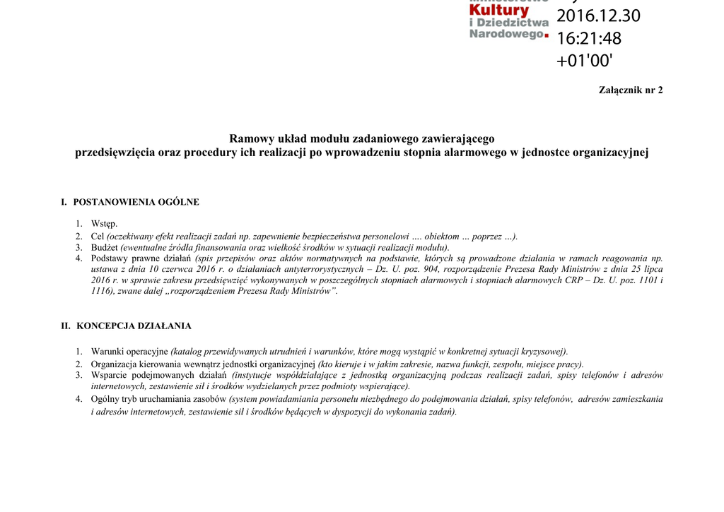 2016.12.30 16:21:48 +01'00' Załącznik nr 2 Ramowy układ modułu zadaniowego zawierającego przedsięwzięcia oraz procedury ich realizacji po wprowadzeniu stopnia alarmowego w jednostce organizacyjnej I. POSTANOWIENIA OGÓLNE 1. 2. 3. 4. Wstęp. Cel (oczekiwany efekt realizacji zadań np. zapewnienie bezpieczeństwa personelowi …. obiektom … poprzez …). Budżet (ewentualne źródła finansowania oraz wielkość środków w sytuacji realizacji modułu). Podstawy prawne działań (spis przepisów oraz aktów normatywnych na podstawie, których są prowadzone działania w ramach reagowania np. ustawa z dnia 10 czerwca 2016 r. o działaniach antyterrorystycznych – Dz. U. poz. 904, rozporządzenie Prezesa Rady Ministrów z dnia 25 lipca 2016 r. w sprawie zakresu przedsięwzięć wykonywanych w poszczególnych stopniach alarmowych i stopniach alarmowych CRP – Dz. U. poz. 1101 i 1116), zwane dalej „rozporządzeniem Prezesa Rady Ministrów”. II. KONCEPCJA DZIAŁANIA 1. Warunki operacyjne (katalog przewidywanych utrudnień i warunków, które mogą wystąpić w konkretnej sytuacji kryzysowej). 2. Organizacja kierowania wewnątrz jednostki organizacyjnej (kto kieruje i w jakim zakresie, nazwa funkcji, zespołu, miejsce pracy). 3. Wsparcie podejmowanych działań (instytucje współdziałające z jednostką organizacyjną podczas realizacji zadań, spisy telefonów i adresów internetowych, zestawienie sił i środków wydzielanych przez podmioty wspierające). 4. Ogólny tryb uruchamiania zasobów (system powiadamiania personelu niezbędnego do podejmowania działań, spisy telefonów, adresów zamieszkania i adresów internetowych, zestawienie sił i środków będących w dyspozycji do wykonania zadań). III. Zestawienie głównych zadań realizowanych w poszczególnych stopniach alarmowych Lp. I I.1.1. Przedsięwzięcia I.1.3 I.2.1. Informowanie o bieżącej sytuacji oraz o zagrożeniach I.3.1. Bieżące kierowanie bezpieczeństwem Ochrona osób oraz obiektów I.5.1 Wykonawca/ koordynator I stopień alarmowy …………… stopień alarmowy jest wprowadzany w przypadku ………….. Otrzymanie informacji lub przyjęcie Wyznaczona osoba** Wprowadzenie zarządzenia Kierownik jednostki organizacyjnej stopnia o wprowadzeniu stopnia alarmowego. (komórki organizacyjnej) alarmowego I.1.2. I.4.1 Zadanie Sprawdzenie procedur Przygotowanie oraz przesłanie kierownikom komórek organizacyjnych komunikatu o wprowadzeniu stopnia alarmowego wraz ze wskazówkami o sposobie jego wykonania. Powiadomienie Biura Dyrektora Generalnego Ministerstwa Kultury i Dziedzictwa Narodowego o wprowadzeniu stopnia alarmowego. Opracowanie oraz rozesłanie kierownikom komórek organizacyjnych informacji o sytuacji bieżącej, źródłach i rodzajach zagrożeń, formach możliwego ataku oraz postępowania w czasie ich zaistnienia. Uwaga: umieścić zadania ujęte w rozdziale I w ust. 1 pkt 3, 4 i 11 załącznika do rozporządzenia Prezesa Rady Ministrów. Przeprowadzenie posiedzenia kierownictwa (grupy ekspertów). Wyznaczona osoba** Kierownik jednostki organizacyjnej (komórki organizacyjnej) Wzmocnienie, w ramach posiadanych sił i środków, ochrony i dozoru obiektu. Uwaga: umieścić zadania ujęte w rozdziale I w ust. 1 pkt 1, 2 i 5-7 załącznika do rozporządzenia Prezesa Rady Ministrów. Przeprowadzenie przeglądu procedur oraz zadań związanych z Nazwa procedury, dokumentu odniesienia*, sposób realizacji Uwagi Przedsięwzięcia realizowane niezwłocznie Z użyciem dostępnych systemów teleinformatycznych oraz łączności. Kierownik jednostki organizacyjnej Rzecznik prasowy*** Zastępca kierownika jednostki organizacyjnej, kierownik komórki organizacyjnej Z użyciem dostępnych systemów teleinformatycznych oraz łączności. „Procedura opracowania oraz przekazywania pracownikom (nazwa jednostki organizacyjnej) …. informacji o sytuacji bieżącej oraz o zagrożeniach” Kierownik jednostki organizacyjnej „Plan posiedzenia kierownictwa (nazwa jednostki organizacyjnej) …” ………………….. „Procedura wzmocnienia ochrony obiektu (nazwa jednostki organizacyjnej) …” ………. ………………….. „Plan ewakuacji stanu osobowego (nazwa jednostki organizacyjnej) …” ………. działania I.6.1 ..…. II II.1. 1. …… . Odwołanie stopnia alarmowego wprowadzaniem wyższych stopni alarmowych. Przeprowadzenie szkolenia uzupełniającego nt. „Ewakuacja załogi z budynku zgodnie z Planem ewakuacji stanu osobowego”. Uwaga: umieścić zadania ujęte w rozdziale I w ust. 1 pkt 8-10 załącznika do rozporządzenia Prezesa Rady Ministrów. Przyjęcie oraz przesłanie kierownikom komórek organizacyjnych zarządzenia o odwołaniu stopnia alarmowego. Opracowanie meldunku sytuacyjnego i przesłanie do Biura Dyrektora Generalnego Ministerstwa Kultury i Dziedzictwa Narodowego. „Procedura postepowania w przypadku informacji o podłożeniu lub zlokalizowaniu urządzenia wybuchowego w obiekcie …: Wyznaczona osoba** Kierownik jednostki organizacyjnej (komórki organizacyjnej) Z użyciem dostępnych systemów teleinformatycznych oraz łączności. Wyznaczona osoba** Kierownik jednostki organizacyjnej (komórki organizacyjnej) II stopień alarmowy …………… stopień alarmowy CRP jest wprowadzany w przypadku ………….. Otrzymanie informacji lub przyjęcie Wyznaczona osoba** Wprowadzenie zarządzenia Kierownik jednostki organizacyjnej stopnia o wprowadzeniu stopnia alarmowego. (komórki organizacyjnej) alarmowego ………… ………………….. ………………… Przedsięwzięcia realizowane niezwłocznie ………………….. …… * – nazwa dokumentu odniesienia (zestawienia, schematu, planu z obszaru bezpieczeństwa) funkcjonującego w jednostce organizacyjnej. ** – osoba wyznaczona przez kierownika jednostki organizacyjnej odpowiedzialna za realizację zadań zarządzania kryzysowego lub zadań wchodzących w skład modułu. *** – osoba wyznaczona przez 