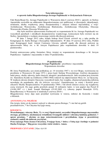Nota informacyjna w sprawie kultu Błogosławionego Jerzego Popiełuszki w Ordynariacie Polowym Fakt Beatyfikacji Ks. Jerzego Popiełuszki w Warszawie dnia 6 czerwca 2010 r. sprawił, że Stolica Apostolska zezwoliła na oddawanie błogosławionemu czci publicznej w diecezjach: inkardynacji, urodzenia, służby wojskowej, pracy duszpasterskiej i miejsca śmierci męczeńskiej, a więc: Archidiecezja Warszawska, Archidiecezja Białostocka, Archidiecezja Olsztyńska, Diecezja Warszawsko-Praska, Diecezja Włocławska. Aby było możliwe sprawowanie Eucharystii ze wspomnienia bł. ks. Jerzego Popiełuszki we wszystkich parafiach i ośrodkach duszpasterstwa wojskowego, koniecznym było zwrócić się do Stolicy Apostolskiej o wydanie stosownego indultu dla diecezji polowej. W dniu 7 lutego 2012 roku, ksiądz biskup Józef Guzek zwrócił się z taką prośbą do Kongergacji ds. Kultu Bożego i Dyscypliny Sakramentów. W dniu 19 czerwca 2012 roku, Prefekt tejże Kongregacji kard. Antoni Canizares Llovera, udzielił zgody dla diecezji polowej na sprawowanie Mszy św. o bł. Jerzym Popiełuszce jako wspomnienie dowolne w dniu 19 października. Poniżej umieszczono pełny formularz Mszy świętej ze wspomnienia dowolnego o bł. Jerzym Popiełuszce - kapłanie i męczenniku w dniu 19 października. 19 października Błogosławionego Jerzego Popiełuszki - prezbitera i męczennika Wspomnienie dowolne Bł. Jerzy Popiełuszko, syn ziemi podlaskiej, ur. 14 września 1947 r. we wsi Okopy, wyświecony na prezbitera w Warszawie 28 maja 1972 r. przez kard. Stefana Wyszyńskiego. Gorliwy duszpasterz ludzi pracy, służby zdrowia, ludzi chorych, ubogich i prześladowanych. Jako rezydent przy kościele św. Stanisława Kostki na Żoliborzu (1980-1984) wsławił się odprawianiem Mszy św. za Ojczyznę. W trudnym okresie dziejów Ojczyzny wszystkich ludzi, bez wyjątku, obejmował pasterską miłością nawołując do pojednania, aby zło dobrem zwyciężać. Zamordowany za wiarę i Kościół przez oficerów Służby Bezpieczeństwa 19 października 1984 r. Od chwili śmierci cieszy się wyjątkową czcią wiernych. Do jego grobu przybyło ponad 18 milionów ludzi, w tym papież Jan Paweł II (14.06.1987 r.) i kard. Joseph Ratzinger (25.05.2002 r.), (obecny papież Benedykt XVI). Beatyfikowany w Warszawie w niedzielę 6 czerwca 2010 r. Błogosławiony Jerzy daje nam przykład wytrwania w wierze, miłości do Kościoła i troski o bliźnich. ANTYFONA NA WEJŚCIE Oto święty, który aż do śmierci walczył w obronie prawa Bożego, * i nie bał się gróźb prześladowców, * bo Chrystus był jego mocą. KOLEKTA Wszechmogący wieczny Boże, Ty w swej Opatrzności, uczyniłeś błogosławionego męczennika Jerzego, prezbitera, niezłomnym świadkiem Ewangelii miłości i obrońcą ludzkiej godności; † spraw prosimy, * abyśmy za jego wstawiennictwem i przykładem, żyjąc w prawdziwej wolności, umieli zło dobrem zwyciężać. Przez naszego Pana Jezusa Chrystusa, Twojego Syna, † który z Tobą żyje i króluje w jedności Ducha Świętego, * Bóg przez wszystkie wieki wieków. Amen. PIERWSZE CZYTANIE 2 Kor. 6,4-10 Niby umierający, a oto żyjemy Czytanie z Drugiego Listu świętego Pawła Apostoła do Koryntian Bracia: Okazujemy się sługami Boga przez wszystko: przez wielką cierpliwość, wśród utrapień, przeciwności i ucisków, w chłostach, więzieniach, podczas rozruchów, w trudach, w nocnych czuwaniach i w postach, przez czystość i umiejętność, przez wielkoduszność i łagodność, przez objawy Ducha Świętego i miłość nieobłudną, przez głoszenie prawdy i moc Bożą, przez oręż sprawiedliwości zaczepny i obronny, wśród czci i pohańbienia, przez dobrą sławę i zniesławienie. Uchodzący za oszustów, a przecież prawdomówni: niby nieznani, a przecież dobrze znani; niby umierający, a oto żyjemy; jakby karceni, lecz nie uśmiercani; jakby smutni, lecz zawsze radośni; jakby ubodzy, a jednak wzbogacający wielu; jako ci, którzy nic nie mają, a posiadają wszystko. Oto słowo Boże. Psalm Responsoryjny Ps. 16(15), 1-2a i 5. 7-8. 11 (R: por 5a) Refren: Pan mym dziedzictwem , moim przeznaczeniem. Zachowaj Mnie, Boże, bo chronię się do Ciebie, * mówię do Pana: «Tyś jest Panem moim». Pan moim dziedzictwem i przeznaczeniem, * to On mój los zabezpiecza. Refren. Błogosławię Pana, który dał mi rozsądek, * bo serce napomina mnie nawet nocą. Zawsze stawiam sobie Pana przed oczy, * On jest po mojej prawicy, nic mnie nie zachwieje. Refren. Ty ściekę życia mi ukażesz, * pełnie Twojej radości i wieczną rozkosz * po Twojej prawicy. Refren Śpiew Przed Ewangelią Mt 5, 10 Aklamacja: Alleluja, alleluja, alleluja. Błogosławieni, którzy cierpią prześladowanie dla sprawiedliwości, albowiem do nich należy królestwo niebieskie. Aklamacja: Alleluja, alleluja, alleluja. EWANGELIA Mt. 10, 17-22 Jezus zapowiada prześladowania † Słowa Ewangelii według świętego Mateusza. Jezus powiedział do swoich Apostołów: «Miejcie się na baczności przed ludźmi. Będą wa s wydawać sądom i w swych synagogach będą was biczować. Nawet przed namiestników i królów będą was wodzić z mego powodu, na świadectwo im i poganom. Kiedy was wydadzą, nie martwcie się o to, jak ani co macie mówić. W owej bowiem godzinie będzie wam poddane, co macie mówić. Gdyż nie wy będziecie mówili, lecz Duch Ojca waszego będzie mówił przez was. Brat wyda brata na śmierć i ojciec syna; dzieci powstaną przeciw rodzicom i o śmierć ich przyprawią. Będziecie w nienawiści u wszystkich z powodu mego imienia. Lecz kto wytrwa do końca, ten będzie zbawiony». Oto słowo Pańskie. MODLITWA NAD DARAMI Boże, nasz Ojcze, uświęć swoim błogosławieństwem złożone dary † i rozpal w nas gorącą miłość ku Tobie,* która dała błogosławionemu Jerzemu, męczennikowi siłę do pokonania cierpień ciała. Przez Chrystusa, Pana Naszego. ANTYFONA NA KOMUNIĘ Mt 16, 24 Jeś