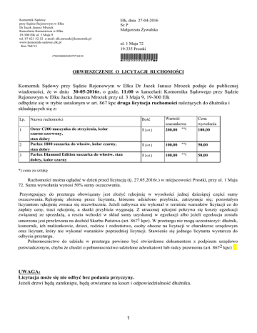 Komornik Sądowy przy Sądzie Rejonowym w Ełku Dr Jacek Janusz Mrozek Kancelaria Komornicza w Ełku 19-300 Ełk ul. 3 Maja 9 tel. 87 621 52 52 e-mail: [email protected] www.komornik-sadowy.elk.pl Km 768/15 #*0020000302079*/0419/ Ełk, dnia 27-04-2016 Sz P Małgorzata Żywulska ul. 1 Maja 72 19-335 Prostki *0020000302079* OBWIESZCZENIE O LICYTACJI RUCHOMOŚCI Komornik Sądowy przy Sądzie Rejonowym w Ełku Dr Jacek Janusz Mrozek podaje do publicznej wiadomości, że w dniu 30-05-2016r. o godz. 11:00 w kancelarii Komornika Sądowego przy Sądzie Rejonowym w Ełku Jacka Janusza Mrozek przy ul. 3 Maja 9, 19-300 Ełk odbędzie się w trybie ustalonym w art. 867 kpc druga licytacja ruchomości należących do dłużnika i składających się z: Lp. Nazwa ruchomości Ilość 1 Oster C200 maszynka do strzyżenia, kolor czarno-czerwony, stan dobry Parlux 1800 suszarka do włosów, kolor czarny, stan dobry Parlux Diamond Edition suszarka do włosów, stan dobry, kolor czarny 1 [szt.] Wartość szacunkowa 200,00 **) 1 [szt.] 100,00 **) 50,00 1 [szt.] 100,00 **) 50,00 2 3 Cena wywołania 100,00 *) cena za sztukę Ruchomości można oglądać w dzień przed licytacją (tj. 27.05.2016r.) w miejscowości Prostki, przy ul. 1 Maja 72. Suma wywołania wynosi 50% sumy oszacowania. Przystępujący do przetargu obowiązany jest złożyć rękojmię w wysokości jednej dziesiątej części sumy oszacowania. Rękojmię złożoną przez licytanta, któremu udzielono przybicia, zatrzymuje się; pozostałym licytantom rękojmię zwraca się niezwłocznie. Jeżeli nabywca nie wykonał w terminie warunków licytacji co do zapłaty ceny, traci rękojmię, a skutki przybicia wygasają. Z utraconej rękojmi pokrywa się koszty egzekucji związanej ze sprzedażą, a reszta wchodzi w skład sumy uzyskanej w egzekucji albo jeżeli egzekucja została umorzona jest przelewana na dochód Skarbu Państwa (art. 8671 kpc). W przetargu nie mogą uczestniczyć: dłużnik, komornik, ich małżonkowie, dzieci, rodzice i rodzeństwo, osoby obecne na licytacji w charakterze urzędowym oraz licytant, który nie wykonał warunków poprzedniej licytacji. Stawienie się jednego licytanta wystarcza do odbycia przetargu. Pełnomocnictwo do udziału w przetargu powinno być stwierdzone dokumentem z podpisem urzędowo poświadczonym, chyba że chodzi o pełnomocnictwo udzielone adwokatowi lub radcy prawnemu (art. 8672 kpc) UWAGA: Licytacja może się nie odbyć bez podania przyczyny. Jeżeli drzwi będą zamknięte, będą otwierane na koszt i odpowiedzialność dłużnika. 1 Komornik Sądowy Dr Jacek Janusz Mrozek Adresat oryginału: Małgorzata Żywulska Do wiadomości: 1. Radca Prawny Kinga Brońska Hoist Polska Sp. z o.o., 54-118 Wrocław 2. Sąd Rejonowy w Ełku, 19-300 Ełk 3. a/a 2