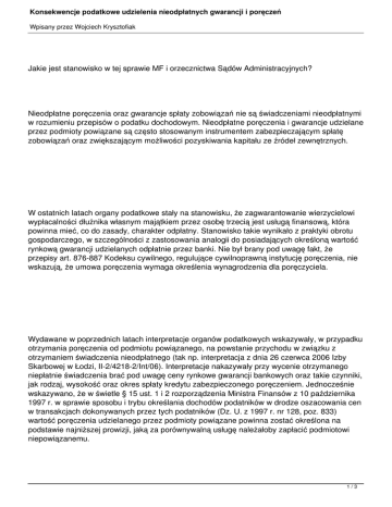 Konsekwencje podatkowe udzielenia nieodpłatnych gwarancji i poręczeń Wpisany przez Wojciech Krysztofiak Jakie jest stanowisko w tej sprawie MF i orzecznictwa Sądów Administracyjnych? Nieodpłatne poręczenia oraz gwarancje spłaty zobowiązań nie są świadczeniami nieodpłatnymi w rozumieniu przepisów o podatku dochodowym. Nieodpłatne poręczenia i gwarancje udzielane przez podmioty powiązane są często stosowanym instrumentem zabezpieczającym spłatę zobowiązań oraz zwiększającym możliwości pozyskiwania kapitału ze źródeł zewnętrznych. W ostatnich latach organy podatkowe stały na stanowisku, że zagwarantowanie wierzycielowi wypłacalności dłużnika własnym majątkiem przez osobę trzecią jest usługą finansową, która powinna mieć, co do zasady, charakter odpłatny. Stanowisko takie wynikało z praktyki obrotu gospodarczego, w szczególności z zastosowania analogii do posiadających określoną wartość rynkową gwarancji udzielanych odpłatnie przez banki. Nie był brany pod uwagę fakt, że przepisy art. 876-887 Kodeksu cywilnego, regulujące cywilnoprawną instytucję poręczenia, nie wskazują, że umowa poręczenia wymaga określenia wynagrodzenia dla poręczyciela. Wydawane w poprzednich latach interpretacje organów podatkowych wskazywały, w przypadku otrzymania poręczenia od podmiotu powiązanego, na powstanie przychodu w związku z otrzymaniem świadczenia nieodpłatnego (tak np. interpretacja z dnia 26 czerwca 2006 Izby Skarbowej w Łodzi, II-2/4218-2/Int/06). Interpretacje nakazywały przy wycenie otrzymanego niepłatnie świadczenia brać pod uwagę ceny rynkowe gwarancji bankowych oraz takie czynniki, jak rodzaj, wysokość oraz okres spłaty kredytu zabezpieczonego poręczeniem. Jednocześnie wskazywano, że w świetle § 15 ust. 1 i 2 rozporządzenia Ministra Finansów z 10 października 1997 r. w sprawie sposobu i trybu określania dochodów podatników w drodze oszacowania cen w transakcjach dokonywanych przez tych podatników (Dz. U. z 1997 r. nr 128, poz. 833) wartość poręczenia udzielanego przez podmioty powiązane powinna zostać określona na podstawie najniższej prowizji, jaką za porównywalną usługę należałoby zapłacić podmiotowi niepowiązanemu. 1/3 Konsekwencje podatkowe udzielenia nieodpłatnych gwarancji i poręczeń Wpisany przez Wojciech Krysztofiak Istotne znaczenie dla zmiany podejścia w tej kwestii miał wyrok WSA w Łodzi z dnia 24 kwietnia 2007 r. (I SA/Łd 2033/06). W wyroku tym Sąd stwierdził, że uzyskanie poręczenia nie jest równoznaczne z nabyciem korzyści majątkowych kosztem poręczyciela: kredytobiorca korzystał odpłatnie ze środków pieniężnych udzielonych przez bank i poręczenie stanowiło jedynie zabezpieczenie zaciągniętego kredytu, a podatnik podatku dochodowego (kredytobiorca) nie uzyskał korzyści majątkowych kosztem poręczyciela. Umowę taką powinno się traktować wyłącznie jako zabezpieczenie zaciągniętego zobowiązania. WSA w Łodzi wskazał ponadto, że osoby prawne poręczające dług ujmują w księgach rachunkowych jednostki w pozycji pozabilansowej „Zobowiązania warunkowe". W przypadku spłaty kredytu przez kredytobiorcę bez realizacji poręczenia, pozycja ulega wyksięgowaniu. Zgodnie z art. 35d ust. 1 pkt 1 ustawy z dnia 29 września 1994 r. o rachunkowości (Dz. U. z 2002 r. Nr 76, poz. 694 ze zm.) jednostki są zobowiązane do tworzenia rezerw na pewne lub o dużym stopniu prawdopodobieństwa przyszłe zobowiązania, których kwotę można w sposób wiarygodny oszacować. W szczególności z przeznaczeniem na straty z transakcji gospodarczych w toku, w tym m.in. z tytułu udzielonych poręczeń. Rezerwy tworzone są jednak nie w związku z udzieleniem poręczenia, a z istotnym pogorszeniem się sytuacji dłużnika. Z tego względu „w chwili zawierania umowy poręczenia nie rodzi ona po stronie poręczyciela żadnych negatywnych skutków materialnych", a po stronie podmiotu, który uzyskał poręczenie, nie powstaje przychód. Wskazany powyżej wyrok wpłynął na stanowisko sądów oraz organów podatkowych. Od maja 2008 wojewódzkie sądy administracyjne wydały kilka wyroków aprobujących stanowisko WSA w Łodzi (np. z dnia 19 czerwca 2008 WSA w Gliwicach, sygn. I SA/Gl 248/08; z dnia 18 czerwca 2008 WSA w Warszawie, sygn. III SA/Wa 665/08; z dnia 20 maja WSA w Gliwicach, I SA/Gl 35/08) w sprawie zaskarżonych interpretacji podatkowych, każdorazowo przychylając się do stanowiska podatników, uznających otrzymane poręczenia za zdarzenia prawne nie powodujące powstania przychodu w rozumieniu art. 12 ustawy o podatku dochodowym od osób prawnych. 2/3 Konsekwencje podatkowe udzielenia nieodpłatnych gwarancji i poręczeń Wpisany przez Wojciech Krysztofiak Obecnie również organy podatkowe, pomimo braku pełnej jednolitości stanowiska w kwestii poręczeń i gwarancji, akceptują tezę o braku powstania przychodu w momencie nieodpłatnego otrzymania poręczenia kredytu bankowego. Przykładem mogą być dwie aktualne interpretacje podatkowe Ministra Finansów (organ upoważniony Dyrektor IS Poznań, ILPR3/423-24/08-2/HS oraz organ upoważniony Dyrektor IS Warszawa, IP-PB3-423-698/08), w których potwierdzono, że zarówno otrzymanie, jak i udzielenie gwarancji lub poręczenia nie rodzi żadnych skutków podatkowych na gruncie przepisów ustawy o podatku dochodowym od osób prawnych. Podnoszono również argument, że „nie wystarczy samo zawarcie umowy o nieodpłatne świadczenie, lecz konieczne jest jej wykonanie". W przypadku gwarancji i poręczeń udzielanych w ramach grupy kapitałowej nie dochodzi do uszczuplenia majątku poręczyciela (do chwili ewentualnej realizacji poręczenia), brak jest zatem kosztu po stronie podmiotu udzielającego poręczenia, a zarazem żaden przychód nie powstaje po stronie podmiotu otrzymującego gwarancje. Wobec zmiany stanowiska Ministerstwa Finansów oraz tworzącej się linii orzeczniczej Sądów Administ