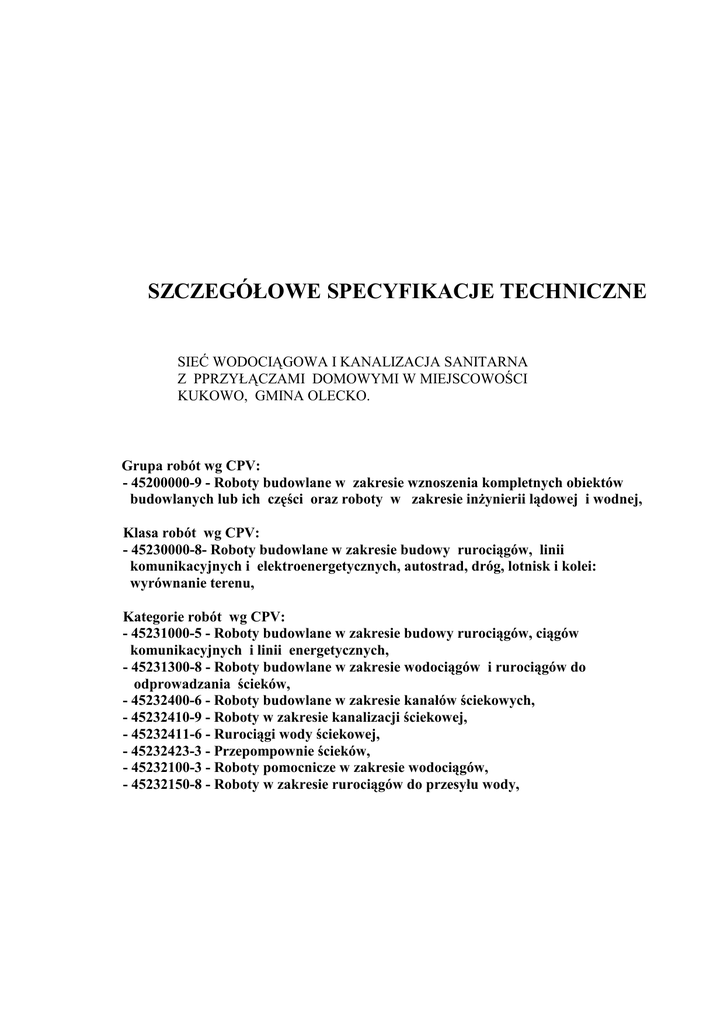 SZCZEGÓŁOWE SPECYFIKACJE TECHNICZNE SIEĆ WODOCIĄGOWA I KANALIZACJA SANITARNA Z PPRZYŁĄCZAMI DOMOWYMI W MIEJSCOWOŚCI KUKOWO, GMINA OLECKO. Grupa robót wg CPV: - 45200000-9 - Roboty budowlane w zakresie wznoszenia kompletnych obiektów budowlanych lub ich części oraz roboty w zakresie inŜynierii lądowej i wodnej, Klasa robót wg CPV: - 45230000-8- Roboty budowlane w zakresie budowy rurociągów, linii komunikacyjnych i elektroenergetycznych, autostrad, dróg, lotnisk i kolei: wyrównanie terenu, Kategorie robót wg CPV: - 45231000-5 - Roboty budowlane w zakresie budowy rurociągów, ciągów komunikacyjnych i linii energetycznych, - 45231300-8 - Roboty budowlane w zakresie wodociągów i rurociągów do odprowadzania ścieków, - 45232400-6 - Roboty budowlane w zakresie kanałów ściekowych, - 45232410-9 - Roboty w zakresie kanalizacji ściekowej, - 45232411-6 - Rurociągi wody ściekowej, - 45232423-3 - Przepompownie ścieków, - 45232100-3 - Roboty pomocnicze w zakresie wodociągów, - 45232150-8 - Roboty w zakresie rurociągów do przesyłu wody, WSTĘP. 1.1 Przedmiot SST. Przedmiotem niniejszej szczególnej specyfikacji technicznej ( SST ) są wymagania dotyczące wykonania i odbioru sieci wodociągowej i kanalizacji sanitarnej z przyłączami domowymi w miejscowości Kukowo, gmina Olecko. 1.2.Zakres stosowania SST. Szczegółowa specyfikacja techniczna ( SST ) jest stosowana jako dokument przetargowy i kontraktowy przy zlecaniu i realizacji robót wymienionych w pkt. 1.1. 1.3.Zakres robót objętych SST. Niniejsza SST obejmuje roboty związane z wykonaniem sieci wodociągowej i kanalizacji sanitarnej z przyłączami domowymi w miejscowości Kukowo, gmina Olecko. 1.4.Ogólne wymagania dotyczące robót. Wykonawca robót jest odpowiedzialny za jakość wykonywanych robót oraz za ich zgodność z dokumentacją projektową, SST, oraz zaleceniami Inwestora. 2. MATERIAŁY. 2.1.Ogólne wymagania dotyczące materiałów. Wszystkie materiały i urządzenia dostarczone na budowę winny posiadać dokumenty świadczące o dopuszczeniu tych wyrobów do obrotu i powszechnego stosowania w budownictwie. Wykonawca zobowiązany jest stosować, w zakresie organizacji produkcji, system zapewniający jednoznaczną identyfikację wyrobu z partią materiału, z którego został wykonany. Wyroby wytworzone w celu zastosowania w obiekcie budowlanym w sposób trwały, o właściwościach uŜytkowych, umoŜliwiających prawidłowo zaprojektowanym wykonanym obiektom budowlanym spełnienie wymagań podstawowych, o których mowa w art. 5 ust. 1 pkt. 1, moŜna stosować przy wykonywaniu robót budowlanych wyłącznie, jeŜeli wyroby te zostały wprowadzone do obrotu zgodnie z przepisami odrębnymi. Prawo budowlane art. 10 (Dz. U. 2006 r., Nr 156, poz. 1118). 2.2.Materiały sieci wodociągowej i przyłączy wodociągowych. 2.2.1.Rury wodociągowe i kształtki. Do wykonania sieci wodociągowej z podłączeniami domowymi naleŜy zastosować następujące materiały: Rury i kształtki PE PN10 PE D 40 - 160 mm(polietylen PE 80)PN 10 SDR 11 zgrzewane elektrooporowo lub doczołowo odporne na ciśnienie 1.0 Mpa. Wszystkie elementy składowe rurociągów wykonywane z tworzyw termoplastycznych (rury, kształtki, złączki, kleje itp.) powinny pod względem jakości spełniać wymagania podane w odpowiednich aktach normatywnych i posiadać odpowiednie certyfikaty. Zgodnie z tymi wymaganiami, rury i kształtki powinny między innymi spełniać następujące warunki: - nie powinny mieć widocznych uszkodzeń (wgnieceń, rys, pęknięć) na powierzchni zewnętrznej - płaszczyzny cięcia przy bosym końcu powinny być prostopadłe do osi rury - wymiary i ich tolerancje powinny być zgodne z podanymi w normach - kaŜda rura i kształtka powinna być fabrycznie oznakowana, z tym Ŝe w przypadku rur powinny być podane następujące podstawowe dane: (np wg ISO 161/1:1978:) - czynnik transportowany - nazwa producenta - rodzaj materiału - oznaczenie szeregu - średnica zewnętrzna w mm - grubość ścianki w mm - data produkcji - rok. m-c. dzień - obowiązująca norma. 2.2.2Armatura i uzbrojenie. UŜyte do budowy sieci wodociągowej materiały muszą spełniać następujące warunki techniczne i jakościowe: 1. Zasuwy – klinowe, korpus i pokrywa - Ŝeliwo sferoidalne, pokrycie - farba epoksydowa zewn. i wewn., trzpień - stal nierdzewna, uszczelnienie - pierścień z gumy NBR, 4 oringi z gumy NBR, klin - Ŝeliwo sferoidalne, śruby pokrywy - stal nierdzewna / zatopione masą na gorąco /. 2. Obejma nawiertki /do nawiercania pod ciśnieniem / Ŝeliwo sferoidalne z powłoką z farby epoksydowej zewn. i wewn., wykładzina wewnętrzna guma SBR, śruby ze stali nierdzewnej, do obejmy wkręcana zasuwa z gwintem zewnętrznym. 3. Obudowy zasuw - teleskopowe / łącznik dolny z Ŝeliwa sferoidalnego, obudowa z rur PE, zawleczka ze stali nierdzewnej wrzeciono - pręt stalowy ocynkowany. 4. Łączniki Ŝeliwne - Ŝeliwo sferoidalne epoksydowane. 5. Hydranty - kolumna hydrantu z Ŝeliwa sferoidalnego, zespół uruchamiający ze stali nierdzewnej, głowica zabezpieczona farbą epoksydową. 6. Wodomierze / kompatybilne z systemem działającym w PWIK Sp. z o.o. w Olecku (np. Wodnik II ) z modułem radiowym IZAR CP/3,5 - wodomierze sieciowe i sprzęŜone z przesyłem danych. 7. Skrzynki na zasuwach - Korpus - Pa+ , pokrywa - GG . 8. Regulatory ciśnienia - Ŝeliwo sferoidalne epoksydowane, optyczny wskaźnik połoŜenia, gniazdo, przeciwgniazdo i trzpień ze stali nierdzewnej, przewody sterujące ze stali nierdzewnej . 9. Studnie wodomierzowe z PEHD z wbudowanymi stopniami włazowymi. 2.3.Materiały kanalizacji sanitarnej. 2.3.1.Rury kanalizacyjne, kształtki, studzienki. Do wykonania kanalizacji sanitarnej grawitacyjnej naleŜy zastosować następujące materiały: Rurociągi kanalizacyjne wykonać z rur kanalizacyjnych z PVC, kielichowych klasy S (8 kN/m2)D 200 x 6000 mm, łączonych na uszczelkę wargową. W przypadku odległo