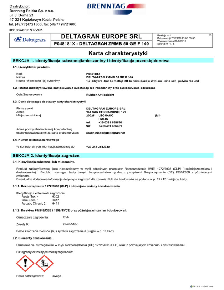 Dystrybutor: Brenntag Polska Sp. z o.o. ul. J. Bema 21 47-224 Kędzierzyn-Koźle, Polska tel. (48/77)4721500, fax (48/77)4721600 kod towaru: 517206 DELTAGRAN EUROPE SRL P048181X - DELTAGRAN ZMMB 50 GE F 140 ... / >> ... ochrony / >> ....../ >> / >> SEKCJA 16. 2. Kontrola 5. 8. 14. Identyfikacja Postępowanie Informacje Inne informacje. narażenia/środki dotyczące zagrożeń. w przypadku transportu. pożaru.indywidualnej. Rewizja nr1 Data rewizji 23/03/2015 00:00:00 Wydrukowano 25/9/2015 Strona nr 1 2/8 3 4 5 6 7 8 0 PL ... / >> Karta charakterystyki H302 Działa szkodliwie posąpołknięciu. Żaden. Uwaga Zwroty OCHRONA wskazujące dla drogowy uzytkownika: SKÓRYroboczą rodzaj zagrożenia: Informacje Stosować odzież zawarte wlub niniejszej z długimi karcie oparte rękawami o iwiedzę, obuwie którą ochronne dysponujemy dla celówna profesjonalnych dzień opracowania kategorii ostatniej II (p. wersji Dyrektywa karty.89/686/CEE i norma EN Transport kolejowy: SEKCJA 11. 16. Informacje Inne informacje. toksykologiczne. H317 Może powodować reakcję alergiczną skóry.wodą ISO Uzytkownik 20344). powinien Pozagrożenia zdjęciu sprawdzić, odzieży ochronnej czy podane informacje są prawidłowe ciała i wyczerpujące i mydłem. w stosunku do specyficznego zastosowania produktu. Klasa ADR/RID: 9 wymyć UN:powierzchnię 3077 5.2. Szczególne związane z substancją lub mieszaniną. H411 Działa toksycznie organizmy wodne, powodując długotrwałe skutki. OCHRONA Niniejszego dokumentu nieskutków wolno utozsamić gwarancją dowolnej własciwosci produktu. Grupa pakowania: III na ZAGROŻENIA ZWIĄZANE Z EKSPOZYCJĄ POŻAR2-3 SEKCJA 1.OCZU Identyfikacja ispecyficznej identyfikacja przedsiębiorstwa Tekst wskazówek zagrożenia (H), substancji/mieszaniny podanych wzNA rozdziale niniejszej karty: 11.1. Informacje dotyczące toksykologicznych. Zaleca Poniewaz się stosować producent okulary nie ma ochronne mozliwosci w szczelnej bezposredniej obudowie kontroli (p. norma nad EN uzyciem 166). produktu, uzytkownik obowiązek dostosować się na własną Etykietka: 9 Unikać wdychania produktów rozkładu. Produkt jest łatwopalny, dane stężenie pyłu rozproszonego wma powietrzu ze źródłem w pobliżu Informacje toksykologiczne dotyczące wzajemnego oddziaływania substancji w mieszaninie są niedostępne, ewentualne skutkizapłonu wywierane na Zwroty wskazujące ostrożności: 1.1.może Identyfikator produktu W odpowiedzialnosć do prawa zagrożonej imieszaniny zarządzeń obowiązujących rozpryzkami w sprawie powstałych higieny izgodnie bezpieczeństwa. w niezamierzonego zależności od Producent wykonanych niesię prac, bierze należy na siebie przewidzieć zadnej HIN -przypadku Kemler: 90 rozbryzgami wytworzyć zśrodki powietrzem wybuchowe. Produkt stały, w przypadku wydostania zodnośnie pojemnika, narażony Acute Tox. 4 ekspozycji Toksyczność ostra, kategorii 4 lubzawartych zdrowie wymienia się na podstawie właściwości substancji w mieszaninie z obowiązującymi przepisami do P264 Dokładnie umyć . . . po użyciu. stosowną odpowiedzialnosci ochronę błon niewłasciwe śluzowych zastosowanie (usta, nos, produktu. celem zapobiegania przypadkowego wchłaniania. Limited 5źródła kg oczy) na wysokie temperatury lubDziałanie w kontakcie zapłonu, może wywołać lub rozprzestrzenić pożar. Skin Quantities. Sens. 1 za uczulające na skórę, kategorii 1 klasyfikacji. P273 Unikać uwolnienia dowyznaczonym środowiska. Kod: P048181X OCHRONA Zapewnić odpowiednie DRÓG ODDECHOWYCH osobom do wmanipulacji produktów chemicznych. Kodeks ograniczenia tunelu. (E)skutków Aquatic Chronic 2w przeszkolenie Stwarzające zagrożenie dla środowiska wodnego, przewlekła toksyczność, kategorii 2 Zamieszcza się informacje dotyczące tych dla zdrowia odniesieniu do stężeń substancji wskazanych w sekcji 3, P280 Stosować rękawice ochronne / odzież ochronną / ochronę oczu / ochronę niebezpiecznych twarzy. Nazwa DELTAGRAN ZMMBchemicznego. 50 GE F 140 wymagane, ile niesubstancję. wskazano inaczej odnośnie do ewaluacji ryzyka techniczna. ENVIRONMENTALLY HAZARDOUS SUBSTANCE, SOLID, N.O.S. (1,3-dihydro-4(or 5.3.Nie Informacje dlaokażdą straży pożarnej. H302 Działa szkodliwie po połknięciu. oddzielnie przez P301+P312 W PRZYPADKU POŁKNIĘCIA: w przypadku złego samopoczucia skontaktować się z OŚRODKIEM ZATRUĆ lub z Nazwa i jej synonimy zinc salt polymerbound H317chemiczna KONTROLE NARAŻENIA ŚRODOWISKA. Może powodować reakcję1,3-dihydro-4(or alergiczną skóry.5)-methyl-2H-benzimidazole-2-thione, WSKAZÓWKI OGÓLNE 5)-methyl-2H-benzimidazole-2-thione, zinc salt) lekarzem. H411 Działa toksycznie na organizmy wodne,produktu powodując długotrwałe skutki.roboczych, Należy wykonywać pomiary emisji wynikających zrozkładowi urządzeń wentylacyjnych z procesów zgodnie z rozporządzeniami Pojemniki chłodzić strumieniami wody, aby zapobiec i powstaniu substancji potencjalnie szkodliwych dla zdrowia. w sprawie Efekty ostre: produkt jestWszkodliwy przy spozyciu nawet minimalnej i i moze spowodować P302+P352 PRZYPADKU KONTAKTU ZE SKÓRĄ: umyćilosci dużą ilością wody z mydłem. powazne dolegliwosci zdrowotne (bolesci 1.2.Wyposażenie Istotne zidentyfikowane zastosowania substancji mieszaniny orazwzastosowania odradzane ochrony ochrony należy lub stosować zawsze komplecie. Zebrać mieszaninę gaśniczą nie odprowadzając do Transport morski: brzucha,środowiska. mdłosci, wymioty,przeciwpożarowej biegunkę itp.). Tekst zdań oznakowania ryzyka (R),i podanych w rozdziale 2-3 niniejszej Nie odprowadzać pozostałości produktu do kanalizacji ściekowej lub wód powierzchniowych. kanalizacji. Zanieczyszczoną pozostałości gaśnicze skierować dokarty: zniszczenia zgodnie z obowiązującymi normami. Zawiera: Produkt przy kontakcie ze wodę skórą wywołuje uczulenie (dotykowe zapalenie skóry). Zapalenie skóry występuje na początku w miejscach Opis/Zastosowanie 