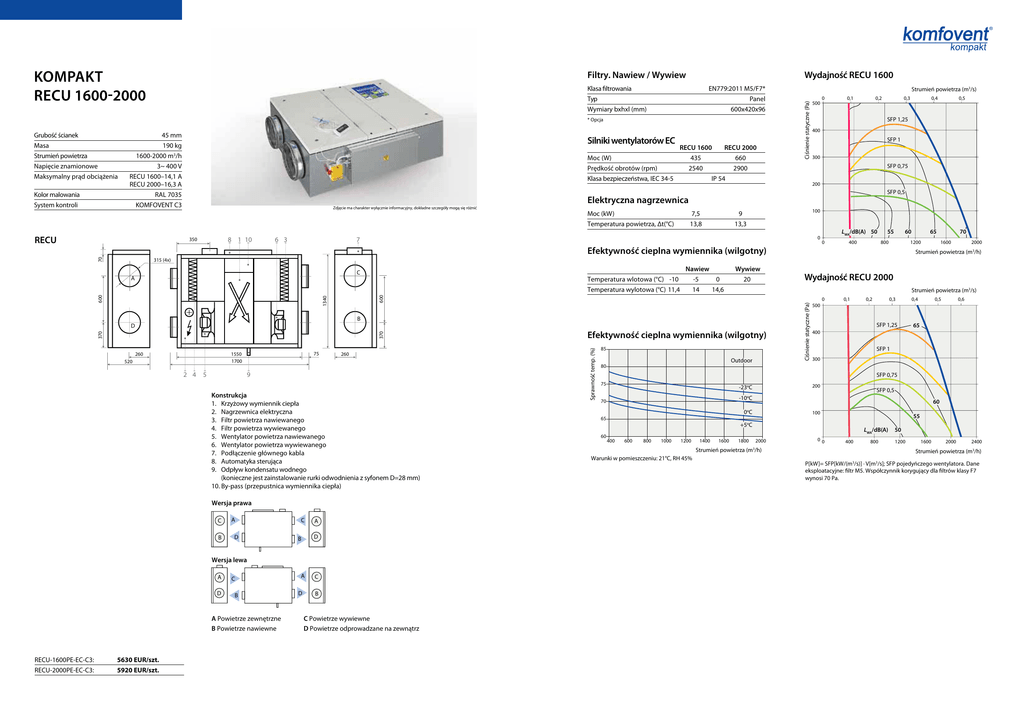 Filtry. Nawiew / Wywiew Wydajność RECU 1600 Klasa filtrowania Typ Wymiary bxhxl (mm) EN779:2011 M5/F7* Panel 600x420x96 * Opcja Grubość ścianek Masa Strumień powietrza 45 mm 190 kg 1600-2000 m3/h Napięcie znamionowe Maksymalny prąd obciążenia Kolor malowania System kontroli Silniki wentylatorów EC RECU 1600 RECU 2000 Moc (W) 435 660 Prędkość obrotów (rpm) 2540 2900 Klasa bezpieczeństwa, IEC 34-5 IP 54 3~ 400 V RECU 1600–14,1 A RECU 2000–16,3 A RAL 7035 KOMFOVENT C3 0 0,1 0,2 0,3 SFP 1,25 SFP 1 300 SFP 0,75 200 SFP 0,5 Zdjęcie ma charakter wyłącznie informacyjny, dokładne szczegóły mogą się różnić 8 1 10 350 70 0,5 400 6 3 7,5 13,8 100 9 13,3 0 7 LWA/dB(A) 50 0 400 55 60 800 65 1200 Efektywność cieplna wymiennika (wilgotny) 70 1600 2000 Strumień powietrza (m3/h) 315 (4x) С Nawiew -5 0 14 14,6 Wywiew 20 0 B 75 1550 1700 520 2 4 5 260 9 Konstrukcja 1. Krzyżowy wymiennik ciepła 2. Nagrzewnica elektryczna 3. Filtr powietrza nawiewanego 4. Filtr powietrza wywiewanego 5. Wentylator powietrza nawiewanego 6. Wentylator powietrza wywiewanego 7. Podłączenie głównego kabla 8. Automatyka sterująca 9. Odpływ kondensatu wodnego (konieczne jest zainstalowanie rurki odwodnienia z syfonem D=28 mm) 10. By-pass (przepustnica wymiennika ciepła) Wersja prawa C B A D C A D B Wersja lewa A D C B A Powietrze zewnętrzne B Powietrze nawiewne 5630 EUR/szt. 5920 EUR/szt. A D C B C Powietrze wywiewne D Powietrze odprowadzane na zewnątrz Efektywność cieplna wymiennika (wilgotny) Sprawność temp. (%) 370 370 D 260 Wydajność RECU 2000 Strumień powietrza (m3/s) 600 1340 600 Temperatura wlotowa (°C) -10 Temperatura wylotowa (°C) 11,4 85 Outdoor Ciśnienie statyczne (Pa) A RECU-1600PE-EC-C3: RECU-2000PE-EC-C3: 0,4 500 Elektryczna nagrzewnica Moc (kW) Temperatura powietrza, Δt(°C) RECU Strumień powietrza (m3/s) Ciśnienie statyczne (Pa) KOMPAKT 0,1 0,2 0,3 0,4 0,5 0,6 500 SFP 1,25 65 400 SFP 1 300 80 SFP 0,75 75 200 o -23 C SFP 0,5 -10oC 70 60 0oC 100 55 65 +5oC 60 400 600 800 1000 1200 1400 1600 1800 LWA/dB(A) 2000 Strumień powietrza (m3/h) Warunki w pomieszczeniu: 21°C, RH 45% 00 400 800 50 1200 1600 2000 2400 Strumień powietrza (m3/h) P[kW]= SFP[kW/(m3/s)] · V[m3/s]; SFP pojedyńczego wentylatora. Dane eksploatacyjne: filtr M5. Współczynnik korygujący dla filtrów klasy F7 wynosi 70 Pa.