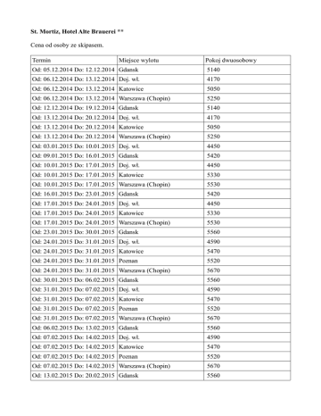St. Mortiz, Hotel Alte Brauerei ** Cena od osoby ze skipasem. Termin Miejsce wylotu Pokoj dwuosobowy Od: 05.12.2014 Do: 12.12.2014 Gdansk 5140 Od: 06.12.2014 Do: 13.12.2014 Doj. wł. 4170 Od: 06.12.2014 Do: 13.12.2014 Katowice 5050 Od: 06.12.2014 Do: 13.12.2014 Warszawa (Chopin) 5250 Od: 12.12.2014 Do: 19.12.2014 Gdansk 5140 Od: 13.12.2014 Do: 20.12.2014 Doj. wł. 4170 Od: 13.12.2014 Do: 20.12.2014 Katowice 5050 Od: 13.12.2014 Do: 20.12.2014 Warszawa (Chopin) 5250 Od: 03.01.2015 Do: 10.01.2015 Doj. wł. 4450 Od: 09.01.2015 Do: 16.01.2015 Gdansk 5420 Od: 10.01.2015 Do: 17.01.2015 Doj. wł. 4450 Od: 10.01.2015 Do: 17.01.2015 Katowice 5330 Od: 10.01.2015 Do: 17.01.2015 Warszawa (Chopin) 5530 Od: 16.01.2015 Do: 23.01.2015 Gdansk 5420 Od: 17.01.2015 Do: 24.01.2015 Doj. wł. 4450 Od: 17.01.2015 Do: 24.01.2015 Katowice 5330 Od: 17.01.2015 Do: 24.01.2015 Warszawa (Chopin) 5530 Od: 23.01.2015 Do: 30.01.2015 Gdansk 5560 Od: 24.01.2015 Do: 31.01.2015 Doj. wł. 4590 Od: 24.01.2015 Do: 31.01.2015 Katowice 5470 Od: 24.01.2015 Do: 31.01.2015 Poznan 5520 Od: 24.01.2015 Do: 31.01.2015 Warszawa (Chopin) 5670 Od: 30.01.2015 Do: 06.02.2015 Gdansk 5560 Od: 31.01.2015 Do: 07.02.2015 Doj. wł. 4590 Od: 31.01.2015 Do: 07.02.2015 Katowice 5470 Od: 31.01.2015 Do: 07.02.2015 Poznan 5520 Od: 31.01.2015 Do: 07.02.2015 Warszawa (Chopin) 5670 Od: 06.02.2015 Do: 13.02.2015 Gdansk 5560 Od: 07.02.2015 Do: 14.02.2015 Doj. wł. 4590 Od: 07.02.2015 Do: 14.02.2015 Katowice 5470 Od: 07.02.2015 Do: 14.02.2015 Poznan 5520 Od: 07.02.2015 Do: 14.02.2015 Warszawa (Chopin) 5670 Od: 13.02.2015 Do: 20.02.2015 Gdansk 5560 Od: 14.02.2015 Do: 21.02.2015 Doj. wł. 4590 Od: 14.02.2015 Do: 21.02.2015 Katowice 5470 Od: 14.02.2015 Do: 21.02.2015 Poznan 5520 Od: 14.02.2015 Do: 21.02.2015 Warszawa (Chopin) 5670 Od: 20.02.2015 Do: 27.02.2015 Gdansk 5560 Od: 21.02.2015 Do: 28.02.2015 Doj. wł. 4590 Od: 21.02.2015 Do: 28.02.2015 Katowice 5470 Od: 21.02.2015 Do: 28.02.2015 Poznan 5520 Od: 21.02.2015 Do: 28.02.2015 Warszawa (Chopin) 5670 Od: 27.02.2015 Do: 06.03.2015 Gdansk 5560 Od: 28.02.2015 Do: 07.03.2015 Doj. wł. 4590 Od: 28.02.2015 Do: 07.03.2015 Katowice 5470 Od: 28.02.2015 Do: 07.03.2015 Poznan 5520 Od: 28.02.2015 Do: 07.03.2015 Warszawa (Chopin) 5670 Od: 06.03.2015 Do: 13.03.2015 Gdansk 5560 Od: 07.03.2015 Do: 14.03.2015 Doj. wł. 4590 Od: 07.03.2015 Do: 14.03.2015 Katowice 5470 Od: 07.03.2015 Do: 14.03.2015 Poznan 5520 Od: 07.03.2015 Do: 14.03.2015 Warszawa (Chopin) 5670 Od: 13.03.2015 Do: 20.03.2015 Gdansk 5460 Od: 14.03.2015 Do: 21.03.2015 Doj. wł. 4470 Od: 14.03.2015 Do: 21.03.2015 Katowice 5350 Od: 14.03.2015 Do: 21.03.2015 Poznan 5400 Od: 14.03.2015 Do: 21.03.2015 Warszawa (Chopin) 5550 Od: 20.03.2015 Do: 27.03.2015 Gdansk 5420 Od: 21.03.2015 Do: 28.03.2015 Doj. wł. 4450 Od: 21.03.2015 Do: 28.03.2015 Katowice 5330 Od: 21.03.2015 Do: 28.03.2015 Warszawa (Chopin) 5530 Od: 27.03.2015 Do: 03.04.2015 Gdansk 5420 Od: 28.03.2015 Do: 04.04.2015 Doj. wł. 4450 Od: 28.03.2015 Do: 04.04.2015 Katowice 5330 Od: 28.03.2015 Do: 04.04.2015 Warszawa (Chopin) 5530