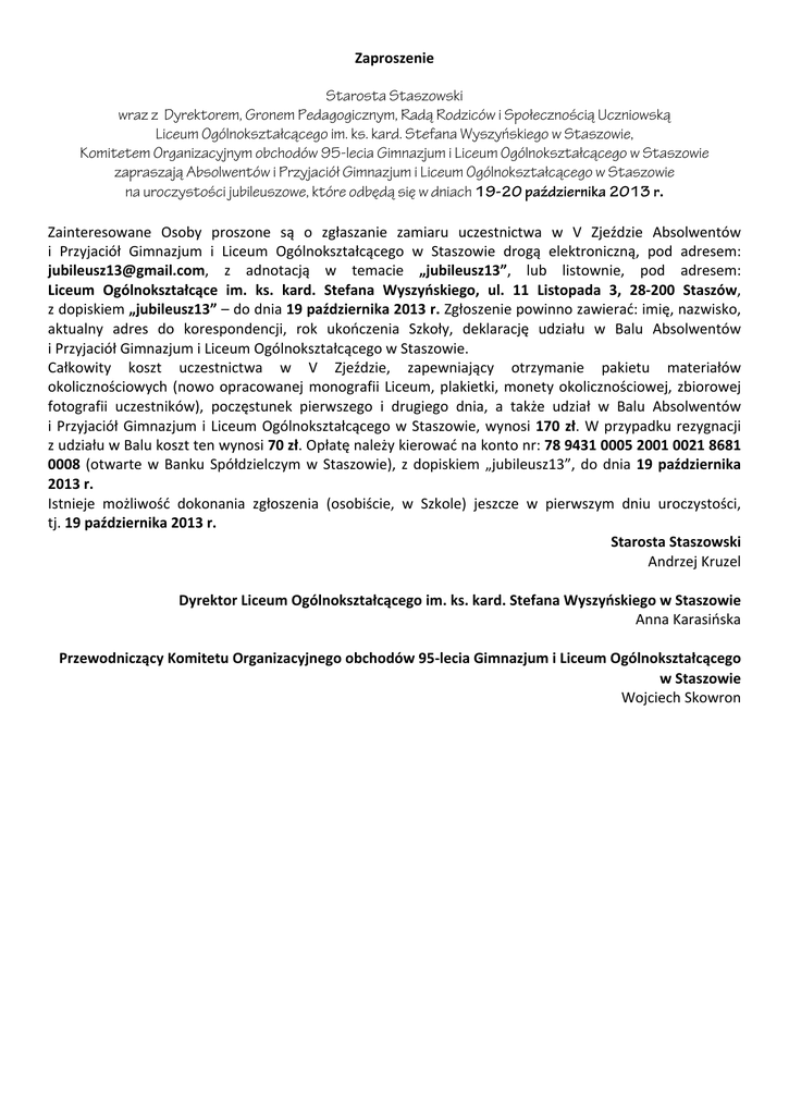 Zaproszenie Starosta Staszowski wraz z Dyrektorem, Gronem Pedagogicznym, Radą Rodziców i Społecznością Uczniowską Liceum Ogólnokształcącego im. ks. kard. Stefana Wyszyńskiego w Staszowie, Komitetem Organizacyjnym obchodów 95-lecia Gimnazjum i Liceum Ogólnokształcącego w Staszowie zapraszają Absolwentów i Przyjaciół Gimnazjum i Liceum Ogólnokształcącego w Staszowie na uroczystości jubileuszowe, które odbędą się w dniach 19-20 października 2013 r. Zainteresowane Osoby proszone są o zgłaszanie zamiaru uczestnictwa w V Zjeździe Absolwentów i Przyjaciół Gimnazjum i Liceum Ogólnokształcącego w Staszowie drogą elektroniczną, pod adresem: [email protected], z adnotacją w temacie „jubileusz13”, lub listownie, pod adresem: Liceum Ogólnokształcące im. ks. kard. Stefana Wyszyńskiego, ul. 11 Listopada 3, 28-‐200 Staszów, z dopiskiem „jubileusz13” – do dnia 19 października 2013 r. Zgłoszenie powinno zawierać: imię, nazwisko, aktualny adres do korespondencji, rok ukończenia Szkoły, deklarację udziału w Balu Absolwentów i Przyjaciół Gimnazjum i Liceum Ogólnokształcącego w Staszowie. Całkowity koszt uczestnictwa w V Zjeździe, zapewniający otrzymanie pakietu materiałów okolicznościowych (nowo opracowanej monografii Liceum, plakietki, monety okolicznościowej, zbiorowej fotografii uczestników), poczęstunek pierwszego i drugiego dnia, a także udział w Balu Absolwentów i Przyjaciół Gimnazjum i Liceum Ogólnokształcącego w Staszowie, wynosi 170 zł. W przypadku rezygnacji z udziału w Balu koszt ten wynosi 70 zł. Opłatę należy kierować na konto nr: 78 9431 0005 2001 0021 8681 0008 (otwarte w Banku Spółdzielczym w Staszowie), z dopiskiem „jubileusz13”, do dnia 19 października 2013 r. Istnieje możliwość dokonania zgłoszenia (osobiście, w Szkole) jeszcze w pierwszym dniu uroczystości, tj. 19 października 2013 r. Starosta Staszowski Andrzej Kruzel Dyrektor Liceum Ogólnokształcącego im. ks. kard. Stefana Wyszyńskiego w Staszowie Anna Karasińska Przewodniczący Komitetu Organizacyjnego obchodów 95-‐lecia Gimnazjum i Liceum Ogólnokształcącego w Staszowie Wojciech Skowron Program uroczystości jubileuszowych z okazji 95-‐lecia Gimnazjum i Liceum Ogólnokształcącego im. ks. kard. Stefana Wyszyńskiego w Staszowie 19 października 2013 r. (sobota) 10.00 – Rejestracja uczestników Zjazdu Absolwentów i Przyjaciół Gimnazjum i Liceum 10.30 Ogólnokształcącego w Staszowie. Rozdanie uczestnikom Zjazdu pakietu materiałów okolicznościowych. 10.30 Zbiórka uczestników uroczystości przed budynkiem Liceum Ogólnokształcącego im. ks. kard. Stefana Wyszyńskiego. Uformowanie pochodu. 10.45 Przemarsz uczestników uroczystości do kościoła p.w. Ducha Świętego. 11.00 Msza św. 12.30 Przemarsz uczestników uroczystości do budynku Liceum Ogólnokształcącego im. ks. kard. Stefana Wyszyńskiego. Rejestracja uczestników Zjazdu Absolwentów i Przyjaciół Gimnazjum i Liceum Ogólnokształcącego w Staszowie. Rozdanie uczestnikom Zjazdu pakietu materiałów okolicznościowych. Multimedialna prezentacja dziejów Szkoły. Poczęstunek. 13.00 Część oficjalna uroczystości jubileuszowych: wprowadzenie sztandaru Szkoły, odśpiewanie hymnu narodowego, odtańczenie poloneza przez uczniów, przemówienie Dyrektora Szkoły, złożenie kwiatów przed epitafiami zmarłych nauczycieli oraz przed popiersiem Patrona Szkoły – ks. kard. Stefana Wyszyńskiego, przekazanie symbolicznego klucza do Szkoły Przewodniczącemu Komitetu Organizacyjnego obchodów 95-‐lecia Szkoły, przemówienia zaproszonych gości, prezentacja nowej monografii Liceum, wyprowadzenie sztandaru Szkoły. 14.30 Część artystyczna: spektakl teatralny „O sztuce harmonii” (na motywach „Poskromienia złośnicy” Williama Szekspira) z udziałem uczniów. Montaż poetycko-‐muzyczny „Rozmawiamy i śpiewamy wierszem”. 16.00 Zbiorowa fotografia uczestników Zjazdu. 19.00 Bal Absolwentów i Przyjaciół Gimnazjum i Liceum Ogólnokształcącego w Staszowie w restauracji „Lord” w Staszowie, ul. Nasienna 8. 20 października 2013 r. (niedziela) 11.00 Rozdanie uczestnikom Zjazdu Absolwentów i Przyjaciół Gimnazjum i Liceum Ogólnokształcącego w Staszowie zbiorowej fotografii wykonanej w dniu poprzednim. Poczęstunek. 11.30 Interdyscyplinarne, międzypokoleniowe zajęcia dydaktyczne w auli szkolnej, pt. „Rozmowy o życiu”. 12.00 Oficjalne zakończenie uroczystości jubileuszowych: zwrócenie symbolicznego klucza do Szkoły przez Przewodniczącego Komitetu Organizacyjnego obchodów 95-‐lecia Szkoły na ręce Dyrektora. od Zwiedzanie Szkoły przez uczestników Zjazdu Absolwentów i Przyjaciół Gimnazjum i Liceum 12.15 Ogólnokształcącego w Staszowie. Spotkania z wychowawcami i nauczycielami. Uroczystości towarzyszyć będzie wystawa prac plastycznych i fotograficznych absolwentów Szkoły, zatytułowana „Świat oczami Absolwentów staszowskiego Ogólniaka”. Podczas Zjazdu zostanie proklamowana działalność Klubu Absolwenta Gimnazjum i Liceum Ogólnokształcącego w Staszowie.
