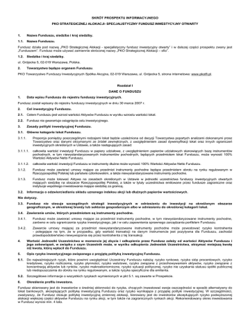 SKRÓT PROSPEKTU INFORMACYJNEGO PKO STRATEGICZNEJ ALOKACJI- SPECJALISTYCZNY FUNDUSZ INWESTYCYJNY OTWARTY 1. Nazwa Funduszu, siedziba i kraj siedziby. 1.1. Nazwa Funduszu. Fundusz działa pod nazwą „PKO Strategicznej Alokacji - specjalistyczny fundusz inwestycyjny otwarty” i w dalszej części prospektu zwany jest „Funduszem”. Fundusz może używać zamiennie skróconej nazwy „PKO Strategicznej Alokacji – sfio”. 1.2. Siedziba i kraj siedziby. ul. Grójecka 5, 02-019 Warszawa, Polska. 2. Towarzystwo będące organem Funduszu. PKO Towarzystwo Funduszy Inwestycyjnych Spółka Akcyjna, 02-019 Warszawa, ul. Grójecka 5, strona internetowa: www.pkotfi.pl. Rozdział I DANE O FUNDUSZU 1. Data wpisu Funduszu do rejestru funduszy inwestycyjnych. Fundusz został wpisany do rejestru funduszy inwestycyjnych w dniu 30 marca 2007 r. 2. Cel inwestycyjny Funduszu. 2.1. Celem Funduszu jest wzrost wartości Aktywów Funduszu w wyniku wzrostu wartości lokat. 2.2. Fundusz nie gwarantuje osiągnięcia celu inwestycyjnego. 3. Zasady polityki inwestycyjnej Funduszu. 3.1. Główne kategorie lokat Funduszu. 3.1.1. Proporcja pomiędzy poszczególnymi rodzajami lokat będzie uzależniona od decyzji Towarzystwa popartych analizami dokonanymi przez Towarzystwo oraz danymi otrzymanymi ze źródeł zewnętrznych, z uwzględnieniem zasad dywersyfikacji lokat oraz innych ograniczeń inwestycyjnych określonych w Ustawie, a także następujących zasad: 3.1.1.1. całkowita wartość inwestycji Funduszu w papiery udziałowe, z uwzględnieniem papierów udziałowych stanowiących bazę instrumentów pochodnych, w tym niewystandaryzowanych instrumentów pochodnych, będących przedmiotem lokat Funduszu, może wynosić 100% Wartości Aktywów Netto Funduszu. 3.1.1.2. całkowita wartość inwestycji Funduszu w instrumenty dłużne może wynosić 100% Wartości Aktywów Netto Funduszu. 3.1.2. Fundusz może zawierać umowy mające za przedmiot instrumenty pochodne będące przedmiotem obrotu na rynku regulowanym w Rzeczypospolitej Polskiej lub państwie członkowskim, a także niewystandaryzowane instrumenty pochodne. 3.1.3. Fundusz może lokować Aktywa na zasadach określonych w Ustawie w jednostki uczestnictwa funduszy inwestycyjnych otwartych mających siedzibę na obszarze Rzeczypospolitej Polskiej, a także w tytuły uczestnictwa emitowane przez fundusze zagraniczne oraz instytucje wspólnego inwestowania mające siedzibę za granicą. 3.2. Informacja o odzwierciedlaniu składu uznanego indeksu akcji lub dłużnych papierów wartościowych. Nie dotyczy. 3.3. Fundusz nie stosuje szczególnych strategii inwestycyjnych w odniesieniu do inwestycji na określonym obszarze geograficznym, w określonej branży lub sektorze gospodarczym albo w odniesieniu do określonej kategorii lokat. 3.4. Zawieranie umów, których przedmiotem są instrumenty pochodne. 3.4.1. Fundusz może zawierać umowy mające za przedmiot instrumenty pochodne, w tym niewystandaryzowane instrumenty pochodne, zarówno w celu ograniczenia ryzyka inwestycyjnego, jak i w celu zapewnienia sprawnego zarządzania portfelem Funduszu. 3.4.2. Zawarcie umowy mającej za przedmiot niewystandaryzowane instrumenty pochodne może powodować ryzyko kontrahenta - polegające na tym, że w przypadku, gdy wartość transakcji na danym instrumencie jest pozytywna dla Funduszu, zachodzi prawdopodobieństwo niewywiązania się przez kontrahenta z tej transakcji. 4. Wartość Jednostki Uczestnictwa w momencie jej zbycia i odkupienia przez Fundusz zależy od wartości Aktywów Funduszu i jego zobowiązań, w związku z czym Uczestnik może, w wyniku odkupienia Jednostek Uczestnictwa, otrzymać mniejszą kwotę niż kwota, którą wpłacił do Funduszu. 5. Opis ryzyka inwestycyjnego związanego z przyjętą polityką inwestycyjną Funduszu. 5.1. Do najważniejszych ryzyk, które powinni uwzględniać Uczestnicy Funduszu należą: ryzyko rynkowe, ryzyko stóp procentowych, ryzyko kredytowe, ryzyko rozliczenia, ryzyko płynności, ryzyko walutowe, ryzyko związane z przechowywaniem aktywów, ryzyko związane z koncentracją aktywów lub rynków, ryzyko makroekonomiczne, ryzyko sytuacji politycznej, ryzyko nie uzyskania statusu spółki publicznej lub niedopuszczenia do obrotu na rynku regulowanym, a także ryzyka specyficzne dla emitenta. 5.2. Szczegółowe informacje o wszystkich ryzykach wymienionych w pkt 5.1. są zawarte w Prospekcie. 6. Określenie profilu inwestora. Fundusz skierowany jest do inwestorów o średniej skłonności do ryzyka, chcących inwestować swoje oszczędności w sposób alternatywny do lokat bankowych, akceptujących politykę inwestycyjną Funduszu oraz ryzyko wynikające z przyjętej polityki inwestycyjnej. W szczególności, zważywszy, że Fundusz stosuje politykę inwestycyjną zmiennej alokacji, kierowany jest do inwestorów akceptujących ryzyko podwyższonej alokacji większej części aktywów Funduszu na rynku akcji, w tym także na zagranicznych rynkach akcji. Rekomendowany okres inwestowania w Fundusz wynosi min. 4 lata. 7. Informacja o obowiązkach podatkowych. 7.1. Informacje o obowiązkach podatkowych Uczestników Funduszu są zawarte w Prospekcie. 7.2. Ze względu na fakt, że obowiązki podatkowe zależą od indywidualnej sytuacji Uczestnika Funduszu i miejsca dokonywania inwestycji, w celu ustalenia obowiązków podatkowych wskazane jest zasięgnięcie porady doradcy podatkowego lub prawnego. 8. Opłaty i prowizje związane z uczestnictwem w Funduszu. 8.1. Wartość Współczynnika Kosztów Całkowitych, zwanego dalej „wskaźnikiem WKC”. Współczynnik Kosztów Całkowitych (wskaźnik WKC) za rok 2008 wynosi: Dla Jednostek Uczestnictwa kategorii A, C – 1,25%. Na dzień 31.12.2008 Fundusz nie wyemitował Jednostek Uczestnictwa kategorii B oraz E. 8.2. Opłaty manipulacyjne z tytułu zbycia lub odkupienia Jednostki Uczestnictwa oraz inne opłaty uiszczane bezpośrednio przez Uczestnika. 8.2.1. Uczestnik nabywając od Fun