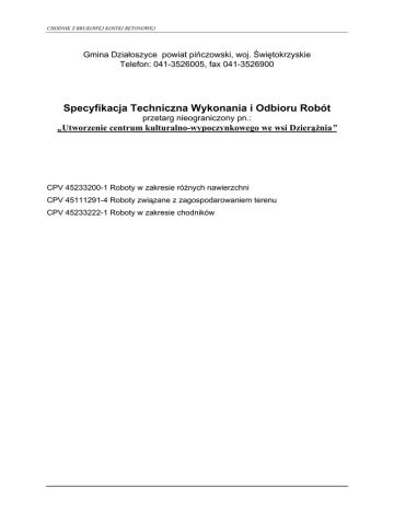 CHODNIK Z BRUKOWEJ KOSTKI BETONOWEJ Gmina Działoszyce powiat pińczowski, woj. Świętokrzyskie Telefon: 041-3526005, fax 041-3526900 Specyfikacja Techniczna Wykonania i Odbioru Robót przetarg nieograniczony pn.: „Utworzenie centrum kulturalno-wypoczynkowego we wsi Dzierążnia” CPV 45233200-1 Roboty w zakresie różnych nawierzchni CPV 45111291-4 Roboty związane z zagospodarowaniem terenu CPV 45233222-1 Roboty w zakresie chodników ELEMENTY ULIC D.08.00.00 D.08.02.02 ELEMENTY ULIC CHODNIK Z BRUKOWEJ KOSTKI BETONOWEJ 1. WSTĘP 1.1. Przedmiot SST Przedmiotem niniejszej szczegółowej specyfikacji technicznej (SST) są wymagania dotyczące wykonania i odbioru robót związanych z wykonaniem chodnika z brukowej kostki betonowej. 1.2. Zakres stosowania SST Szczegółowa specyfikacja techniczna jest stosowana jako dokument przetargowy przy zleceniach i realizacji robót wymienionych w pkt. 1.1. 1.3. Zakres robót objętych SST Ustalenia zawarte w niniejszej specyfikacji dotyczą zasad prowadzenia robót związanych z wykonaniem chodnika z brukowej kostki betonowej. 1.4. Określenia podstawowe 1.4.1. Betonowa kostka brukowa - kształtka wytwarzana z betonu metodą wibroprasowania. Produkowana jest jako kształtka jednowarstwowa lub w dwóch warstwach połączonych ze sobą trwale w fazie produkcji. 1.4.2. Pozostałe określenia podstawowe są zgodne z obowiązującymi, odpowiednimi polskimi normami i z definicjami i z definicjami podanymi w SST D-M-00.00.00 „Wymagania ogólne” pkt 1.4. 1.5. Ogólne wymagania dotyczące robót Ogólne wymagania dotyczące robót podano w SST D-M-00.00.00 „Wymagania ogólne” pkt 1.5. 2. MATERIAŁY 2.1. Ogólne wymagania dotyczące materiałów Ogólne wymagania dotyczące materiałów, ich pozyskiwania i składowania, podano w SST D-M-00.00.00 „Wymagania ogólne” pkt 2. 2.2. Betonowa kostka brukowa - wymagania 2.2.1. Aprobata techniczna Warunkiem dopuszczenia do stosowania betonowej kostki brukowej w budownictwie drogowym jest posiadanie aprobaty technicznej, wydanej przez uprawnioną jednostkę. 2.2.2. Wygląd zewnętrzny Struktura wyrobu powinna być zwarta, bez rys, pęknięć, plam i ubytków. Powierzchnia górna kostek powinna być równa i szorstka, a krawędzie kostek równe i proste, wklęśnięcia nie powinny przekraczać 2 mm dla kostek o grubości ≤ 80 mm. CHODNIK Z BRUKOWEJ KOSTKI BETONOWEJ 2.2.3. Kształt, wymiary i kolor kostki brukowej Do wykonania nawierzchni chodnika stosuje się betonową kostkę brukową o grubości 60 mm. Kostki o takiej grubości są produkowane w kraju. Tolerancje wymiarowe wynoszą: − na długości ± 3 mm, − na szerokości ± 3 mm, − na grubości ± 5 mm. Kolory kostek produkowanych aktualnie w kraju to: szary, ceglany, klinkierowy, grafitowy i brązowy. 2.2.4. Cechy fizykomechaniczne betonowych kostek brukowych Betonowe kostki brukowe powinny mieć cechy fizykomechaniczne określone w tablicy 1. Tablica 1. Cechy fizykomechaniczne betonowych kostek brukowych Lp. Cechy Wartość 1 Wytrzymałość na ściskanie po 28 dniach, MPa, co najmniej a) średnia z sześciu kostek b) najmniejsza pojedynczej kostki 60 50 2 Nasiąkliwość wodą wg PN-B-06250 [2], %, nie więcej niż 5 3 Odporność na zamrażanie, po 50 cyklach zamrażania, wg PN-B-06250 [2]: a) pęknięcia próbki b) strata masy, %, nie więcej niż c) obniżenie wytrzymałości na ściskanie w stosunku do wytrzymałości próbek nie zamrażanych, %, nie więcej niż 4 Ścieralność na tarczy Boehmego wg PN-B-04111 [1], mm, nie więcej niż brak 5 20 4 2.3. Materiały do produkcji betonowych kostek brukowych 2.3.1. Cement Do produkcji kostki brukowej należy stosować cement portlandzki, bez dodatków, klasy nie niższej niż „32,5”. Zaleca się stosowanie cementu o jasnym kolorze. Cement powinien odpowiadać wymaganiom PN-B-19701 [4]. 2.3.2. Kruszywo do betonu Należy stosować kruszywa mineralne odpowiadające wymaganiom PN-B-06712 [3]. Uziarnienie kruszywa powinno być ustalone w recepcie laboratoryjnej mieszanki betonowej, przy założonych parametrach wymaganych dla produkowanego wyrobu. 2.3.3. Woda Woda powinna być odmiany „1” i odpowiadać wymaganiom PN-B-32250 [5]. 2.3.4. Dodatki ELEMENTY ULIC Do produkcji kostek brukowych stosuje się dodatki w postaci plastyfikatorów i barwników, zgodnie z receptą laboratoryjną. Plastyfikatory zapewniają gotowym wyrobom większą wytrzymałość, mniejszą nasiąkliwość i większą odporność na niskie temperatury i działanie soli. Stosowane barwniki powinny zapewnić kostce trwałe wybarwienie. Powinny to być barwniki nieorganiczne. 3. SPRZĘT 3.1. Ogólne wymagania dotyczące sprzętu Ogólne wymagania dotyczące sprzętu podano w SST D-M-00.00.00 „Wymagania ogólne” pkt 3. 3.2. Sprzęt do wykonania chodnika z kostki brukowej Małe powierzchnie chodnika z kostki brukowej wykonuje się ręcznie. Jeśli powierzchnie są duże, a kostki brukowe mają jednolity kształt i kolor, można stosować mechaniczne urządzenia układające. Urządzenie składa się z wózka i chwytaka sterowanego hydraulicznie, służącego do przenoszenia z palety warstwy kostek na miejsce ich ułożenia. Do zagęszczenia nawierzchni stosuje się wibratory płytowe z osłoną z tworzywa sztucznego. 4. TRANSPORT 4.1. Ogólne wymagania dotyczące transportu Ogólne wymagania dotyczące transportu podano w SST D-M-00.00.00 „Wymagania ogólne” pkt 4. 4.2. Transport betonowych kostek brukowych Uformowane w czasie produkcji kostki betonowe układane są warstwowo na palecie. Po uzyskaniu wytrzymałości betonu min. 0,7 wytrzymałości projektowanej, kostki przewożone są na stanowisko, gdzie specjalne urządzenie pakuje je w folię i spina taśmą stalową, co gwarantuje transport samochodami w nienaruszonym stanie. Kostki betonowe można również przewozić samochodami na paletach transportowych producenta. 5. WYKONANIE ROBÓT 5.1. Ogólne zasady wykonania robót Ogólne zasady wykonania robót pod