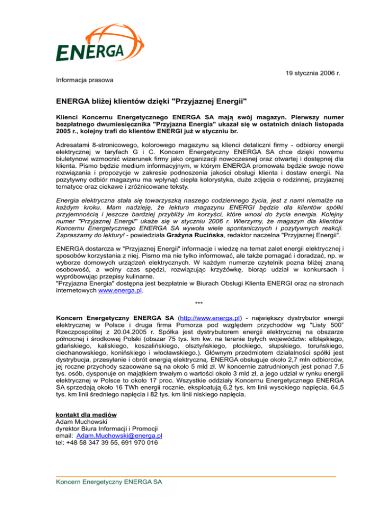 19 stycznia 2006 r. Informacja prasowa ENERGA bliżej klientów dzięki "Przyjaznej Energii" Klienci Koncernu Energetycznego ENERGA SA mają swój magazyn. Pierwszy numer bezpłatnego dwumiesięcznika "Przyjazna Energia" ukazał się w ostatnich dniach listopada 2005 r., kolejny trafi do klientów ENERGI już w styczniu br. Adresatami 8-stronicowego, kolorowego magazynu są klienci detaliczni firmy - odbiorcy energii elektrycznej w taryfach G i C. Koncern Energetyczny ENERGA SA chce dzięki nowemu biuletynowi wzmocnić wizerunek firmy jako organizacji nowoczesnej oraz otwartej i dostępnej dla klienta. Pismo będzie medium informacyjnym, w którym ENERGA promowała będzie swoje nowe rozwiązania i propozycje w zakresie podnoszenia jakości obsługi klienta i dostaw energii. Na pozytywny odbiór magazynu ma wpłynąć ciepła kolorystyka, duże zdjęcia o rodzinnej, przyjaznej tematyce oraz ciekawe i zróżnicowane teksty. Energia elektryczna stała się towarzyszką naszego codziennego życia, jest z nami niemalże na każdym kroku. Mam nadzieję, że lektura magazynu ENERGI będzie dla klientów spółki przyjemnością i jeszcze bardziej przybliży im korzyści, które wnosi do życia energia. Kolejny numer "Przyjaznej Energii" ukaże się w styczniu 2006 r. Wierzymy, że magazyn dla klientów Koncernu Energetycznego ENERGA SA wywoła wiele spontanicznych i pozytywnych reakcji. Zapraszamy do lektury! - powiedziała Grażyna Rucińska, redaktor naczelna "Przyjaznej Energii". ENERGA dostarcza w "Przyjaznej Energii" informacje i wiedzę na temat zalet energii elektrycznej i sposobów korzystania z niej. Pismo ma nie tylko informować, ale także pomagać i doradzać, np. w wyborze domowych urządzeń elektrycznych. W każdym numerze czytelnik pozna bliżej znaną osobowość, a wolny czas spędzi, rozwiązując krzyżówkę, biorąc udział w konkursach i wypróbowując przepisy kulinarne. "Przyjazna Energia" dostępna jest bezpłatnie w Biurach Obsługi Klienta ENERGI oraz na stronach internetowych www.energa.pl. *** Koncern Energetyczny ENERGA SA (http://www.energa.pl) - największy dystrybutor energii elektrycznej w Polsce i druga firma Pomorza pod względem przychodów wg "Listy 500” Rzeczpospolitej z 20.04.2005 r. Spółka jest dystrybutorem energii elektrycznej na obszarze północnej i środkowej Polski (obszar 75 tys. km kw. na terenie byłych województw: elbląskiego, gdańskiego, kaliskiego, koszalińskiego, olsztyńskiego, płockiego, słupskiego, toruńskiego, ciechanowskiego, konińskiego i włocławskiego.). Głównym przedmiotem działalności spółki jest dystrybucja, przesyłanie i obrót energią elektryczną. ENERGA obsługuje około 2,7 mln odbiorców, jej roczne przychody szacowane są na około 5 mld zł. W koncernie zatrudnionych jest ponad 7,5 tys. osób, dysponuje on majątkiem trwałym o wartości około 3 mld zł, a jego udział w rynku energii elektrycznej w Polsce to około 17 proc. Wszystkie oddziały Koncernu Energetycznego ENERGA SA sprzedają około 16 TWh energii rocznie, eksploatują 6,2 tys. km linii wysokiego napięcia, 64,5 tys. km linii średniego napięcia i 82 tys. km linii niskiego napięcia. kontakt dla mediów Adam Muchowski dyrektor Biura Informacji i Promocji email: [email protected] tel: +48 58 347 39 55, 691 970 016 Koncern Energetyczny ENERGA SA