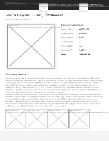Image not found przejdź na stronę główną http://www.adnieruchomosci.com.pl/images/settings/logo-strona.png Image [email protected] not found Image +48 not found 510 020 653 http://www.adnieruchomosci.com.pl/assets/template-common/gfx/mail.png?1466029949 http://www.adnieruchomosci.com.pl/asse Gdynia Oksywie, ul. inż. J. Śmidowicza Mieszkanie na sprzedaż Image not found http://static.esticrm.pl/public/images/offers/96/286214/1480089_mid.jpg Dane nieruchomości: Numer oferty: AR672127 Powierzchnia: 63,80 m Pow. działki: 0m Liczba pokoi: 3 Piętro/Pięter 1/3 2 2 2 Cena za m : 5439 zł Cena: 347000 zł Opis nieruchomości: Oferujemy na sprzedaż wyposażone 3 pokojowe mieszkanie o powierzchni 63,8 m2 w pobliżu Akademii Marynarki Wojennej. Mieszkanie znajduje się na I piętrze w odnowionym budynku, na ogrodzonej posesji. Wjazd na teren posesji przez bramę. Teren wokół budynku zadbany, wydzielone miejsca postojowe. Mieszkanie po generalnym remoncie w roku 2013. Mieszkanie posiada bardzo funkcjonalny rozkład pomieszczeń: trzy samodzielne pokoje : pierwszy o powierzchni 18 m2 i dwa pozostałe po (12 m2), kuchnia z balkonem oraz 2 łazienki . Łazienki w kaflach w jasnych tonacjach, z oknami, jedna wyposażona w kabinę prysznicową. Na podłogach w pokojach panele, w przedpokoju i w kuchni gres dobrej jakości, ściany malowane oraz częściowo w tapetach. Mieszkanie słoneczne bardzo zadbane, nie wymagające żadnych nakładów finansowych - gotowe do wprowadzenia. Inwestycja pod wynajem (bezproblemowy najem pokoi dla trzech osób - dotychczasowy dochód z najmu: 980 zł duży pokój, po 880 zł mniejsze pokoje). Najem doskonały dla studentów AMW, a latem dla letników, na imprezy typu Heineken . Oksywie jest dobrze skomunikowane z centrum miasta. Przystanek komunikacji miejskiej w odległości kilkudziesięciu metrów. Na miejscu pełne zaplecze usługowo handlowe. Atrakcją jest również bliskość morza: plaża na Oksywiu oraz na Babich Dołach, jak również liczne tereny rekreacyjne. Image not found Image not found Image not found Image not found http://static.esticrm.pl/public/images/offers/96/286214/1480089_mid.jpg http://static.esticrm.pl/public/images/offers/96/286214/1480090_mid.jpg http://static.esticrm.pl/public/images/offers/96/286214/1491973_mid.jpg http://static.esticrm.pl/public/images/offers/96/286214 Image not found przejdź na stronę główną http://www.adnieruchomosci.com.pl/images/settings/logo-strona.png Image [email protected] not found Image +48 not found 510 020 653 http://www.adnieruchomosci.com.pl/assets/template-common/gfx/mail.png?1466029949 http://www.adnieruchomosci.com.pl/asse Image not found Image not found Image not found Image not found http://static.esticrm.pl/public/images/offers/96/286214/1480092_mid.jpg http://static.esticrm.pl/public/images/offers/96/286214/1480093_mid.jpg http://static.esticrm.pl/public/images/offers/96/286214/1491988_mid.jpg http://static.esticrm.pl/public/images/offers/96/286214 Image not found Image not found Image not found Image not found http://static.esticrm.pl/public/images/offers/96/286214/1492014_mid.jpg http://static.esticrm.pl/public/images/offers/96/286214/1492015_mid.jpg http://static.esticrm.pl/public/images/offers/96/286214/1492016_mid.jpg http://static.esticrm.pl/public/images/offers/96/286214 Image not found Image not found Image not found http://static.esticrm.pl/public/images/offers/96/286214/1492018_mid.jpg http://static.esticrm.pl/public/images/offers/96/286214/1492025_mid.jpg http://static.esticrm.pl/public/images/offers/96/286214/1492029_mid.jpg