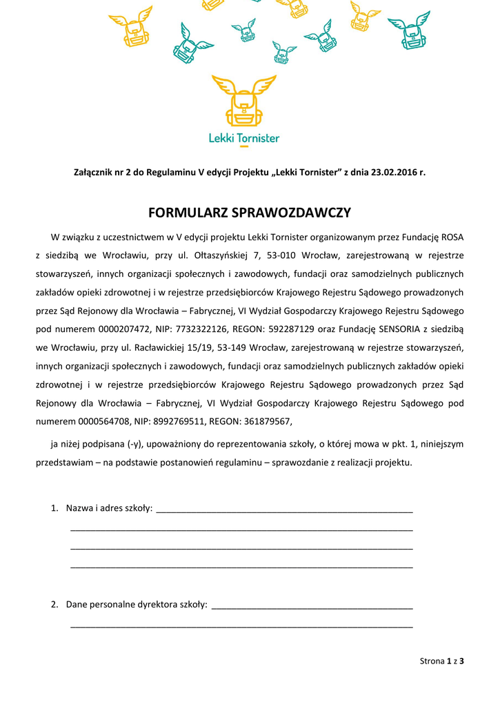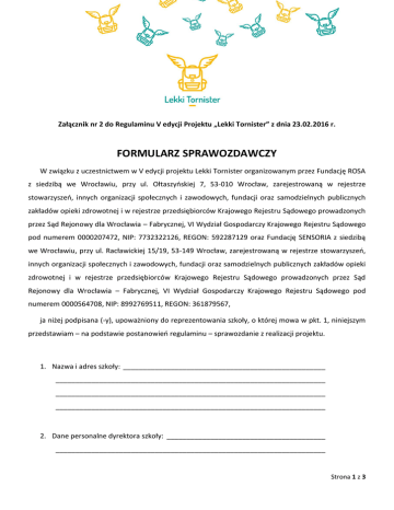 Załącznik nr 2 do Regulaminu V edycji Projektu „Lekki Tornister” z dnia 23.02.2016 r. FORMULARZ SPRAWOZDAWCZY W związku z uczestnictwem w V edycji projektu Lekki Tornister organizowanym przez Fundację ROSA z siedzibą we Wrocławiu, przy ul. Ołtaszyńskiej 7, 53-010 Wrocław, zarejestrowaną w rejestrze stowarzyszeń, innych organizacji społecznych i zawodowych, fundacji oraz samodzielnych publicznych zakładów opieki zdrowotnej i w rejestrze przedsiębiorców Krajowego Rejestru Sądowego prowadzonych przez Sąd Rejonowy dla Wrocławia – Fabrycznej, VI Wydział Gospodarczy Krajowego Rejestru Sądowego pod numerem 0000207472, NIP: 7732322126, REGON: 592287129 oraz Fundację SENSORIA z siedzibą we Wrocławiu, przy ul. Racławickiej 15/19, 53-149 Wrocław, zarejestrowaną w rejestrze stowarzyszeń, innych organizacji społecznych i zawodowych, fundacji oraz samodzielnych publicznych zakładów opieki zdrowotnej i w rejestrze przedsiębiorców Krajowego Rejestru Sądowego prowadzonych przez Sąd Rejonowy dla Wrocławia – Fabrycznej, VI Wydział Gospodarczy Krajowego Rejestru Sądowego pod numerem 0000564708, NIP: 8992769511, REGON: 361879567, ja niżej podpisana (-y), upoważniony do reprezentowania szkoły, o której mowa w pkt. 1, niniejszym przedstawiam – na podstawie postanowień regulaminu – sprawozdanie z realizacji projektu. 1. Nazwa i adres szkoły: ___________________________________________________ ____________________________________________________________________ ____________________________________________________________________ ____________________________________________________________________ 2. Dane personalne dyrektora szkoły: ________________________________________ ____________________________________________________________________ Strona 1 z 3 3. Dane personalne koordynatora projektu: ___________________________________ ____________________________________________________________________ ____________________________________________________________________ 4. Suma klas (0 – III) w których zrealizowano zajęcia edukacyjne: __________________ ____________________________________________________________________ ____________________________________________________________________ 5. Suma uczniów biorących udział w zajęciach edukacyjnych: _____________________ ____________________________________________________________________ ____________________________________________________________________ ____________________________________________________________________ ____________________________________________________________________ 6. Uwagi (czy materiały są atrakcyjne dla uczniów i pomocne w realizacji zajęć, czy pojawiły się jakieś problemy podczas prowadzenia lekcji? Jakie?) ________________ ____________________________________________________________________ ____________________________________________________________________ ____________________________________________________________________ ____________________________________________________________________ 7. Czy dołączono dokumentację dot. różnych form realizacji (na przełomie ostatnich 3 lat) programów edukacji zdrowotnej z zakresu profilaktyki wad postawy w podstawie programowej realizowanej w szkole podstawowej, ze szczególnym uwzględnieniem działań zmierzających do rozwiązania problemu przeciążonych tornistrów dzieci wczesnoszkolnych? Strona 2 z 3 TAK NIE (zaznaczyć właściwe) 8. Czy dołączono zdjęcia dot. przebiegu realizacji zająć edukacyjnych w ramach udziału w Projekcie? TAK NIE (zaznaczyć właściwe) __________________________________ (Miejscowość, data oraz podpis dyrektora szkoły) Strona 3 z 3