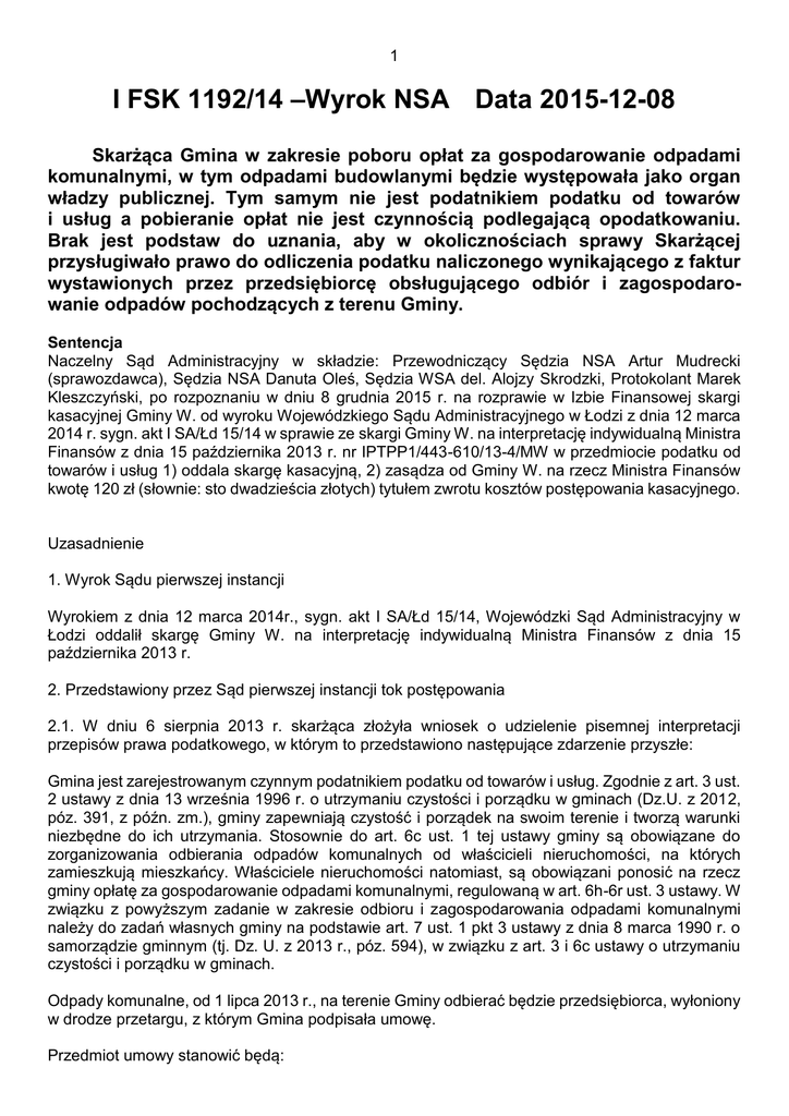 1 I FSK 1192/14 –Wyrok NSA Data 2015-12-08 Skarżąca Gmina w zakresie poboru opłat za gospodarowanie odpadami komunalnymi, w tym odpadami budowlanymi będzie występowała jako organ władzy publicznej. Tym samym nie jest podatnikiem podatku od towarów i usług a pobieranie opłat nie jest czynnością podlegającą opodatkowaniu. Brak jest podstaw do uznania, aby w okolicznościach sprawy Skarżącej przysługiwało prawo do odliczenia podatku naliczonego wynikającego z faktur wystawionych przez przedsiębiorcę obsługującego odbiór i zagospodarowanie odpadów pochodzących z terenu Gminy. Sentencja Naczelny Sąd Administracyjny w składzie: Przewodniczący Sędzia NSA Artur Mudrecki (sprawozdawca), Sędzia NSA Danuta Oleś, Sędzia WSA del. Alojzy Skrodzki, Protokolant Marek Kleszczyński, po rozpoznaniu w dniu 8 grudnia 2015 r. na rozprawie w Izbie Finansowej skargi kasacyjnej Gminy W. od wyroku Wojewódzkiego Sądu Administracyjnego w Łodzi z dnia 12 marca 2014 r. sygn. akt I SA/Łd 15/14 w sprawie ze skargi Gminy W. na interpretację indywidualną Ministra Finansów z dnia 15 października 2013 r. nr IPTPP1/443-610/13-4/MW w przedmiocie podatku od towarów i usług 1) oddala skargę kasacyjną, 2) zasądza od Gminy W. na rzecz Ministra Finansów kwotę 120 zł (słownie: sto dwadzieścia złotych) tytułem zwrotu kosztów postępowania kasacyjnego. Uzasadnienie 1. Wyrok Sądu pierwszej instancji Wyrokiem z dnia 12 marca 2014r., sygn. akt I SA/Łd 15/14, Wojewódzki Sąd Administracyjny w Łodzi oddalił skargę Gminy W. na interpretację indywidualną Ministra Finansów z dnia 15 października 2013 r. 2. Przedstawiony przez Sąd pierwszej instancji tok postępowania 2.1. W dniu 6 sierpnia 2013 r. skarżąca złożyła wniosek o udzielenie pisemnej interpretacji przepisów prawa podatkowego, w którym to przedstawiono następujące zdarzenie przyszłe: Gmina jest zarejestrowanym czynnym podatnikiem podatku od towarów i usług. Zgodnie z art. 3 ust. 2 ustawy z dnia 13 września 1996 r. o utrzymaniu czystości i porządku w gminach (Dz.U. z 2012, póz. 391, z późn. zm.), gminy zapewniają czystość i porządek na swoim terenie i tworzą warunki niezbędne do ich utrzymania. Stosownie do art. 6c ust. 1 tej ustawy gminy są obowiązane do zorganizowania odbierania odpadów komunalnych od właścicieli nieruchomości, na których zamieszkują mieszkańcy. Właściciele nieruchomości natomiast, są obowiązani ponosić na rzecz gminy opłatę za gospodarowanie odpadami komunalnymi, regulowaną w art. 6h-6r ust. 3 ustawy. W związku z powyższym zadanie w zakresie odbioru i zagospodarowania odpadami komunalnymi należy do zadań własnych gminy na podstawie art. 7 ust. 1 pkt 3 ustawy z dnia 8 marca 1990 r. o samorządzie gminnym (tj. Dz. U. z 2013 r., póz. 594), w związku z art. 3 i 6c ustawy o utrzymaniu czystości i porządku w gminach. Odpady komunalne, od 1 lipca 2013 r., na terenie Gminy odbierać będzie przedsiębiorca, wyłoniony w drodze przetargu, z którym Gmina podpisała umowę. Przedmiot umowy stanowić będą: 2 1) Zadanie 1 - usługa polegająca na odbieraniu i zagospodarowaniu odpadów komunalnych pochodzących od właścicieli nieruchomości, na których zamieszkują mieszkańcy oraz od właścicieli nieruchomości, na których nie zamieszkują mieszkańcy, a powstają odpady komunalne z terenu Gminy W. oraz wyposażenie na koszt wykonawcy (w okresie obowiązywania umowy) wszystkich właścicieli nieruchomości w pojemniki na odpady zgodnie z Regulaminem utrzymania czystości i porządku na terenie Gminy oraz utrzymywanie tych pojemników w odpowiednim stanie sanitarnym, porządkowym i technicznym, (nie podlega VAT). 2) Zadanie 2 - usługa polegająca na prowadzeniu i obsłudze Punktu Selektywnego Zbierania Odpadów Komunalnych na nieruchomości przeznaczonej na ten cel przez Gminę W. oraz odbieranie i zagospodarowanie odpadów komunalnych w nim gromadzonych, (nie podlega VAT). 1) Zadanie 3 - zbiórka odpadów wielkogabarytowych, pochodzących z gospodarstw domowych, (nie podlega VAT). 2) Zadanie 4 - zbiórka odpadów komunalnych (dwa razy w roku), zebranych podczas akcji p.n. "Sprzątanie Świata" zgodnie z zaakceptowanym przez Gminę W. harmonogramem, (nie podlega VAT) 3) Zadanie 5 - dodatkowa odpłatna usługa świadczona przez Gminę w zakresie odbierania odpadów komunalnych od właścicieli nieruchomości i zagospodarowania tych odpadów (podlega VAT). Dodatkowa usługa (zadanie 5) jest świadczona na podstawie uchwały podjętej przez Radę Miejską w W. - uchwała nr [...] z dnia 26 lutego 2013 r. w sprawie określenia rodzajów dodatkowych usług świadczonych przez Gminę W. w zakresie odbierania odpadów komunalnych od właścicieli nieruchomości i zagospodarowania tych odpadów oraz wysokości cen za te usługi. W okresie realizacji zamówienia ilość odpadów komunalnych i częstotliwość ich odbioru będzie ulegać zmianie, nie wpłynie to na cenę usługi, która w okresie realizacji umowy jest niezmienna. Za świadczenie tych czynności przedsiębiorca otrzyma wynagrodzenie ryczałtowe, płatne w stałej miesięcznej wysokości, na podstawie wystawionej faktury VAT. Wynagrodzenie to będzie obejmowało zarówno wywóz odpadów, za które mieszkańcy ponoszą opłatę za gospodarowanie odpadami komunalnymi, jak również wywóz odpadów z tytułu usługi, którą Gmina będzie odrębnie świadczyć dla mieszkańców (zadanie 5), polegającej na odbieraniu od właścicieli nieruchomości i zagospodarowaniu odpadów budowlanych w postaci podstawienia oraz odbioru kontenerów przeznaczonych na te odpady w ilości powyżej 2m3. W związku z powyższym zadano następujące pytanie. Czy wnioskodawcy będzie przysługiwało prawo do odliczenia całości kwoty podatku naliczonego zawartego w fakturach jakie będzie otrzymywała od przedsiębiorcy obsługującego odbiór i zagospodarowanie odpadów komunalnych pochodzących z terenu Gminy? Zdanie
