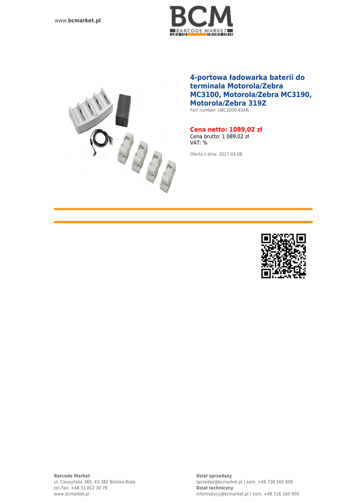 www.bcmarket.pl 4-portowa ładowarka baterii do terminala Motorola/Zebra MC3100, Motorola/Zebra MC3190, Motorola/Zebra 319Z Part number: UBC2000-45AR Cena netto: 1089,02 zł Cena brutto: 1 089,02 zł VAT: % Oferta z dnia: 2017-03-08 Barcode Market ul. Cieszyńska 365, 43-382 Bielsko-Biała tel./fax: +48 33 812 30 79 www.bcmarket.pl Dział sprzedaży [email protected] | kom. +48 726 160 800 Dział techniczny [email protected] | kom. +48 726 160 900
