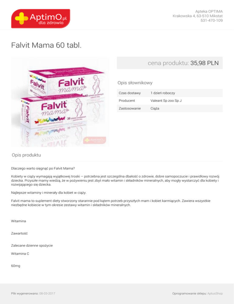 Apteka OPTIMA Krakowska 4, 63-510 Mikstat 531-470-109 Falvit Mama 60 tabl. cena produktu: 35,98 PLN Opis słownikowy Czas dostawy 1 dzień roboczy Producent Valeant Sp zoo Sp J Zastosowanie Ciąża Opis produktu Dlaczego warto sięgnąć po Falvit Mama? Kobiety w ciąży wymagają wyjątkowej troski – potrzebna jest szczególna dbałość o zdrowie, dobre samopoczucie i prawidłowy rozwój dziecka. Przyszłe mamy wiedzą, że w pożywieniu jest zbyt mało witamin i składników mineralnych, aby mogły wystarczyć dla kobiety i rozwijającego się dziecka. Najlepsze witaminy i minerały dla kobiet w ciąży. Falvit mama to suplement diety stworzony starannie pod kątem potrzeb przyszłych mam i kobiet karmiących. Zawiera wszystkie niezbędne kobiecie w tym okresie zestawy witamin i składników mineralnych. Witamina Zawartość Zalecane dzienne spożycie Witamina C 60mg Plik wygenerowano: 08-03-2017 Oprogramowanie sklepu: AptusShop Apteka OPTIMA Krakowska 4, 63-510 Mikstat 531-470-109 100% Niacyna (Witamina PP) 18mg 100% Witamina E 10mg 100% Kwas pantotenowy 6mg 100% Witamina B6 2 mg 100% Witamina B2 1,6 mg 100% Witamina B1 1,4 mg 100% Witamina A 800 μg 100% Plik wygenerowano: 08-03-2017 Oprogramowanie sklepu: AptusShop Apteka OPTIMA Krakowska 4, 63-510 Mikstat 531-470-109 Beta-karoten 400 μg * Folacyna 200 μg 100% Witamina D3 5 μg 100% Witamina B12 1 μg 100 % * zalecane dzienne spożycie nie zostało ustalone Składniki mineralne Zawartość Zalecane dzienne spożycie Wapń 240 mg 30% Magnez 30 mg 10% Plik wygenerowano: 08-03-2017 Oprogramowanie sklepu: AptusShop Apteka OPTIMA Krakowska 4, 63-510 Mikstat 531-470-109 Cynk 15 mg 100% Żelazo 14 mg 100% Potas 1,7 mg * Mangan 1,5 mg * Miedź 1,5 mg * Jod 150 μg 100% Selen 65 μg * * zalecane dzienne spożycie nie zostało ustalone Plik wygenerowano: 08-03-2017 Oprogramowanie sklepu: AptusShop Apteka OPTIMA Krakowska 4, 63-510 Mikstat 531-470-109 Falvit mama możesz rozpocząć stosować w dowolnym momencie ciąży oraz karmienia piersią. Nie musisz martwić się również o sposób jego dawkowania – jest prosty. Zaleca się spożywanie 1 tabletki dziennie podczas posiłku lub bezpośrednio po nim. Plik wygenerowano: 08-03-2017 Powered by TCPDF (www.tcpdf.org) Oprogramowanie sklepu: AptusShop