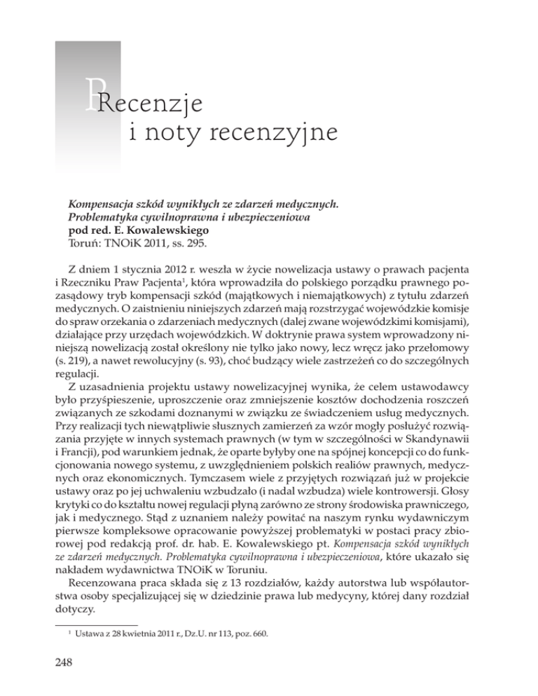 RRecenzje i noty recenzyjne Kompensacja szkód wynikłych ze zdarzeń medycznych. Problematyka cywilnoprawna i ubezpieczeniowa pod red. E. Kowalewskiego Toruń: TNOiK 2011, ss. 295. Z dniem 1 stycznia 2012 r. weszła w życie nowelizacja ustawy o prawach pacjenta i Rzeczniku Praw Pacjenta, która wprowadziła do polskiego porządku prawnego pozasądowy tryb kompensacji szkód (majątkowych i niemajątkowych) z tytułu zdarzeń medycznych. O zaistnieniu niniejszych zdarzeń mają rozstrzygać wojewódzkie komisje do spraw orzekania o zdarzeniach medycznych (dalej zwane wojewódzkimi komisjami), działające przy urzędach wojewódzkich. W doktrynie prawa system wprowadzony niniejszą nowelizacją został określony nie tylko jako nowy, lecz wręcz jako przełomowy (s. 219), a nawet rewolucyjny (s. 93), choć budzący wiele zastrzeżeń co do szczególnych regulacji. Z uzasadnienia projektu ustawy nowelizacyjnej wynika, że celem ustawodawcy było przyśpieszenie, uproszczenie oraz zmniejszenie kosztów dochodzenia roszczeń związanych ze szkodami doznanymi w związku ze świadczeniem usług medycznych. Przy realizacji tych niewątpliwie słusznych zamierzeń za wzór mogły posłużyć rozwiązania przyjęte w innych systemach prawnych (w tym w szczególności w Skandynawii i Francji), pod warunkiem jednak, że oparte byłyby one na spójnej koncepcji co do funkcjonowania nowego systemu, z uwzględnieniem polskich realiów prawnych, medycznych oraz ekonomicznych. Tymczasem wiele z przyjętych rozwiązań już w projekcie ustawy oraz po jej uchwaleniu wzbudzało (i nadal wzbudza) wiele kontrowersji. Głosy krytyki co do kształtu nowej regulacji płyną zarówno ze strony środowiska prawniczego, jak i medycznego. Stąd z uznaniem należy powitać na naszym rynku wydawniczym pierwsze kompleksowe opracowanie powyższej problematyki w postaci pracy zbiorowej pod redakcją prof. dr. hab. E. Kowalewskiego pt. Kompensacja szkód wynikłych ze zdarzeń medycznych. Problematyka cywilnoprawna i ubezpieczeniowa, które ukazało się nakładem wydawnictwa TNOiK w Toruniu. Recenzowana praca składa się z 13 rozdziałów, każdy autorstwa lub współautorstwa osoby specjalizującej się w dziedzinie prawa lub medycyny, której dany rozdział dotyczy. Ustawa z 28 kwietnia 2011 r., Dz.U. nr 113, poz. 660. 248 1–2/2013 Recenzje i noty recenzyjne Jak każde dzieło zbiorowe, również i omawiana pozycja wymagała pewnego usystematyzowania. Zamysł redaktora wydaje się jasny: od zagadnień ogólnych o charakterze wprowadzającym do problematyki alternatywnego systemu kompensacji, poprzez uwagi osób reprezentujących urzędy lub samorządy zawodowe związane ze świadczeniem usług medycznych, kwestie ubezpieczeniowe, działalność i postępowanie przed wojewódzkimi komisjami, kończąc na zagadnieniach szczegółowych, takich jak problematyka związku przyczynowego oraz prawo pacjenta dostępu do dokumentacji medycznej. Powyższy układ pracy w sposób klarowny i pełny wprowadza czytelnika w omawianą tematykę, dając wszechstronny obraz nowego uregulowania, a także problemów mogących pojawić się na tle jego stosowania. Pracę rozpoczyna rozdział autorstwa M. Nesterowicza oraz M. Wałachowskiej, poświęcony odpowiedzialności za szkody wyrządzone przy leczeniu w związku z nowym pozasądowym systemem kompensacji szkód medycznych. Pełni on funkcję wprowadzającą do dalszych rozważań, w sposób przekrojowy przedstawia bowiem rozwój odpowiedzialności za szkody medyczne oraz precyzyjnie wskazuje mankamenty nowej legislacji. Wśród nich Autorzy szczególną uwagę zwracają na brak określenia uszczerbków, które mają być kompensowane (tak jak na gruncie art. 444 k.c.), w tym na brak renty; brak określenia zasad odpowiedzialności szpitala i lekarza (ustawa wprowadza system odszkodowawczy, który nie jest systemem No Fault Patient Insurance, zdarzenie medyczne ma być bowiem niezgodne z aktualną wiedzą medyczną, co wskazuje na winę lekarza); rażąco niską wysokość świadczeń, których może domagać się poszkodowany pacjent, oraz na nonsens prawny polegający na tym, że za zakażenie, uszkodzenie ciała lub rozstrój zdrowia pacjent może uzyskać do 100 tys. zł, gdy tymczasem w razie śmierci jego spadkobiercy mogą domagać się 300 tys. zł. Należy przychylić się do postulatu Autorów podniesienia odszkodowania (zadośćuczynienia) na rzecz osób bezpośrednio poszkodowanych do 1 mln zł, stanowisko to uwzględnia bowiem rzeczywiste sumy zasądzane przez sądy w sprawach medycznych. Obecna regulacja sprawia, że nowy system może okazać się z punktu widzenia pacjentów mało atrakcyjny: będą w nim dochodzone drobne roszczenia, natomiast poważniejsze sprawy nadal będą rozstrzygane przez sądy powszechne. W konsekwencji można postawić bardziej doniosłe pytanie o to, czy w takim razie tworzenie całego nowego systemu, w tym powoływanie wojewódzkich komisji, jest rzeczywiście w pełni uzasadnione? W rozdziale 1 M. Nesterowicz oraz M. Wałachowska słusznie skrytykowali ponadto konieczność zrzeczenia się roszczeń oraz zamknięcie drogi sądowej [rozwiązania takiego nie ma ani w systemie szwedzkim (s. 50), ani francuskim (s. 66), na co zwróciła uwagę K. Bączyk-Rozwadowska w rozdziale 2]; wskazano błędne określenie kręgu osób uprawnionych do świadczenia w razie śmierci pacjenta (jako „spadkobierców”, a nie pośrednio poszkodowanych, jak w art. 446 § 2–4 k.c.), a także zagrożenie „tabelaryzacją” przy określaniu np. wysokości odszkodowania. Zgodnie z postulatem środowiska lekarskiego oraz zamysłem ustawodawcy nowy system wzorowany był głównie na rozwiązaniach przyjętych w krajach skandynawskich. K. Bączyk-Rozwadowska szczegółowo przedstawiła szwedzki model ubezpieczenia na rzecz pacjentów, oparty na konstrukcji swoistej postaci ubezpieczenia NFPI, a następnie omówiła także francuski model odpowiedzialności bez