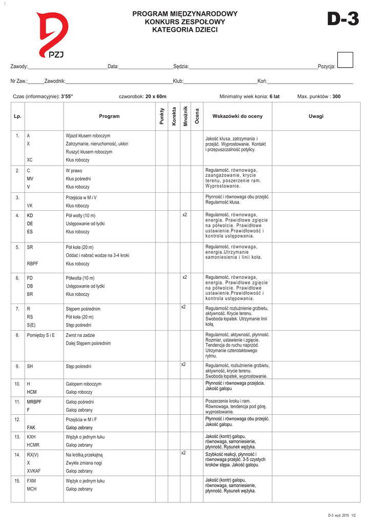 PROGRAM MIĘDZYNARODOWY KONKURS ZESPOŁOWY KATEGORIA DZIECI Zawody: Zawodnik: Koń: A Wjazd kłusem roboczym X Zatrzymanie, nieruchomość, ukłon Kłus roboczy C W prawo MV Kłus pośredni V Kłus roboczy 3. 4. 5. Kłus roboczy KD Pół wolty (10 m) DE Ustępowanie od łydki ES Kłus roboczy SR Pół koła (20 m) Płynność i równowaga obu przejść. Regularność kłusa. x2 6. 7. 8. Kłus roboczy FD Półwolta (10 m) DB Ustępowanie od łydki BR Kłus roboczy R Stępem pośrednim RS Pół koła (20 m) S(E) Stęp pośredni Pomiędzy S i E Zwrot na zadzie x2 Regularność, równowaga, energia. Prawidłowe zgięcie na półwolcie. Prawidłowe ustawienie.Prawidłowość i kontrola ustępowania. x2 Regularność rozluźnienie grzbietu, aktywność. Krycie terenu. Swoboda łopatek. Utrzymanie linii kołą. Regularność, aktywność, płynność. Rozmiar, ustawienie i zgięcie. Tendencja do ruchu naprzód. Utrzymanie czterotaktowego rytmu. Dalej Stępem pośrednim 9. SH Stęp pośredni 10. H Galopem roboczym HCM Galop roboczy MRBPF Galop pośredni F Galop zebrany 11. 12. 13. 14. 15. x2 Galop zebrany KXH Wężyk o jednym łuku HCMR Galop zebrany RX(V) Na krótką przekątną X Zwykła zmiana nogi XVKAF Galop zebrany FXM Wężyk o jednym łuku MCH Galop zebrany Regularność, rozluźnienie grzbietu, aktywność, krycie terenu. Swoboda łopatek, wyprostowanie. Płynność i równowaga przejścia. Jakość galopu Poszerzenie kroku i ram. Równowaga, tendencja pod górę, wyprostowanie. Płynność i równowaga obu przejść. Jakość galopu. Przejścia w M i F FAK Regularność, równowaga, energia. Prawidłowe zgięcie na półwolcie. Prawidłowe ustawienie.Prawidłowość i kontrola ustępowania. Regularność, równowaga, energia.Utrzymanie samoniesienia i linii koła. Oddać i nabrać wodze na 3-4 kroki RBPF Uwagi Regularność, równowaga, zaangażowanie, krycie terenu, poszerzenie ram. Wyprostowanie. Przejścia w M i V VK Wskazówki do oceny Max. punktów : 300 Jakość kłusa, zatrzymania i przejść. Wyprostowanie. Kontakt i przepuszczalność potylicy. Ruszyć kłusem roboczym XC Ocena Program Minimalny wiek konia: 6 lat Mnożnik czworobok: 20 x 60m Korekta Lp. 2. Pozycja: Klub: Czas (informacyjnie): 3’55” 1. Sędzia: Punkty Nr Zaw.: Data: D-3 x2 Jakość (kontr) galopu, równowaga, samoniesienie, płynność. Rysunek wężyka. Szybkość reakcji, płynność i równowaga przejść. 3-5 czystych kroków stępa. Jakość galopu. Jakość (kontr) galopu, równowaga, samoniesienie, płynność. Rysunek wężyka. D-3 wyd. 2015 1/2 16. 17. 18. HSEX Galop zebrany X Zwykła zmiana nogi XBP Galop zebrany P Kłusem roboczym PFA Kłus roboczy A Na linię środkową X Zatrzymanie nieruchomość, ukłon x2 Szybkość reakcji, płynność i równowaga przejść. 3-5 czystych kroków stępa. Jakość galopu. Wyprostowanie. Płynność i równowaga przejścia, regularność kłusa. Jakość kłusa, wyprostowanie i równowaga w zatrzymaniu. Kontakt i przepuszczalność potylicy. Opuścić czworobok stępem na długiej wodzy wA Oceny Ogólne Chody (swoboda i regularność) Impuls (dążność do ruchu naprzód, elastyczność kroków, rozluźnienie grzbietu, zaangażowanie zadu) Posłuszeństwo (uwaga i zaufanie, harmonia, lekkość i łatwość wykonania, wyprostowanie, przyjęcie kiełzna i lekkość przodu) x2 Postawa i dosiad jeźdźca; poprawność i skuteczność pomocy x2 Błędy w przebiegu lub wykonaniu programu: 1-sza pomyłka - 2 pkt. 2-ga pomyłka - 4 pkt. 3-cia pomyłka - eliminacja Ogólne uwagi: Inne błędy (2 pkt): - wjazd z batem w obszar wokół czworoboku lub - wjazd z batem na czworobok lub - nie wjechanie na czworobok w ciągu 45 sekund po sygnale lub - wjazd na czworobok przed sygnałem Wynik końcowy [%] Organizator (adres) Podpis Sędziego: WYDANIE FEI 2015 D-3 wyd. 2015 2/2