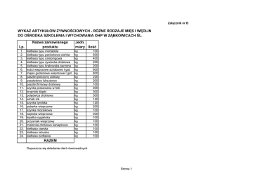 Załącznik nr B WYKAZ ARTYKUŁÓW śYWNOŚCIOWYCH - RÓśNE RODZAJE MIĘS I WĘDLIN DO OŚRODKA SZKOLENIA I WYCHOWANIA OHP W ZĄBKOWICACH ŚL. Lp. Nazwa zamawianego produktu 1. 2. 3. 4. 5. 6. 7. 8. 9. 10. 11. 12. 13. 14. 15. 16. 17. 18. 19. 20. 21. 22. 23. 24. kiełbasa typu mortadela kiełbasa typu parówkowa cieńka kiełbasa typu campingowa kiełbasa typu Ŝywiecka drobiowa kiełbasa typu krakowska parzona kości wieprzowe schabowe I gat. mięso gulaszowe wieprzowe I gat. pasztet pieczony ziołowy pasztetowa luksusowa pasztet firmowy drobiowy szynka prasowana w folii krupniok śląski polędwica drobiowa schab z/k szynka tyrolska zeberka wieprzowe szynka mozaikowa wątroba wieprzowa łopatka cygańska przysmak wieprzowy mielonka drobiowa kanapkowa kiełbasa rawska kiełbasa lubuska kiełbasa podlaska Jedn. miary Ilość kg kg kg kg kg kg kg kg kg kg kg kg kg kg kg kg kg kg kg kg kg kg kg kg 100 500 400 200 200 600 600 220 200 100 300 300 300 140 120 200 100 300 100 100 100 100 100 100 RAZEM Dopuszcza się składanie ofert równowaŜnych Strona 1
