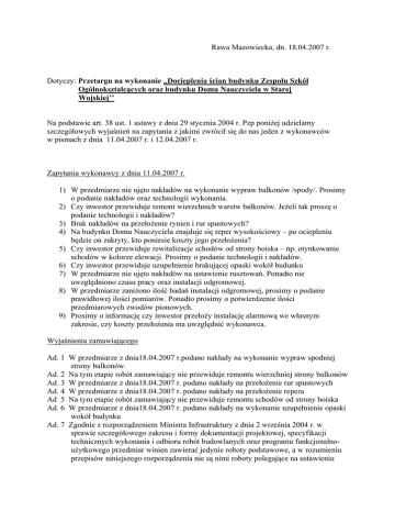 Rawa Mazowiecka, dn. 18.04.2007 r. Dotyczy: Przetargu na wykonanie ,,Docieplenia ścian budynku Zespołu Szkół Ogólnokształcących oraz budynku Domu Nauczyciela w Starej Wojskiej’’ Na podstawie art. 38 ust. 1 ustawy z dnia 29 stycznia 2004 r. Pzp poniżej udzielamy szczegółowych wyjaśnień na zapytania z jakimi zwrócił się do nas jeden z wykonawców w pismach z dnia 11.04.2007 r. i 12.04.2007 r. Zapytania wykonawcy z dnia 11.04.2007 r. 1) W przedmiarze nie ujęto nakładów na wykonanie wypraw balkonów /spody/. Prosimy o podanie nakładów oraz technologii wykonania. 2) Czy inwestor przewiduje remont wierzchnich warstw balkonów. Jeżeli tak proszę o podanie technologii i nakładów? 3) Brak nakładów na przełożenie rynien i rur spustowych? 4) Na budynku Domu Nauczyciela znajduje się reper wysokościowy – po ociepleniu będzie on zakryty, kto poniesie koszty jego przełożenia? 5) Czy inwestor przewiduje rewitalizacje schodów od strony boiska – np. otynkowanie schodów w kolorze elewacji. Prosimy o podanie technologii i nakładów. 6) Czy inwestor przewiduje uzupełnienie brakującej opaski wokół budunku 7) W przedmiarze nie ujęto nakładów na ustawienie rusztowań. Ponadto nie uwzględniono czasu pracy oraz instalacji odgromowej. 8) W przedmiarze zaniżono ilość badań instalacji odgromowej, prosimy o podanie prawidłowej ilości pomiarów. Ponadto prosimy o potwierdzenie ilości przedmiarowych zwodów pionowych. 9) Prosimy o informację czy inwestor przełoży instalację alarmową we własnym zakresie, czy koszty przełożenia ma uwzględnić wykonawca. Wyjaśnienia zamawiającego Ad. 1 W przedmiarze z dnia18.04.2007 r.podano nakłady na wykonanie wypraw spodniej strony balkonów. Ad. 2 Na tym etapie robót zamawiający nie przewiduje remontu wierzchniej strony balkonów Ad. 3 W przedmiarze z dnia18.04.2007 r. podano nakłady na przełożenie rur spustowych Ad. 4 W przedmiarze z dnia18.04.2007 r. podano nakłady na przełożenie repera Ad 5 Na tym etapie robót zamawiający nie przewiduje remontu schodów od strony boiska Ad. 6 W przedmiarze z dnia18.04.2007 r. podano nakłady na wykonanie uzupełnienie opaski wokół budynku Ad. 7 Zgodnie z rozporządzeniem Ministra Infrastruktury z dnia 2 września 2004 r. w sprawie szczegółowego zakresu i formy dokumentacji projektowej, specyfikacji technicznych wykonania i odbioru robót budowlanych oraz programu funkcjonalnoużytkowego przedmiar winien zawierać jedynie roboty podstawowe, a w rozumieniu przepisów niniejszego rozporządzenia nie są nimi roboty polegające na ustawieniu rusztowań, czas ich pracy ani instalacja odgromowa. Ad. 8 W przedmiarze przewidziano 6 pomiarów instalacji odgromowej przy budynku ZSO oraz 3 pomiary przy budynku Domu Nauczyciela, taka jest też ilość zwodów. W przedmiarze z dnia18.04.2007 r. podano zmienione ilości zwodów pionowych. Ad. 9 Zamawiający przełoży instalację alarmową we własnym zakresie. Zapytanie wykonawcy z dnia 12.04.2007 r. 1) Czy inwestor przewiduje remont schodów wejściowych do Szkoły. 2) Jakiej gr. blachę należy zastosować do podokienników 3) Ile szt. drzwi przeciwpożarowych będzie wymienianych w całości zadania. /3 czy 4 szt./. Proszę o potwierdzenie ich wymiarów. 4) Proszę o podanie specyfikacji drzwi do zamontowania wg pkt. 2.2.2 – czy PCV czy aluminium, szyba zwykła czy bezpieczna, kolor, ile zamków itp. 5) Proszę o potwierdzenie iż powiękrzenie drzwi kotłowni nie wymaga montażu nowych nadproży 6) Zaniżono obmiar w pozycji 1.1.11- wg naszych wyliczeń winno być 3*2*1,9+1,01+1,4+1,39 7) W schodach wew. żelbetowych kotłowni brak wykucia gniazd, wykonania zbrojenia, orazł ułożenia płytek w rozkutej części wyższej. 8) Czy w ułożeniu cokołu płytkami należy uwzględnić też fundament kotła (poz.1.1.15) 9) Czy inwestor przewiduje następujące prace na ścianie zejścia do kotłowni /bloczek betonowy/: tynkowanie silikatem, izolacje przeciwodne, czapka ze spadkiem? 10) Zaniżono nakłady w poz. 1.2.5; 1.2.6; 1.2.8; 1.2.9; 1.2.20. 11) Brak uzupełnienia i zagęszczenia gruntu przy wykopach ściany zejścia do kotłowni – strona zewnętrzna 12) Prosimy o podanie standardu blachy na daszek wejścia do kotłowni. 13) Zaniżono pozycje 2.1.1 oraz 2.1.16-18 co do długości zwodów, ponadto ilość zwodów wynosi 6. Podobnie zaniżono długość zwodów w części dla Domu Nauczyciela. Wyjaśnienia zamawiającego Ad. 1 Na tym etapie robót inwestor nie przewiduje remontu schodów wejściowych do szkoły. Ad. 2 Do podokienników należy zastosować blachę o grubości min.0,65 mm. Ad. 3 Ustalono, że na tym etapie robót zostanie wymienionych 2 szt. drzwi przeciwpożarowych. Ich wymiary podano w przedmiarze z dnia18.04.2007 r Ad. 4 Drzwi ujęte w poz. 2.2.2 przedmiaru powinny spełniać wymagania podane w specyfikacji technicznej, kolor drzwi biały. Ad. 5 Poszerzenie otworu na drzwi kotłowni będzie konieczne w przypadku drzwi pomiędzy kotłownią a pomieszczeniami socjalnymi palacza. Jeżeli będzie konieczne wykonanie nowego szerszego nadproża nad tymi drzwiami zamawiający odstąpi od poszerzenia drzwi i wtedy nowe drzwi należy zamontować w dotychczasowej szerokości. Ad. 6 W przedmiarze z dnia18.04.2007 r. podano nowe ilości tynków. Ad. 7 W przedmiarze z dnia18.04.2007 r. skreślono nakłady pozycji obejmującej wykonanie schodów żelbetowych. Ad. 8 Pozycja 1.1.5 obejmuje również wykonanie cokolika z płytek wokół fundamentu kotła (wymiar fundamentu 1,85m x 2,03m). Ad. 9 W przedmiarze z dnia18.04.2007 r. przewidziano wykonanie izolacji przeciwwodnej Ad.10 Potwierdzam ilość nakładów z poz.1.2.20. i 1.2.9. W przedmiarze z dnia18.04.2007 r. podano nowe ilości nakładów w poz. 1.2.5, 1.2.6. i 1.2.8. Ad.11 W przedmiarze z dnia18.04.2007 r. uwzględniono nakłady na uzupełnienie zagęszczenie gruntu po wykopach. Ad.12 Blacha stalowa ocynkowana trapezowa powlekana w kolorze brązowym Ad.13 W przed