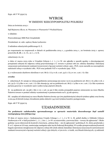 Sygn. akt V W 3532/13 WYROK W IMIENIU RZECZYPOSPOLITEJ POLSKIEJ Dnia 20 kwietnia 2015 r. Sąd Rejonowy dla m. st. Warszawy w Warszawie V Wydział Karny w składzie: Przewodniczący SSR Piotr Grzędziński Protokolant: st. sekr. sądowy Beata Lechowicz Z udziałem oskarżyciela publicznego E. Z. po rozpoznaniu na rozprawach w dniach 16 października 2014 r., 4 grudnia 2014 r., 20 kwietnia 2015 r. sprawy przeciwko E. B. c. A. i G., ur. (...) w K. oskarżonej o to, że: w dniu 27 marca 2013 roku w Urzędzie Celnym (...) (...) w W. nie zgłosiła w sposób zgodny z obowiązującymi przepisami celnymi do odprawy celnej przywiezionego z C. towaru w postaci 166 szt. odzieży damskiej i dziecięcej oznaczonej zastrzeżonymi znakami towarowymi o łącznej wartości celnej 1.550,- PLN, czym naraziła na uszczuplenie należność celną w wysokości 186,- PLN oraz podatek VAT w wysokości 399,- PLN, tj. o wykroczenie skarbowe określone w art. 86 § 1 i § 4 w zb. z art. 54 § 1 i § 3 w zw. z art. 7 § 1 kks orzeka I. oskarżoną E. B. uznaje za winną popełnienia zarzucanego jej czynu i za to na podstawie art. 86 § 1 i § 4 kks w zb. z art. 54 § 1 i § 3 kks w zw. z art. 7 § 1 kks skazuje ją, zaś na podstawie art. 86 § 1 i 4 kks w zw. z art. 7 § 2 kks wymierza jej karę grzywny w wysokości 1500 ( jeden tysiąc pięćset) złotych; II. na podstawie art. 29 pkt 1 kks w zw. z art. 31 par 6 kks orzeka przepadek poprzez zniszczenie na rzecz Skarbu Państwa towaru w postaci odzieży wymienionej w postanowieniu na k. 35 akt sprawy; III. zasądza od oskarżonej na rzecz Skarbu Państwa kwotę 150 (stu pięćdziesięciu) złotych tytułem opłaty oraz kwotę 2.021,54 zł (dwóch tysięcy dwudziestu jeden złotych i 54/100) tytułem kosztów postępowania. Sygn. akt V W 3532/13 UZASADNIENIE Na podstawie całokształtu zgromadzonego w sprawie materiału dowodowego Sąd ustalił następujący stan faktyczny: W dniu 27 marca 2013 r. funkcjonariusz Urzędu Celnego (...) (...) w W. Ł. M. pełnił służbę w Oddziale Celnym Osobowym w W. w hali przylotów (...) (...) im. (...) w W. na stanowisku „czerwona linia – towary do zgłoszenia”. Około godziny 13:00 skierował do kontroli z korytarza „zielona linia – nic do zgłoszenia” podróżną E. B., która przyleciała z P. w C. rejsem nr LO 092, zamierzając następnie udać się do Federacji Rosyjskiej. W wyniku przeprowadzonej kontroli bagażu ujawniono niezgłoszone do odprawy celnej 166 sztuk odzieży damskiej i dziecięcej oznaczonych zastrzeżonymi znakami towarowymi o łącznej wartości celnej 1 550 złotych, w tym m in. 11 tunik, 102 bluzek dziecięcych, 15 sukienek dziewczęcych, 10 kurtek damskich i inne. Przywóz wskazanych rzeczy nie miał w całości charakteru niehandlowego. Część z przywiezionych rzeczy przeznaczona była na użytek własny podróżnej i jej rodziny, prezenty dla osób z rodziny, a co do części przywozu rzeczy miał on charakter handlowy, przy czym cele handlowe nie miały być realizowane na terytorium Rzeczypospolitej Polskiej. W wyniku działań E. B. Skarb Państwa został narażony na uszczuplenie należności celnej w wysokości 186 złotych oraz podatku VAT w wysokości 399 złotych. Powyższy stan faktyczny Sąd ustalił na podstawie: • częściowych wyjaśnień oskarżonej k. 13v, 43v-44, 155-156, • zeznań świadka Ł. M. k. 34v, 157, • wyliczenia wraz ze specyfikacją k. 5-6, 10, 15, • protokołu zatrzymania rzeczy k. 7-8, • pokwitowania k. 9, • kopii biletów k. 16, • kopii paszportu k. 17-26, • karty karnej k. 28, 146, 215 • protokołu z otwarcia depozytu k. 30, • protokołu oględzin rzeczy k. 31-33, • paszportu, odpisów aktów stanu cywilnego, zaświadczenia o zameldowaniu k. 50-71, • aktu oskarżenia k. 161, • informacji k. 162, 163, • opinia biegłego P. S. k. 170-188, • odpisu postanowienia k. 227-229, 231-232, • odpisu wyroku k. 230. Oskarżona E. B. nie przyznała się do popełnienia zarzucanego jej czynu. Wyjaśniła, iż poleciała do C. w celu leczeniu się ludową metodą chińską, odzież kupowała w sklepikach dla siebie i dla członków rodziny. Dopiero na granicy dowiedziała się o metkach zastrzeżonych; kiedy kupowała odzież, nie patrzyła na materiał i na cenę, patrzyła, żeby było taniej. Podkreśliła, że o tym, że jest to ścigane, nie wiedziała. Najważniejsze było dla niej to, żeby cena była jak najmniejsza. Wyjaśniła, że nie miała na celu sprzedawać tej odzieży. Podała, że pojechali przez W., bo bezpośredniego lotu z Rosji do C. nie ma, było wygodniej jechać przez W. niż bezpośrednio. Dalej wyjaśniała, że ma 2 dzieci, tj. dwie dziewczynki - ośmioletnią i sześcioletnią. Wyjaśniła, że ubrania chłopięce miały być dla bratanka. Bluzki były dla jej dzieci, były w różnych rozmiarach, żeby były na zmianę i na zapas. Dodała, że nie zwracała uwagi na napisy, zwracała uwagę na same rzeczy, na kolor. Sąd po części uznał za wiarygodne wyjaśnienia oskarżonej, w szczególności dotyczące faktu jej zatrzymania, okoliczności dot. podróży, jak i ilości przewożonych rzeczy oraz ich wartości. W tej części jej wyjaśnienia są bezsporne i nie były kwestionowane. Z kolei wyjaśnienia oskarżonej w części dotyczącej deklarowania, że cały przewożony przez oskarżoną towar przeznaczony był do własnego użytku i na prezenty dla członków rodziny, Sąd uznał za oczywiście niewiarygodne, sprzeczne z logiką i zasadami doświadczenia życiowego, mające na celu uniknięcie odpowiedzialności karnej. Sąd uznał, że wyjaśnienia oskarżonej w tym zakresie są niewiarygodne w świetle dowodów rzeczowych zatrzymanych w spawie, obejmujących 166 sztuk odzieży, w tym rzeczy obejmujących kilkanaście sztuk tego samego asortymentu, a w jednym przypadku aż 102 sztuk bluzek dziecięcych. Sąd ocenił, mając na uwadze ilość sztuk towaru i rodzaj towaru oraz zasady doświadczenia życi