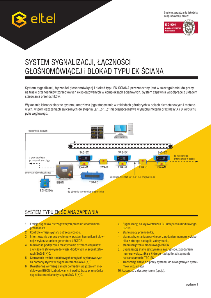 System zarządzania jakością zaaprobowany przez: SyStem SyGnaLizaCji, ŁĄCznoŚCi GŁoŚnomówiĄCej i bLoKaD typu eK ŚCiana System sygnalizacji, łączności głośnomówiącej i blokad typu eK ŚCiana przeznaczony jest w szczególności do pracy na trasie przenośników zgrzebłowych eksploatowanych w kompleksach ścianowych. System zapewnia współpracę z układem sterowania przenośników. wykonanie iskrobezpieczne systemu umożliwia jego stosowanie w zakładach górniczych w polach niemetanowych i metanowych, w pomieszczeniach zaliczonych do stopnia „a”, „b”, „c” niebezpieczeństwa wybuchu metanu oraz klasy a i b wybuchu pyłu węglowego. transmisja danych SaG-eX SaG-eX SaG-eX do nasępnego przenośnika w ciągu z poprzedniego przenośnika w ciągu ewa-m ewa-D ewa-m ewa-D ewa-m do systemów wizualizacji ynHKGSLyHtKGX 7x1,5+1,5+ 2x(1x2x0,8) bizon ezi-15XDw teo-eC do obwodu sterownika przenośnika SyStem typu eK ŚCiana zapewnia 1. emisję sygnałów ostrzegawczych przed uruchomieniem przenośnika. 2. Kontrolę emisji sygnału ostrzegawczego. 3. informowanie o pracy systemu w postaci komunikacji słownej z wykorzystaniem generatora LeKtoR. 4. możliwość podłączenia maksymalnie czterech czujników z wyjściem stykowym do wejść diodowych w sygnalizatorach SaG-e(K)C. 5. Sterowanie dwóch dodatkowych urządzeń wykonawczych za pomocą styków w sygnalizatorach SaG-e(K)C. 6. Dwustronną wymianę danych pomiędzy urządzeniem modułowym bizon i zabudowanymi wzdłuż trasy przenośnika sygnalizatorami akustycznymi SaG-e(K)C. 7. Sygnalizację na wyświetlaczu LCD urządzenia modułowego bizon: - stanu pracy przenośnika, - stanu zatrzymania awaryjnego, z podaniem numeru wyłącznika z którego nastąpiło zatrzymanie, - stanu urządzenia modułowego bizon. 8. Sygnalizację stanu zatrzymania awaryjnego, z podaniem numeru wyłącznika z którego nastąpiło zatrzymanie na transparencie teo-eC. 9. transmisję danych o pracy systemu do zewnętrznych systemów wizualizacji. 10. Łączność z dyspozytorem (opcja). wydanie 1 SyStem wizuaLizaCji umożLiwia: 1. wyświetlanie informacji o: - aktualnym stanie pracy przenośnika, - aktualnych stanach awaryjnych lub o ostatnim stanie awaryjnym jaki wystąpił w danym przenośniku, - parametrach pracy Sygnalizatorów akustycznych Głośnomówiących typu SaG: - stanie naładowania akumulatora, - napięciu zasilania, - prądzie ładowania, - parametrach pracy nadajników identyfikacji blokady typu nib-2C umieszczonych w wyłącznikach awaryjnych typu ewa-D(L): - napięciu zasilania, - stanie wejść blokad. 2. zdalną konfigurację wszystkich parametrów sterownika typu bizon. 3. maskowanie źródła blokady. 4. Dodawanie i usuwanie użytkowników przez administratora systemu (pracownika kopalni). 5. odwzorowanie rzeczywistego rozmieszczenia przenośników i urządzeń w wyrobiskach kopalni. 6. wizualizację pracy przenośników równolegle na kilku komputerach z zainstalowaną aplikacją minoS. 7. podgląd stanu pracy z dowolnego miejsca poprzez przeglądarkę internetową. SpoSób zamówienia eltel sp. z o.o. ul. milowicka 1e, 40-312 Katowice, poLSKa tel.: +48 32 202 78 86 wew. 123, fax: +48 32 206 65 76, www.eltel.katowice.pl wydanie 1