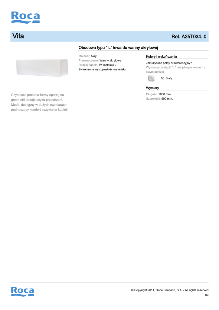 Vita Ref. A25T034..0 Obudowa typu " L" lewa do wanny akrylowej Materiał: Akryl Przeznaczenie: Wanny akrylowe Rodzaj panela: W kształcie L Zwiększona wytrzymałość materiału Kolory i wykończenia Jak uzyskać pełny nr referencyjny? Wystarczy zastąpić ".." pożądanym kolorem z listym poniżej 00 Biały Wymiary Czystość i prostota formy opartej na geometrii dodaje szyku przestrzeni. Model dostępny w dużych rozmiarach podnoszący komfort zażywania kąpieli. Długość: 1800 mm. Szerokość: 900 mm. © Copyright 2011, Roca Sanitario, S.A. - All rights reserved 00