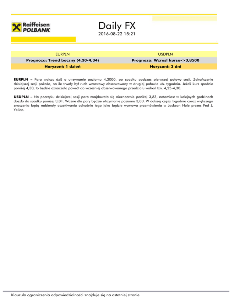 Daily FX 2016-08-22 15:21 EURPLN USDPLN Prognoza: Trend boczny (4,30-4,34) Prognoza: Wzrost kursu->3,8500 Horyzont: 1 dzień Horyzont: 3 dni EURPLN – Para walczy dziś o utrzymanie poziomu 4,3000, po spadku podczas pierwszej połowy sesji. Zakończenie dzisiejszej sesji pokaże, na ile trwały był ruch wzrostowy obserwowany w drugiej połowie ub. tygodnia. Jeżeli kurs spadnie poniżej 4,30, to będzie oznaczało powrót do wcześniej obserwowanego przedziału wahań tzn. 4,25-4,30. USDPLN – Na początku dzisiejszej sesji para znajdowała się nieznacznie poniżej 3,83, natomiast w kolejnych godzinach doszło do spadku poniżej 3,81. Ważne dla pary będzie utrzymanie poziomu 3,80. W dalszej części tygodnia coraz większego znaczenia będą nabierały oczekiwania odnośnie tego jaka będzie wymowa przemówienia w Jackson Hole prezes Fed J. Yellen. Źródło: Reuters; Bloomberg; prognozy Raiffeisen Bank Polska i Raiffeisen Research Klauzula ograniczenia odpowiedzialności znajduje się na ostatniej stronie EURPLN USDPLN Prognoza: Trend boczny (4,30-4,34) Prognoza: Wzrost kursu->3,8500 Horyzont: 1 dzień Horyzont: 3 dni Źródło: Reuters, stan na 2016-08-22 14:17 Opór Kurs Wsparcie 4,3630 4,3620 4,3350 4,3013 4,3000 4,2530 4,2250 Dziś para EURPLN oscyluje wokół istotnego poziomu 4,30. Przebicie dołem bariery będzie oznaczało powrót do zakresu wahań 4,25-4,30, natomiast pozostanie powyżej tej bariery w dłuższej perspektywie stwarza okazję do wzrostu nawet do 4,3350. Najbliższe wsparcia ro 4,30 oraz dołki lokalne odpowiednio 4,2530 z sierpnia br. i 4,2250 z początku kwietnia br. Najbliższe opory to poziomy 4,3350 (linia ponad rocznego trendu wzrostowego) oraz 4,3620 (obecne położenie 50 sesyjnej średniej ruchomej). EURPLN USDPLN Prognoza: Trend boczny (4,30-4,34) Prognoza: Wzrost kursu->3,8500 Horyzont: 1 dzień Horyzont: 3 dni Źródło: Reuters, stan na 2016-08-22 14:17 Opór Kurs Wsparcie 3,9160 3,8880 3,8370 3,8040 3,8000 3,7800 3,7650 Po wzrostowej pierwszej części dzisiejszej sesji USDPLN, w drugiej para wróciła w okolicę 3,80, przy której znajduje się wsparcie. Najbliższe wsparcia poza 3,80 to dołki lokalne z czerwca br. odpowiednio 3,7800 oraz 3,7650. Najbliższe opory dla pary to szczyt notowań z 10 sierpnia 3,8370, a także 100-sesyjna średnia (3,8880). Klauzula ograniczenia odpowiedzialności znajduje się na ostatniej stronie Raport sporządził: Mateusz Namysł Analityk Rynków Finansowych Raiffeisen Polbank ul. Grzybowska 78, 00-844 Warszawa www.raiffeisenpolbank.com Departament Sprzedaży Rynków Finansowych Telefon: + 48 22 585 37 86 Faks: + 48 22 585 33 68 W razie pytań lub uwag dotyczących powyższej publikacji proszę o kontakt: [email protected] Dealing: Bydgoszcz tel.: (22) 585 37 73 Poznań tel.: (61) 655 47 51 Gdańsk tel.: (22) 585 37 71 Rzeszów tel.: (22) 585 37 75 Katowice tel.: (22) 585 37 69 Szczecin tel.: (22) 585 37 71 Kielce tel.: (22) 585 37 70 Toruń tel.: (22) 585 37 72 Kraków tel.: (22) 585 37 70 Warszawa tel.: (22) 585 37 79 Lublin tel.: (22) 585 37 75 Wrocław tel.: (22) 585 37 74 Łódź tel.: (22) 585 37 75 Zielona Góra tel.: (22) 585 37 73 Klauzula Ograniczenia Odpowiedzialności: Niniejsza wiadomość została przesłana zgodnie z Pani/Pana zleceniem. Informujemy, że zgoda na otrzymywanie informacji może zostać w każdej chwili odwołana. Jeżeli nie życzy sobie Pani/ Pan dalszego otrzymywania materiałów przygotowanych przez Zespół Analiz Ekonomicznych Raiffeisen Bank Polska S.A (dalej: RBPL lub Bank) lub niniejszy materiał został wysłany na Pani/Pana adres przez pomyłkę, prosimy o przesłanie e-maila o tytule "REZYGNACJA" na skrzynkę e-mailową: [email protected]. Opracowanie to nie stanowi oferty w rozumieniu art. 66 Kodeksu Cywilnego i zostało przesłane na podstawie ustnej zgody, która w każdej chwili może być odwołana. Ma ono charakter wyłącznie informacyjny. Powielanie bądź publikowanie go lub jego części bez pisemnej zgody Banku jest zabronione. Decyzja inwestycyjna w odniesieniu do papieru wartościowego, produktu finansowego lub inwestycji powinna być podjęta na podstawie opublikowanego prospektu emisyjnego lub kompletnej dokumentacji dla papieru wartościowego, produktu finansowego lub inwestycji. Ostateczna decyzja zawarcia transakcji należy wyłącznie do Klienta. Bank nie występuje w roli pośrednika ani przedstawiciela Klienta. Przed zawarciem każdej transakcji Klient powinien nie opierając się na informacjach przekazanych przez Bank określić jej ryzyko, potencjalne korzyści oraz straty z nią związane, jak również w szczególności charakterystykę, konsekwencje prawne, podatkowe i księgowe transakcji oraz konsekwencje zmieniających się czynników rynkowych, a także w sposób niezależny ocenić czy jest w stanie sam lub po konsultacjach ze swoimi doradcami podjąć takie ryzyko. Niniejszy dokument nie stanowi rekomendacji, porady inwestycyjnej i nie jest związany ze świadczeniem usług doradztwa inwestycyjnego. Dokument, ani żadna z jego części nie stanowi podstawy do zawarcia jakiejkolwiek umowy lub powstania zobowiązania. Opracowanie to nie zastępuje niezbędnych porad odnośnie zakupu lub sprzedaży papieru wartościowego, inwestycji lub innego produktu finansowego. Analiza oparta jest na informacjach publicznie dostępnych – do jej sporządzenia nie wykorzystano żadnych informacji poufnych. Wyrażane opinie są niezależnymi opiniami Banku. W opracowaniu wykorzystano źródła informacji, które Bank uważa za wiarygodne i dokładne, lecz nie istnieje gwarancja, że są one wyczerpujące i w pełni odzwierciedlają stan faktyczny. Wykresy i diagramy przestawione w niniejszym opracowaniu mają charakter wyłącznie ilustracyjny oraz nie są doradztwem inwestycyjnym ani prognozą. Informacje zawarte w tej publikacji są aktualne na datę utworzenia dokumentu i mogą ulec zmianie w przyszłości. Analitycy zatrudnieni przez RBPL nie są wy