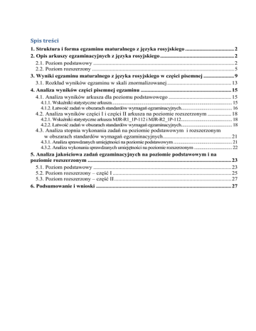 Spistreści 1. Struktura i forma egzaminu maturalnego z języka rosyjskiego ................................... 2 2. Opis arkuszy egzaminacyjnych z języka rosyjskiego ..................................................... 2 2.1. Poziom podstawowy ..................................................................................................... 2 2.2. Poziom rozszerzony ...................................................................................................... 5 3. Wyniki egzaminu maturalnego z języka rosyjskiego w części pisemnej ...................... 9 3.1. Rozkład wyników egzaminu w skali znormalizowanej .............................................. 13 4. Analiza wyników części pisemnej egzaminu ................................................................. 15 4.1. Analiza wyników arkusza dla poziomu podstawowego ............................................. 15 4.1.1. Wskaźniki statystyczne arkusza............................................................................................................... 15 4.1.2. Łatwość zadań w obszarach standardów wymagań egzaminacyjnych............................................... 16 4.2. Analiza wyników części I i części II arkusza na poziomie rozszerzonym ................. 18 4.2.1. Wskaźniki statystyczne arkusza MJR-R1_1P-112 i MJR-R2_1P-112............................................... 18 4.2.2. Łatwość zadań w obszarach standardów wymagań egzaminacyjnych............................................... 18 4.3. Analiza stopnia wykonania zadań na poziomie podstawowym i rozszerzonym w obszarach standardów wymagań egzaminacyjnych ................................................. 21 4.3.1. Analiza sprawdzanych umiejętności na poziomie podstawowym ...................................................... 21 4.3.2. Analiza wykonania sprawdzanych umiejętności na poziomie rozszerzonym ................................... 22 5. Analiza jakościowa zadań egzaminacyjnych na poziomie podstawowym i na poziomie rozszerzonym ....................................................................................................... 23 5.1. Poziom podstawowy ................................................................................................... 23 5.2. Poziom rozszerzony – część I ..................................................................................... 25 5.3. Poziom rozszerzony – część II .................................................................................... 27 6. Podsumowanie i wnioski ................................................................................................. 27 Sprawozdanie z egzaminu maturalnego przeprowadzonego w roku szkolnym 2010/2011 na terenie województwa kujawsko-pomorskiego 1. Struktura i forma egzaminu maturalnego z języka rosyjskiego Egzamin maturalny z języka rosyjskiego jest egzaminem zewnętrznym, składa się z części ustnej i pisemnej. Język rosyjski mógł być zdawany jako przedmiot obowiązkowy lub jako przedmiot dodatkowy. Egzamin maturalny, w części ustnej i pisemnej, z języka rosyjskiego jako przedmiotu obowiązkowego można zdawać na poziomie podstawowym. Język rosyjski jako przedmiot dodatkowy jest zdawany na poziomie podstawowym lub na poziomie rozszerzonym. Wybór przedmiotu i poziomu egzaminu w części ustnej i w części pisemnej zdający musiał ostatecznie zadeklarować do 7 lutego 2011 roku. Egzamin maturalny z języka rosyjskiego w części ustnej i pisemnej, odbywał się zgodnie ze strukturą i formą egzaminu maturalnego z języka obcego nowożytnego. Zestawy zadań egzaminacyjnych na egzamin w części ustnej z języka rosyjskiego zdawanego jako przedmiot obowiązkowy na poziomie podstawowym i jako przedmiot dodatkowy na poziomie podstawowym były takie same. Na egzaminie w części pisemnej na poziomie podstawowym zastosowano te same arkusze egzaminacyjne w przypadku zdawania języka jako przedmiotu obowiązkowego i przedmiotu dodatkowego. Egzamin maturalny z języka rosyjskiego w części ustnej przeprowadziły i oceniły przedmiotowe zespoły egzaminacyjne powołane przez przewodniczącego szkolnego zespołu egzaminacyjnego. Część zdających została skierowana na egzamin ustny do innej szkoły/placówki, gdyż w macierzystej szkole zdającego nie było możliwości utworzenia przedmiotowego zespołu egzaminacyjnego. Zgodnie z koncepcją i strukturą egzaminu maturalnego z języka obcego nowożytnego, egzamin maturalny z języka rosyjskiego w części pisemnej na poziomie podstawowym składał się z jednego arkusza egzaminacyjnego, a na poziomie rozszerzonym z części I i części II arkusza egzaminacyjnego dla poziomu rozszerzonego. Zadania z arkuszy egzaminacyjnych na poziom podstawowy i rozszerzony sprawdzały umiejętności w zakresie trzech sprawności językowych – rozumienia tekstu słuchanego, rozumienia tekstu pisanego i konstruowania wypowiedzi pisemnej, opisanych standardami wymagań egzaminacyjnych. Dodatkowo na poziomie rozszerzonym sprawdzana była umiejętność rozpoznawania i stosowania struktur leksykalno-gramatycznych. Poziom trudności zadań i tekstów w poszczególnych arkuszach egzaminacyjnych był zróżnicowany i dostosowany do poziomu egzaminu. 2. Opis arkuszy egzaminacyjnych z języka rosyjskiego Arkusze egzaminacyjne z języka rosyjskiego na sesję egzaminacyjną w roku szkolnym 2010/2011 zostały ustalone przez Centralną Komisję Egzaminacyjną. Arkusze egzaminacyjne wraz z transkrypcją tekstów do słuchania na poziom podstawowy i rozszerzony znajdują się na stronie internetowej CKE (www.cke.edu.pl). 2.1. Poziom podstawowy Arkusz egzaminacyjny (czas trwania: 120 minut) obejmował trzy obszary umiejętności: rozumienie tekstu słuchanego, rozumienie tekstu pisanego oraz konstruowanie wypowiedzi pisemnej. Za rozwiązanie wszystkich zadań zdający mógł uzyskać maksymalnie 50 punktów. Część pierwsza – Rozumienie słuchanego tekstu – trwał