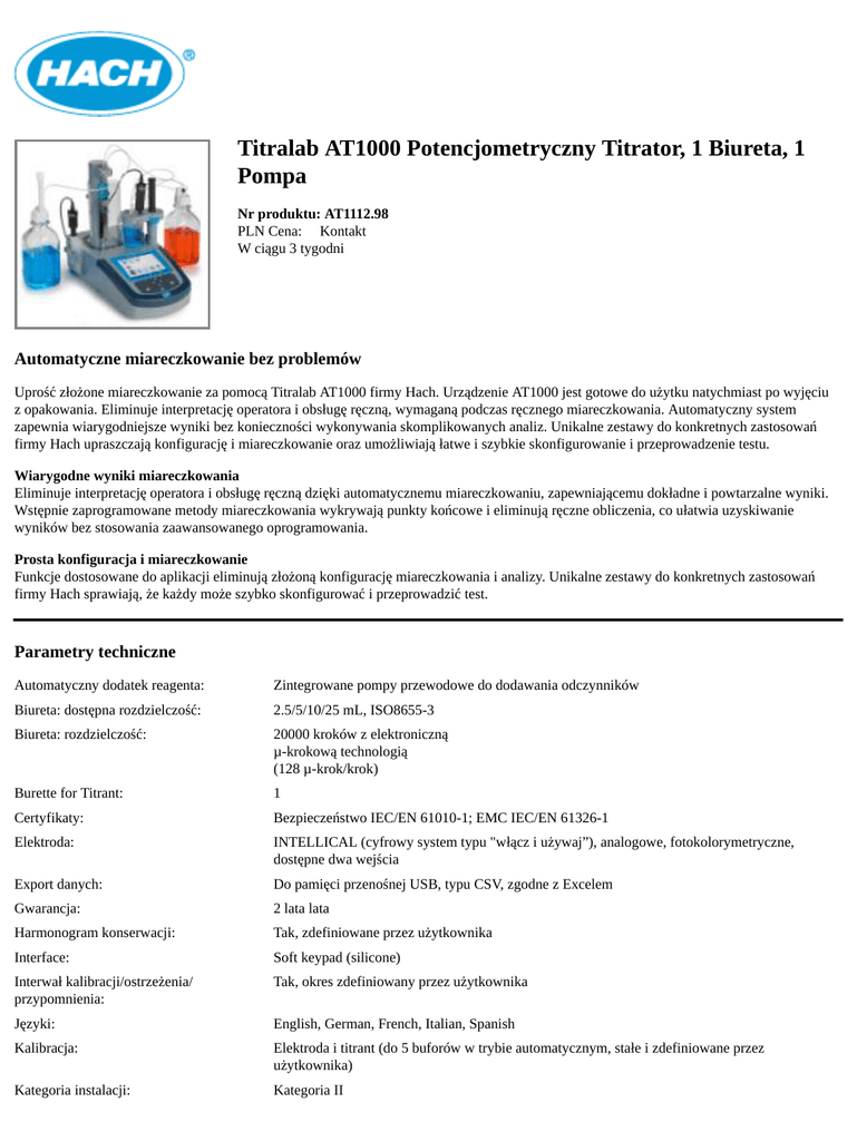 Titralab AT1000 Potencjometryczny Titrator, 1 Biureta, 1 Pompa Nr produktu: AT1112.98 PLN Cena: Kontakt W ciągu 3 tygodni Automatyczne miareczkowanie bez problemów Uprość złożone miareczkowanie za pomocą Titralab AT1000 firmy Hach. Urządzenie AT1000 jest gotowe do użytku natychmiast po wyjęciu z opakowania. Eliminuje interpretację operatora i obsługę ręczną, wymaganą podczas ręcznego miareczkowania. Automatyczny system zapewnia wiarygodniejsze wyniki bez konieczności wykonywania skomplikowanych analiz. Unikalne zestawy do konkretnych zastosowań firmy Hach upraszczają konfigurację i miareczkowanie oraz umożliwiają łatwe i szybkie skonfigurowanie i przeprowadzenie testu. Wiarygodne wyniki miareczkowania Eliminuje interpretację operatora i obsługę ręczną dzięki automatycznemu miareczkowaniu, zapewniającemu dokładne i powtarzalne wyniki. Wstępnie zaprogramowane metody miareczkowania wykrywają punkty końcowe i eliminują ręczne obliczenia, co ułatwia uzyskiwanie wyników bez stosowania zaawansowanego oprogramowania. Prosta konfiguracja i miareczkowanie Funkcje dostosowane do aplikacji eliminują złożoną konfigurację miareczkowania i analizy. Unikalne zestawy do konkretnych zastosowań firmy Hach sprawiają, że każdy może szybko skonfigurować i przeprowadzić test. Parametry techniczne Automatyczny dodatek reagenta: Zintegrowane pompy przewodowe do dodawania odczynników Biureta: dostępna rozdzielczość: 2.5/5/10/25 mL, ISO8655-3 Biureta: rozdzielczość: 20000 kroków z elektroniczną µ-krokową technologią (128 µ-krok/krok) Burette for Titrant: 1 Certyfikaty: Bezpieczeństwo IEC/EN 61010-1; EMC IEC/EN 61326-1 Elektroda: INTELLICAL (cyfrowy system typu "włącz i używaj”), analogowe, fotokolorymetryczne, dostępne dwa wejścia Export danych: Do pamięci przenośnej USB, typu CSV, zgodne z Excelem Gwarancja: 2 lata lata Harmonogram konserwacji: Tak, zdefiniowane przez użytkownika Interface: Soft keypad (silicone) Interwał kalibracji/ostrzeżenia/ przypomnienia: Tak, okres zdefiniowany przez użytkownika Języki: English, German, French, Italian, Spanish Kalibracja: Elektroda i titrant (do 5 buforów w trybie automatycznym, stałe i zdefiniowane przez użytkownika) Kategoria instalacji: Kategoria II Materiał: PP lantanowy, silikon, utwardzane szkło, polioksymetylen, stal nierdzewna Obsługiwane urządzenia peryferyjne: Drukarka, oprogramowanie komputera, waga, aparat do automatycznej wymiany próbek, klawiatura, mysz, czytnik kodów kreskowych, pompa do próbek, mieszadło śmigłowe. Ochrona hasła: Tak, chronione elementy zdefiniowane przez użytkownika Parametr: mV/pH, Conductivity, Temperature (°C or °F) Pompy: 1 Przechowywanie danych: Date, Time, Operator IDs, Sample IDs Przechowywanie danych/pamięć: Ostatnie 100 próbek, analizy QC i ślepe, 10 ostatnich kalibracji Rodzaje titratorów: Potencjometryczne (zero i przyłożony prąd), amperometryczne, kolorymetryczne Rozdzielczość: Conductivity: ±0.5 % of reading Stojak: Zintegrowane, magnetyczne mieszanie, zlewki do 250 ml Stopień zanieczyszczenia: 2 Tryb titratora: Próbka, pusta, próbka zerowa, próbka QC, próbka QC z zerową Typ wyświetlacza: 5,7-calowy wyświetlacz kolorowy; VGA Waga: 4 kg Warunki pracy: 15 - 35 °C (59 - 95 °F), 20 - 80 % RH, non-condensing Warunki przechowywania: -5 - 40 °C Wilgotność: 20 - 80 % (bez kondensacji) Wyjścia: Electrode ports (x2), USB (x2), Serial (x1), Ethernet (x1) Wymagany Pakiet Aplikacyjny: AP0003.AT1112 Ca & Mg Hardness in water AP0010.AT1112 Salt in foods Wymiary (wys. x szer. x głęb.): 220 mm x 400 mm x 360 mm Wymogi energetyczne (Hz): 50/60 Hz Wymogi energetyczne (napięcie): 100/240 VAC Wyświetlanie krzywej kalibracji: Bezpośrednie i pochodne krzywe miareczkowania, krzywa kalibracji elektrody Zaakceptowano objętość zlewek: Specjalne zlewki systemowe: polipropylenowe, 50 mL i 150 mL z zaciskami, obsługiwane zwykłe zlewki: do 250 mL, niskie, szklane. Zainstalowane procedury: Usuwanie pęcherzyków z rur, zalewanie odczynnika, wymiana biurety i pompy Zakres temperatury pracy: 15 - 35 °C (59 - 95 °F) Product details pdf footer