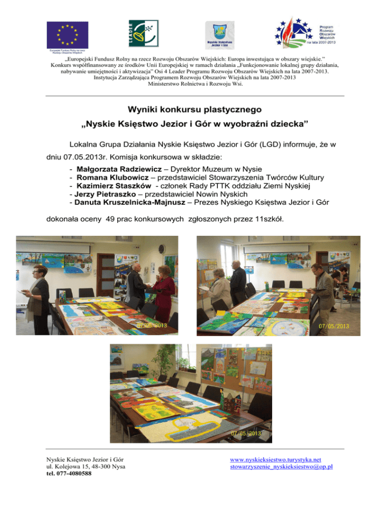 Europejski Fundusz Rolny na rzecz Rozwoju Obszarów Wiejskich „Europejski Fundusz Rolny na rzecz Rozwoju Obszarów Wiejskich: Europa inwestująca w obszary wiejskie.” Konkurs współfinansowany ze środków Unii Europejskiej w ramach działania „Funkcjonowanie lokalnej grupy działania, nabywanie umiejętności i aktywizacja” Osi 4 Leader Programu Rozwoju Obszarów Wiejskich na lata 2007-2013. Instytucja Zarządzająca Programem Rozwoju Obszarów Wiejskich na lata 2007-2013 Ministerstwo Rolnictwa i Rozwoju Wsi. Wyniki konkursu plastycznego „Nyskie Księstwo Jezior i Gór w wyobraźni dziecka” Lokalna Grupa Działania Nyskie Księstwo Jezior i Gór (LGD) informuje, że w dniu 07.05.2013r. Komisja konkursowa w składzie: - Małgorzata Radziewicz – Dyrektor Muzeum w Nysie - Romana Klubowicz – przedstawiciel Stowarzyszenia Twórców Kultury - Kazimierz Staszków - członek Rady PTTK oddziału Ziemi Nyskiej - Jerzy Pietraszko – przedstawiciel Nowin Nyskich - Danuta Kruszelnicka-Majnusz – Prezes Nyskiego Księstwa Jezior i Gór dokonała oceny 49 prac konkursowych zgłoszonych przez 11szkół. Nyskie Księstwo Jezior i Gór ul. Kolejowa 15, 48-300 Nysa tel. 077-4080588 www.nyskieksiestwo.turystyka.net [email protected] Europejski Fundusz Rolny na rzecz Rozwoju Obszarów Wiejskich „Europejski Fundusz Rolny na rzecz Rozwoju Obszarów Wiejskich: Europa inwestująca w obszary wiejskie.” Konkurs współfinansowany ze środków Unii Europejskiej w ramach działania „Funkcjonowanie lokalnej grupy działania, nabywanie umiejętności i aktywizacja” Osi 4 Leader Programu Rozwoju Obszarów Wiejskich na lata 2007-2013. Instytucja Zarządzająca Programem Rozwoju Obszarów Wiejskich na lata 2007-2013 Ministerstwo Rolnictwa i Rozwoju Wsi. Oto wyniki oceny w ramach konkursu: I miejsce Emilka Brzezińska „Pejzaż Gór Opawskich – Góra Kopa Biskupia z widokiem na miasto Głuchołazy” Publiczna Szkoła Podstawowa nr 2 im. J. Wybickiego w Głuchołazach II miejsce Paweł Grabowy „Fontanna Trytona” Zespół Szkolno-Przedszkolny w Niwnicy III miejsce Jakub Opałka – „Lato w Nysie” Szkoła Podstawowa nr 1 w Nysie im. Kawalerów Orderu Uśmiechu Nyskie Księstwo Jezior i Gór ul. Kolejowa 15, 48-300 Nysa tel. 077-4080588 www.nyskieksiestwo.turystyka.net [email protected] Europejski Fundusz Rolny na rzecz Rozwoju Obszarów Wiejskich „Europejski Fundusz Rolny na rzecz Rozwoju Obszarów Wiejskich: Europa inwestująca w obszary wiejskie.” Konkurs współfinansowany ze środków Unii Europejskiej w ramach działania „Funkcjonowanie lokalnej grupy działania, nabywanie umiejętności i aktywizacja” Osi 4 Leader Programu Rozwoju Obszarów Wiejskich na lata 2007-2013. Instytucja Zarządzająca Programem Rozwoju Obszarów Wiejskich na lata 2007-2013 Ministerstwo Rolnictwa i Rozwoju Wsi. Ponadto Komisja konkursowa przyznała wyróżnienie dla: Adama Zalewskiego „Nasze miasto Nysa” Zespół Szkół Sportowych w Nysie GRATULUJEMY laureatom, a wszystkim uczestnikom dziękujemy za udział i trud włożony w przygotowanie prac. Nyskie Księstwo Jezior i Gór ul. Kolejowa 15, 48-300 Nysa tel. 077-4080588 www.nyskieksiestwo.turystyka.net [email protected]