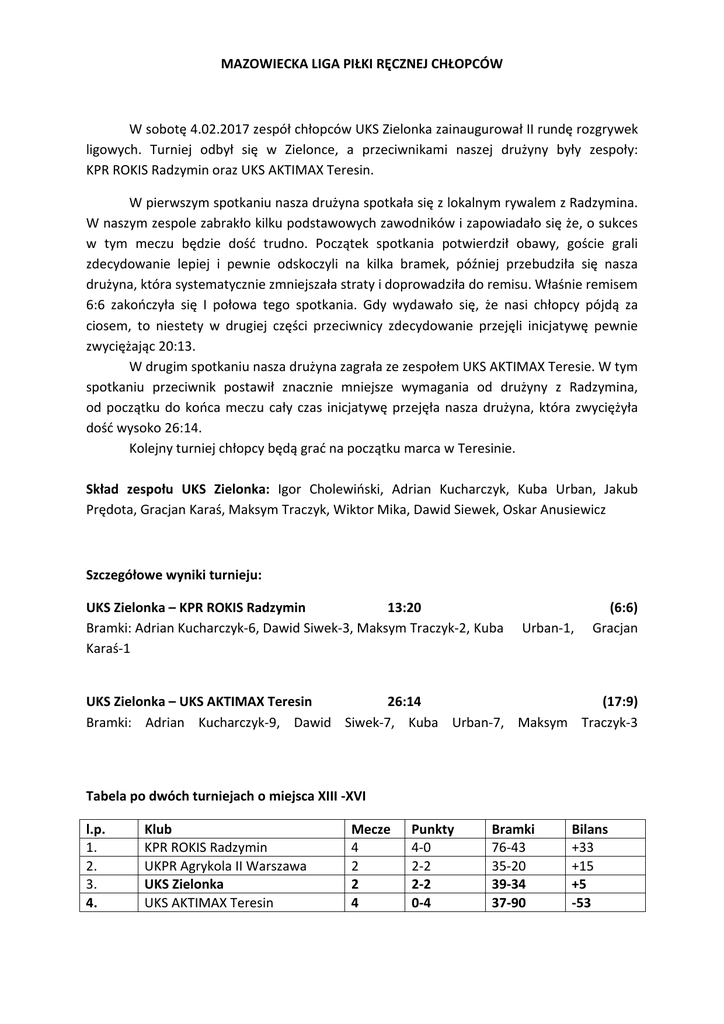 MAZOWIECKA LIGA PIŁKI RĘCZNEJ CHŁOPCÓW W sobotę 4.02.2017 zespół chłopców UKS Zielonka zainaugurował II rundę rozgrywek ligowych. Turniej odbył się w Zielonce, a przeciwnikami naszej drużyny były zespoły: KPR ROKIS Radzymin oraz UKS AKTIMAX Teresin. W pierwszym spotkaniu nasza drużyna spotkała się z lokalnym rywalem z Radzymina. W naszym zespole zabrakło kilku podstawowych zawodników i zapowiadało się że, o sukces w tym meczu będzie dość trudno. Początek spotkania potwierdził obawy, goście grali zdecydowanie lepiej i pewnie odskoczyli na kilka bramek, później przebudziła się nasza drużyna, która systematycznie zmniejszała straty i doprowadziła do remisu. Właśnie remisem 6:6 zakończyła się I połowa tego spotkania. Gdy wydawało się, że nasi chłopcy pójdą za ciosem, to niestety w drugiej części przeciwnicy zdecydowanie przejęli inicjatywę pewnie zwyciężając 20:13. W drugim spotkaniu nasza drużyna zagrała ze zespołem UKS AKTIMAX Teresie. W tym spotkaniu przeciwnik postawił znacznie mniejsze wymagania od drużyny z Radzymina, od początku do końca meczu cały czas inicjatywę przejęła nasza drużyna, która zwyciężyła dość wysoko 26:14. Kolejny turniej chłopcy będą grać na początku marca w Teresinie. Skład zespołu UKS Zielonka: Igor Cholewiński, Adrian Kucharczyk, Kuba Urban, Jakub Prędota, Gracjan Karaś, Maksym Traczyk, Wiktor Mika, Dawid Siewek, Oskar Anusiewicz Szczegółowe wyniki turnieju: UKS Zielonka – KPR ROKIS Radzymin 13:20 Bramki: Adrian Kucharczyk-6, Dawid Siwek-3, Maksym Traczyk-2, Kuba Karaś-1 Urban-1, (6:6) Gracjan UKS Zielonka – UKS AKTIMAX Teresin 26:14 (17:9) Bramki: Adrian Kucharczyk-9, Dawid Siwek-7, Kuba Urban-7, Maksym Traczyk-3 Tabela po dwóch turniejach o miejsca XIII -XVI l.p. 1. 2. 3. 4. Klub KPR ROKIS Radzymin UKPR Agrykola II Warszawa UKS Zielonka UKS AKTIMAX Teresin Mecze 4 2 2 4 Punkty 4-0 2-2 2-2 0-4 Bramki 76-43 35-20 39-34 37-90 Bilans +33 +15 +5 -53