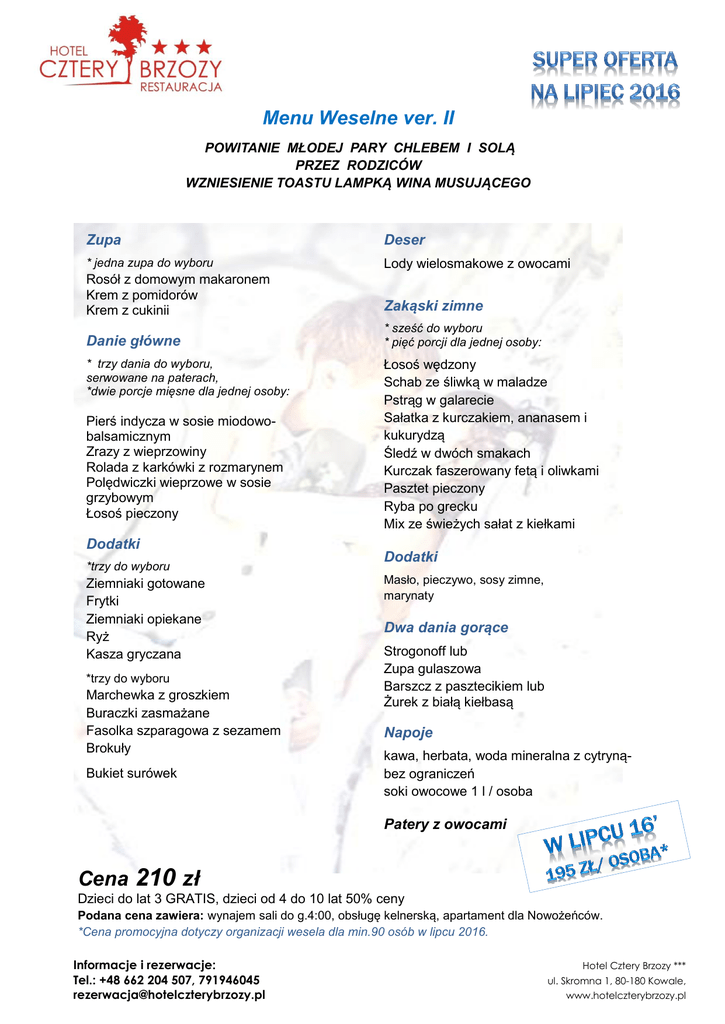 Menu Weselne ver. II POWITANIE MŁODEJ PARY CHLEBEM I SOLĄ PRZEZ RODZICÓW WZNIESIENIE TOASTU LAMPKĄ WINA MUSUJĄCEGO Zupa Deser * jedna zupa do wyboru Lody wielosmakowe z owocami Rosół z domowym makaronem Krem z pomidorów Krem z cukinii Zakąski zimne Danie główne * sześć do wyboru * pięć porcji dla jednej osoby: * trzy dania do wyboru, serwowane na paterach, *dwie porcje mięsne dla jednej osoby: Pierś indycza w sosie miodowobalsamicznym Zrazy z wieprzowiny Rolada z karkówki z rozmarynem Polędwiczki wieprzowe w sosie grzybowym Łosoś pieczony Dodatki *trzy do wyboru Ziemniaki gotowane Frytki Ziemniaki opiekane Ryż Kasza gryczana *trzy do wyboru Marchewka z groszkiem Buraczki zasmażane Fasolka szparagowa z sezamem Brokuły Bukiet surówek Łosoś wędzony Schab ze śliwką w maladze Pstrąg w galarecie Sałatka z kurczakiem, ananasem i kukurydzą Śledź w dwóch smakach Kurczak faszerowany fetą i oliwkami Pasztet pieczony Ryba po grecku Mix ze świeżych sałat z kiełkami Dodatki Masło, pieczywo, sosy zimne, marynaty Dwa dania gorące Strogonoff lub Zupa gulaszowa Barszcz z pasztecikiem lub Żurek z białą kiełbasą Napoje kawa, herbata, woda mineralna z cytrynąbez ograniczeń soki owocowe 1 l / osoba Patery z owocami Cena 210 zł Dzieci do lat 3 GRATIS, dzieci od 4 do 10 lat 50% ceny Podana cena zawiera: wynajem sali do g.4:00, obsługę kelnerską, apartament dla Nowożeńców. *Cena promocyjna dotyczy organizacji wesela dla min.90 osób w lipcu 2016. Informacje i rezerwacje: Tel.: +48 662 204 507, 791946045 [email protected] Hotel Cztery Brzozy *** ul. Skromna 1, 80-180 Kowale, www.hotelczterybrzozy.pl Dodatkowo proponujemy : Ciasta domowe – 15 zł/osoba Tort /smaki do wyboru/ - 15 zł/ osoba Stół wiejski - ok. 10 kg –1300 zł Prosie – na ok. 40 osób – 900 zł Dzik – na ok. 80 osób – 1500 zł Noclegi – pokój 2-osobowy – od 180 zł Pokrowce na krzesła – 9 zł/ 1 szt. Kokardy na krzesła – 4 zł/ 1 szt. Obsługa barmańska + pokaz (ok.20min.) – od 1700 zł Zapraszamy do Hotelu na spotkanie. Informacje i rezerwacje: Tel.: +48 662 204 507, 791946045 [email protected] Hotel Cztery Brzozy *** ul. Skromna 1, 80-180 Kowale, www.hotelczterybrzozy.pl