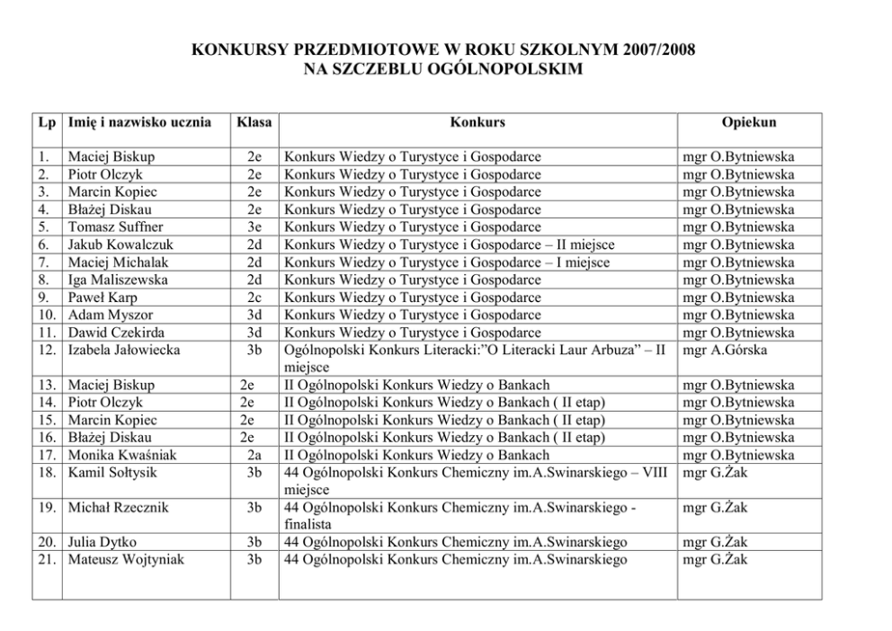 KONKURSY PRZEDMIOTOWE W ROKU SZKOLNYM 2007/2008 NA SZCZEBLU OGÓLNOPOLSKIM Lp Imię i nazwisko ucznia Klasa Konkurs Konkurs Wiedzy o Turystyce i Gospodarce Konkurs Wiedzy o Turystyce i Gospodarce Konkurs Wiedzy o Turystyce i Gospodarce Konkurs Wiedzy o Turystyce i Gospodarce Konkurs Wiedzy o Turystyce i Gospodarce Konkurs Wiedzy o Turystyce i Gospodarce – II miejsce Konkurs Wiedzy o Turystyce i Gospodarce – I miejsce Konkurs Wiedzy o Turystyce i Gospodarce Konkurs Wiedzy o Turystyce i Gospodarce Konkurs Wiedzy o Turystyce i Gospodarce Konkurs Wiedzy o Turystyce i Gospodarce Ogólnopolski Konkurs Literacki:”O Literacki Laur Arbuza” – II miejsce II Ogólnopolski Konkurs Wiedzy o Bankach II Ogólnopolski Konkurs Wiedzy o Bankach ( II etap) II Ogólnopolski Konkurs Wiedzy o Bankach ( II etap) II Ogólnopolski Konkurs Wiedzy o Bankach ( II etap) II Ogólnopolski Konkurs Wiedzy o Bankach 44 Ogólnopolski Konkurs Chemiczny im.A.Swinarskiego – VIII miejsce 44 Ogólnopolski Konkurs Chemiczny im.A.Swinarskiego finalista 44 Ogólnopolski Konkurs Chemiczny im.A.Swinarskiego 44 Ogólnopolski Konkurs Chemiczny im.A.Swinarskiego 1. 2. 3. 4. 5. 6. 7. 8. 9. 10. 11. 12. Maciej Biskup Piotr Olczyk Marcin Kopiec Błażej Diskau Tomasz Suffner Jakub Kowalczuk Maciej Michalak Iga Maliszewska Paweł Karp Adam Myszor Dawid Czekirda Izabela Jałowiecka 2e 2e 2e 2e 3e 2d 2d 2d 2c 3d 3d 3b 13. 14. 15. 16. 17. 18. Maciej Biskup Piotr Olczyk Marcin Kopiec Błażej Diskau Monika Kwaśniak Kamil Sołtysik 2e 2e 2e 2e 2a 3b 19. Michał Rzecznik 3b 20. Julia Dytko 21. Mateusz Wojtyniak 3b 3b Opiekun mgr O.Bytniewska mgr O.Bytniewska mgr O.Bytniewska mgr O.Bytniewska mgr O.Bytniewska mgr O.Bytniewska mgr O.Bytniewska mgr O.Bytniewska mgr O.Bytniewska mgr O.Bytniewska mgr O.Bytniewska mgr A.Górska mgr O.Bytniewska mgr O.Bytniewska mgr O.Bytniewska mgr O.Bytniewska mgr O.Bytniewska mgr G.Żak mgr G.Żak mgr G.Żak mgr G.Żak 22. Mateusz Kozielski 2c 23. Sołtysik Kozielski, Rzecznik 24. Mateusz Pleśniak 25. Zespół klasy 2c i 3e 26. Kamil Sołtysik 3b 27. Michał Rzecznik 3b 28. Julia Dytko 29. Mateusz Wojtyniak 30. Mateusz Kozielski 3b 3b 2c 31. Michał Rzecznik 32. Mateusz Kozielski 3b 2c 33. Michał Rzecznik 3b 34. Mateusz Kozielski 2c 35. Mikołaj Kostuś 1f 36. Marek Bacler 1f 37. Agnieszka Stempniewicz 1f 38. Martyna Rogowiec 1f 39. Magdalena Paluch 1f 2b 44 Ogólnopolski Konkurs Chemiczny im.A.Swinarskiego –VIII miejsce 44 Ogólnopolski Konkurs Chemiczny im.A.Swinarskiego – II miejsce w klasyfikacji drużynowej 44 Ogólnopolski Konkurs Chemiczny im.A.Swinarskiego Szkolna Internetowa Gra Giełdowa II Ogólnopolski Konkurs Chemiczny Uniwersytetu Śląskiego finalista II Ogólnopolski Konkurs Chemiczny Uniwersytetu Śląskiego laureat II Ogólnopolski Konkurs Chemiczny Uniwersytetu Śląskiego II Ogólnopolski Konkurs Chemiczny Uniwersytetu Śląskiego II Ogólnopolski Konkurs Chemiczny Uniwersytetu Śląskiego finalista Ogólnopolski Konkurs Politechniki Śląskiej - finalista Ogólnopolski Konkurs Politechniki Śląskiej – IX miejsce (laureat) II Ogólnopolska Olimpiada o Diamentowy Indeks AGH finalista II Ogólnopolska Olimpiada o Diamentowy Indeks AGH finalista Konkurs Fotograficzny „Najpiękniejsze okazy przyrodnicze w mojej miejscowości” – II miejsce Konkurs Fotograficzny „Najpiękniejsze okazy przyrodnicze w mojej miejscowości” – III miejsce Konkurs Fotograficzny „Najpiękniejsze okazy przyrodnicze w mojej miejscowości” – wyróżnienie Konkurs Fotograficzny „Najpiękniejsze okazy przyrodnicze w mojej miejscowości” – wyróżnienie Ogólnopolski Konkurs Ekologiczny „Ekoplaneta” – I miejsce (konkurs wiedzy) mgr G.Żak mgr G.Żak mgr M.Gałkiewicz mgr O.Bytniewska mgr G.Żak mgr G.Żak mgr G.Żak mgr G.Żak mgr G.Żak mgr G.Żak mgr G.Żak mgr G.Żak mgr G.Żak mgr J.Koloch mgr J.Koloch mgr J.Koloch mgr J.Koloch mgr J.Koloch 40. Elżbieta Jurczyńska 2c 41. Agnieszka Stempniewicz 1f 42. Ewa Szymańska 1f 43. Michał Rzecznik 3b 44. 45. 46. 47. 48. 2c 2e 2e 2c 2c Marta Wilczuk Marcin Kopiec Piotr Olczyk Agnieszka Winczowska Michał Słomiany 49. Michał Kwieciński 2c 50. Mateusz Maciąg 3c 51. Kamil Gala 3c 52. Robert Krusiński 1c 53. Maciej Osswald 1c 54. Dawid Dominiak 55. Przemysław Pela 56. Aleksandra Groborz Iga Maliszewska Jan Maciejewski Paweł Pawłowski 57. Alina Rakoczy 58. Aleksandra Słapik 1c 1c 2d 2c 2c Ogólnopolski Konkurs Ekologiczny „Ekoplaneta” – II miejsce na pracę indywidualną Ogólnopolski Konkurs Ekologiczny „Ekoplaneta” – wyróżnienie za pracę indywidualną Ogólnopolski Konkurs Ekologiczny „Ekoplaneta” – wyróżnienie za pracę indywidualną XIV Ogólnopolski Konkurs Politechniki Warszawskiej finalista IV Olimpiada Przedsiębiorczości IV Olimpiada Przedsiębiorczości IV Olimpiada Przedsiębiorczości II Ogólnopolska Olimpiada o Diamentowy Indeks AGH (II etap) Międzynarodowy Konkurs Matematyczny „Kangur 2008” – nagroda II stopnia, 26 miejsce w okręgu) Międzynarodowy Konkurs Matematyczny „Kangur 2008” – nagroda II stopnia, 49 miejsce w okręgu) Międzynarodowy Konkurs Matematyczny „Kangur 2008” – nagroda I stopnia, 8 miejsce w okręgu) Międzynarodowy Konkurs Matematyczny „Kangur 2008” – nagroda I stopnia, 7 miejsce w okręgu) Międzynarodowy Konkurs Matematyczny „Kangur 2008” – nagroda I stopnia, 6 miejsce w okręgu) Międzynarodowy Konkurs Matematyczny „Kangur 2008” – nagroda I stopnia, 8 miejsce w okręgu) Internetowy konkurs Matematyczny MATMIX.pl - wyróżnienie Internetowy konkurs Matematyczny MATMIX.pl - wyróżnienie XXIX Zjazd Szkół Mickiewiczowskich – konkurs na spektakl inspirowany twórczością Mickiewicza – I miejsce Polsko-Ukraiński Konkurs Fizyczny „Lwiątko” Polsko-Ukraiński Konkurs Fizyczny „Lwiątko” mgr J.Koloch mgr J.Koloch mgr J.Koloch mgr G.Żak mgr O.Bytniewska mgr O.Bytniewska mgr O.Bytniewska mgr O.Bytniewska mgr B.Czuczeło mgr B.Cz