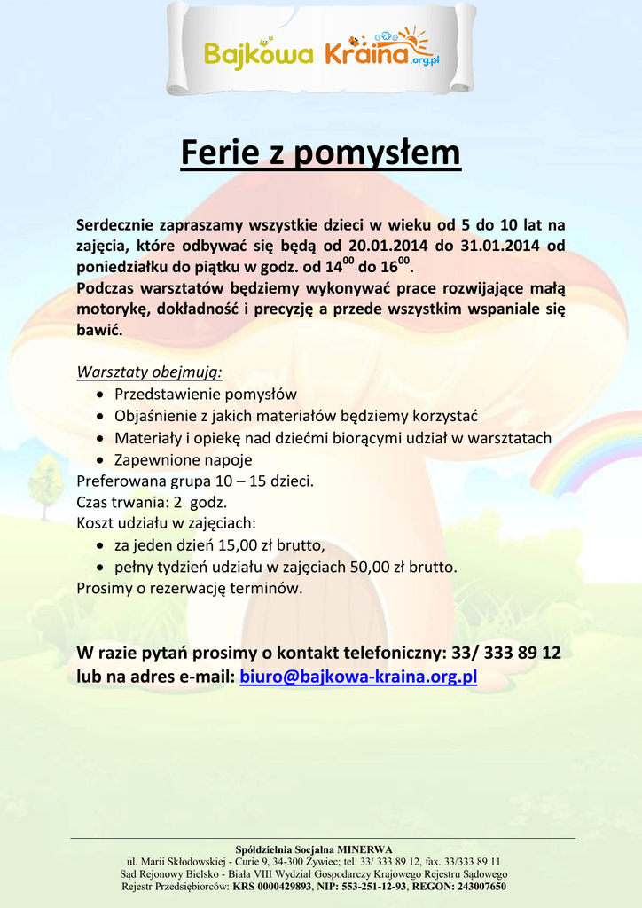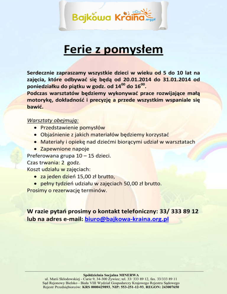 Ferie z pomysłem Serdecznie zapraszamy wszystkie dzieci w wieku od 5 do 10 lat na zajęcia, które odbywać się będą od 20.01.2014 do 31.01.2014 od poniedziałku do piątku w godz. od 1400 do 1600. Podczas warsztatów będziemy wykonywać prace rozwijające małą motorykę, dokładność i precyzję a przede wszystkim wspaniale się bawić. Warsztaty obejmują: Przedstawienie pomysłów Objaśnienie z jakich materiałów będziemy korzystać Materiały i opiekę nad dziećmi biorącymi udział w warsztatach Zapewnione napoje Preferowana grupa 10 – 15 dzieci. Czas trwania: 2 godz. Koszt udziału w zajęciach: za jeden dzień 15,00 zł brutto, pełny tydzień udziału w zajęciach 50,00 zł brutto. Prosimy o rezerwację terminów. W razie pytań prosimy o kontakt telefoniczny: 33/ 333 89 12 lub na adres e-mail: [email protected] Spółdzielnia Socjalna MINERWA ul. Marii Skłodowskiej - Curie 9, 34-300 Żywiec; tel. 33/ 333 89 12, fax. 33/333 89 11 Sąd Rejonowy Bielsko - Biała VIII Wydział Gospodarczy Krajowego Rejestru Sądowego Rejestr Przedsiębiorców: KRS 0000429893, NIP: 553-251-12-93, REGON: 243007650 Szczegółowy plan zajęć: 20.01.2013 poniedziałek Zaczynamy wykonywać wazon z papier mache 21.01.2013 wtorek Przygotowujemy wiklinę papierową i rozpoczynamy wykonywanie z niej koszyka. 22.01.2013 środa Kończymy nasze kosze i wykonujemy do nich kwiaty. 23.01.2013 czwartek Technika decoupage – wykonujemy ramki na własne zdjęcie (prosimy o przyniesienie na zajęcia fotografii dziecka) 24.01.2013 piątek Wykonujemy podstawy oraz szyjki wazonu z papier mache oraz zapoznajemy się z techniką origami. 27.01.2013 poniedziałek Kończymy nasz wazon z papier mache. 28.01.2013 wtorek Wykonujemy miecze rycerzy, korony księżniczek, czapki wróżek, korale i inne elementy do przebrania na bal karnawałowy. 29.01.2013 środa Przygotowujemy dekoracje na Magiczny Bal karnawałowy. 30.01.2013 czwartek Przygotowujemy kruche ciasteczka i galaretki z owocami na Magiczny Bal karnawałowy 30.01.2013 piątek Wszystkie księżniczki, wróżki, pszczółki, rycerze, super bohaterowie i inne magiczne postaci przybywają na bal. Spółdzielnia Socjalna MINERWA ul. Marii Curie – Skłodowskiej 9, 34-300 Żywiec; tel. 33/ 333 89 12, fax. 33/333 89 11 Sąd Rejonowy Bielsko - Biała VIII Wydział Gospodarczy Krajowego Rejestru Sądowego Rejestr Przedsiębiorców: KRS 0000429893, NIP: 553-251-12-93, REGON: 243007650 2