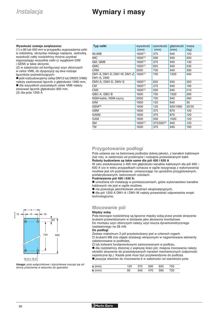 Wymiary i masy Instalacja WysokoÊç zostaje zwi´kszona: (1) o 90 lub 450 mm w przypadku wyposa˝enia celki w oddzielnà skrzynk´ niskiego napi´cia. Jednolità wysokoÊç ca∏ej rozdzielnicy mo˝na uzyskaç wyposa˝ajàc wszystkie celki (z wyjàtkiem GIM i GEM) w takie skrzynki. (2) w zale˝noÊci od konfiguracji szyn zbiorczych w celce VM6, do dyspozycji sà dwa rodzaje ∏àczników poÊredniczàcych: jeÊli rozbudowujemy celk´ DM12 lub DM23 (VM6) nale˝y zastosowaç ∏àcznik o g∏´bokoÊci 1060 mm; dla wszystkich pozosta∏ych celek VM6 nale˝y stosowaç ∏àcznik g∏´bokoÊci 920 mm. (3) dla pola 1250 A Typ celki wysokoÊç (mm) IM,IMB 1600(1) IMC 1600(1) QM, QMB 1600(1) QMC 1600(1) CRM 2050 DM1-A, DM1-D, DM1-W, DM1-Z, 1600(1) DM1-S, DM2 DMV-A, DMV-D, DMV-S 1600(1) CM 1600(1) CM2 1600(1) GBC-A, GBC-B 1600 NSM-kable, NSM-szyny 2050 GIM 1600 GEM(2) 1600 GBM 1600 GAM2 1600 GAM 1600 SM 1600(1) TM 1600 szerokoÊç (mm) 375 500 375 625 750 750 g∏´bokoÊç (mm) 940 940 940 940 940 1220 masa (kg) 120 200 130 230 390 400 625 375 500 750 750 125 125 375 375 500 375/500(3) 375 940 940 940 1020 940 840 920/1060 870 870 1020 940 940 320 190 210 290 260 30 30/35 120 120 120 120 190 Przygotowanie pod∏ogi Pola ustawia si´ na betonowej pod∏odze dobrej jakoÊci, z kana∏em kablowym (lub nie), w zale˝noÊci od przekrojów i rodzajów przewidzianych kabli. Roboty budowlane sà takie same dla pól 400 i 630 A W celu zredukowania o 400 mm g∏´bokoÊci kana∏ów kablowych dla pól 400 – 630 A (co w wielu przypadkach oznacza w ogóle rezygnacj´ z wykonywania) mo˝liwe jest ich podniesienie umieszczajàc na uprzednio przygotowanych, prefabrykowanych, betonowych coko∏ach. Podniesienie pól 400 i 630 A: umo˝liwia ich instalacj´ w pomieszczeniach, gdzie wykonawstwo kana∏ów kablowych nie jest w ogóle mo˝liwe, nie powoduje jakichkolwiek utrudnieƒ eksploatacyjnych, dla pól 1250 A DM1-A i DM1-W nale˝y przewidzieç odpowiednie wn´ki technologiczne. Mocowanie pól MT55108 a 15 b 15 50 740 840 12.3 x 12.3 Uwaga: pola wy∏àcznikowe i stycznikowe mocuje si´ od strony przeciwnej w stosunku do aparatów. 60 Mi´dzy sobà Pola tworzàce rozdzielnic´ sà ∏àczone mi´dzy sobà przez proste skr´cenie Êrubami przewidzianymi w dostawie jako akcesoria monta˝owe. Do monta˝u szyn zbiorczych nale˝y u˝yç klucza dynamometrycznego nastawionego na 28 mN. Do pod∏ogi Zestaw maksimum 3 pól przytwierdzany jest w czterech rogach Êrubami M8 (nie obj´te dostawà) wkr´conymi w nagwintowane elementy zabetonowane w pod∏odze, lub kotwami fundamentowymi zamocowanymi w pod∏o˝u. dla rozdzielnicy z∏o˝onej z wi´kszej iloÊci pól, miejsca mocowania nale˝y okreÊliç stosownie do przewidywanych nara˝eƒ mechanicznych (odpornoÊç sejsmiczna itp.). Ka˝de pole musi byç przytwierdzone do pod∏o˝a. pozycja otworów do mocowania b w zale˝noÊci od szerokoÊci pola: a (mm) b (mm) 125 95 375 345 500 470 625 595 750 720
